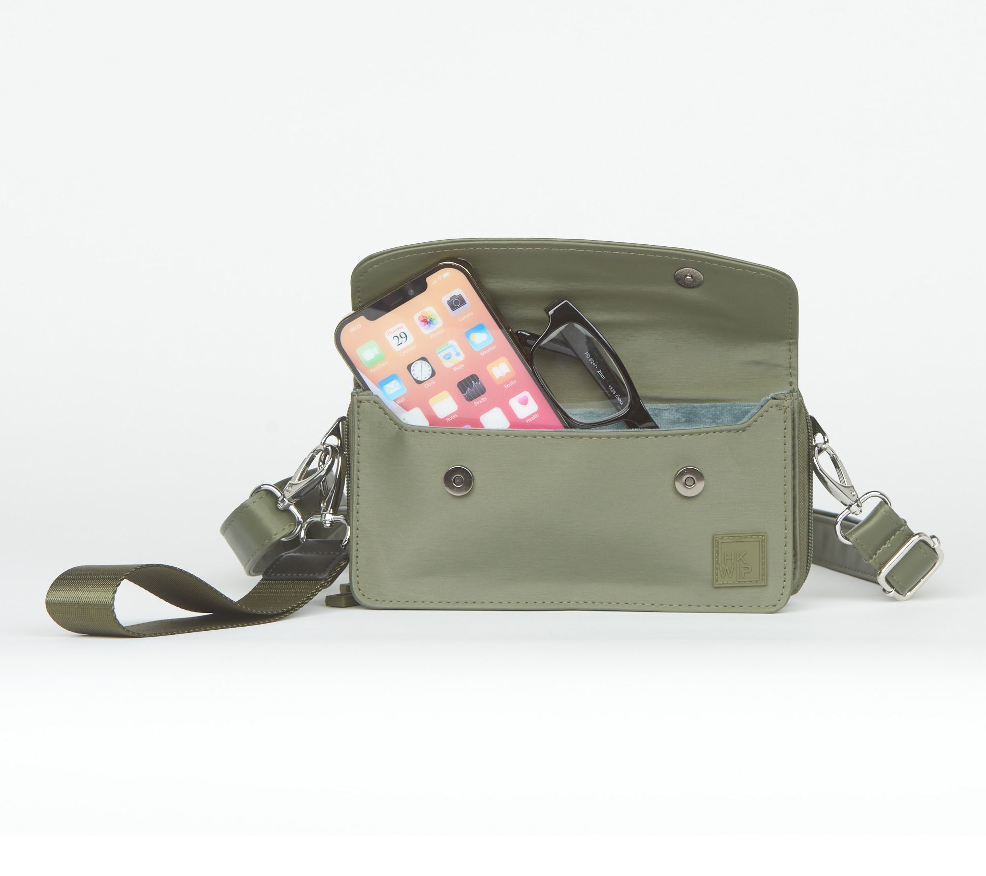 • Two zip compartments with gusseted sides, removable wrist strap, two rear belt loops, front snap closure cellphone pocket, adjustable/removable crossbody strap, water-resistant/water-repellent exterior, rear zip pocket