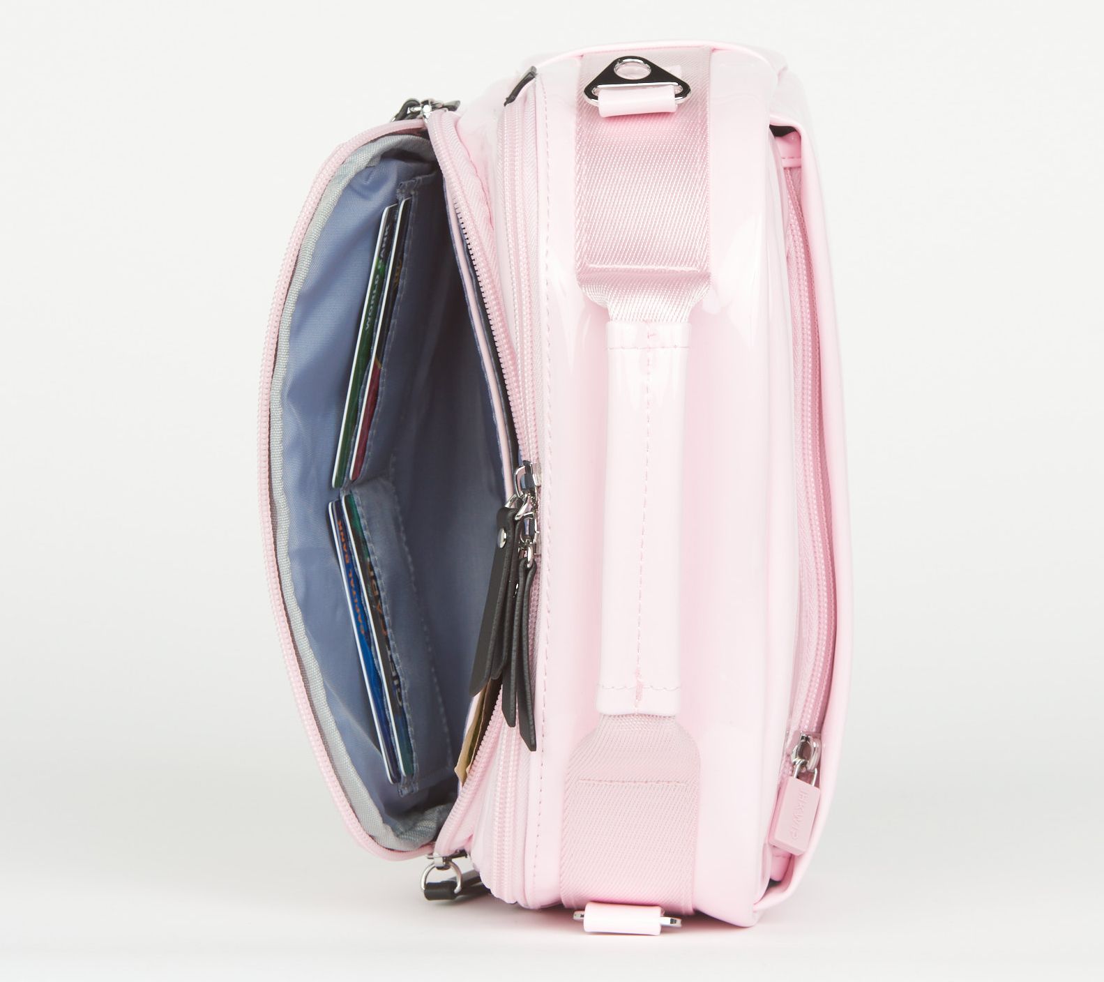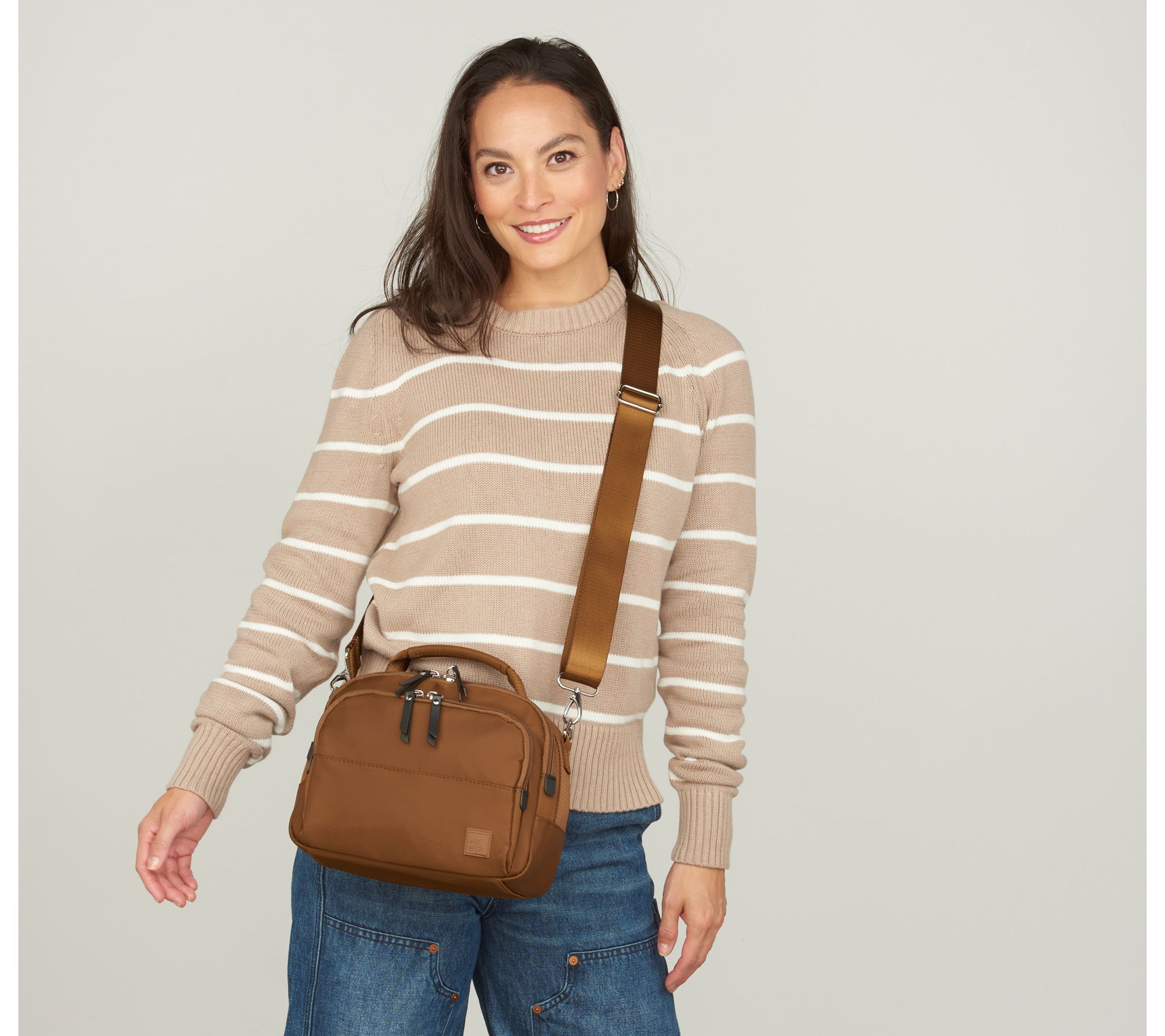 • Water-repellent outer shell, removable/adjustable crossbody strap, top handle, front dual-zip pocket with built-in RFID wallet with card slots and bill sleeve, rear soft-lined cell phone/glasses zip pocket