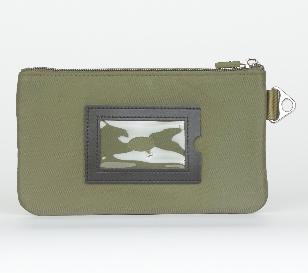 • Main zip closure, clear-view ID window, removable wristlet strap