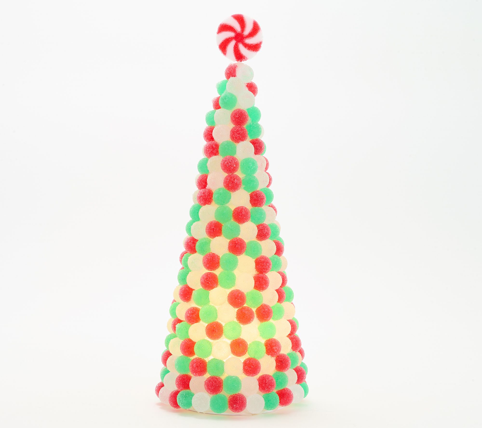 • Illuminated cone-shaped tree covered in faux gumdrops and topped with a peppermint candy