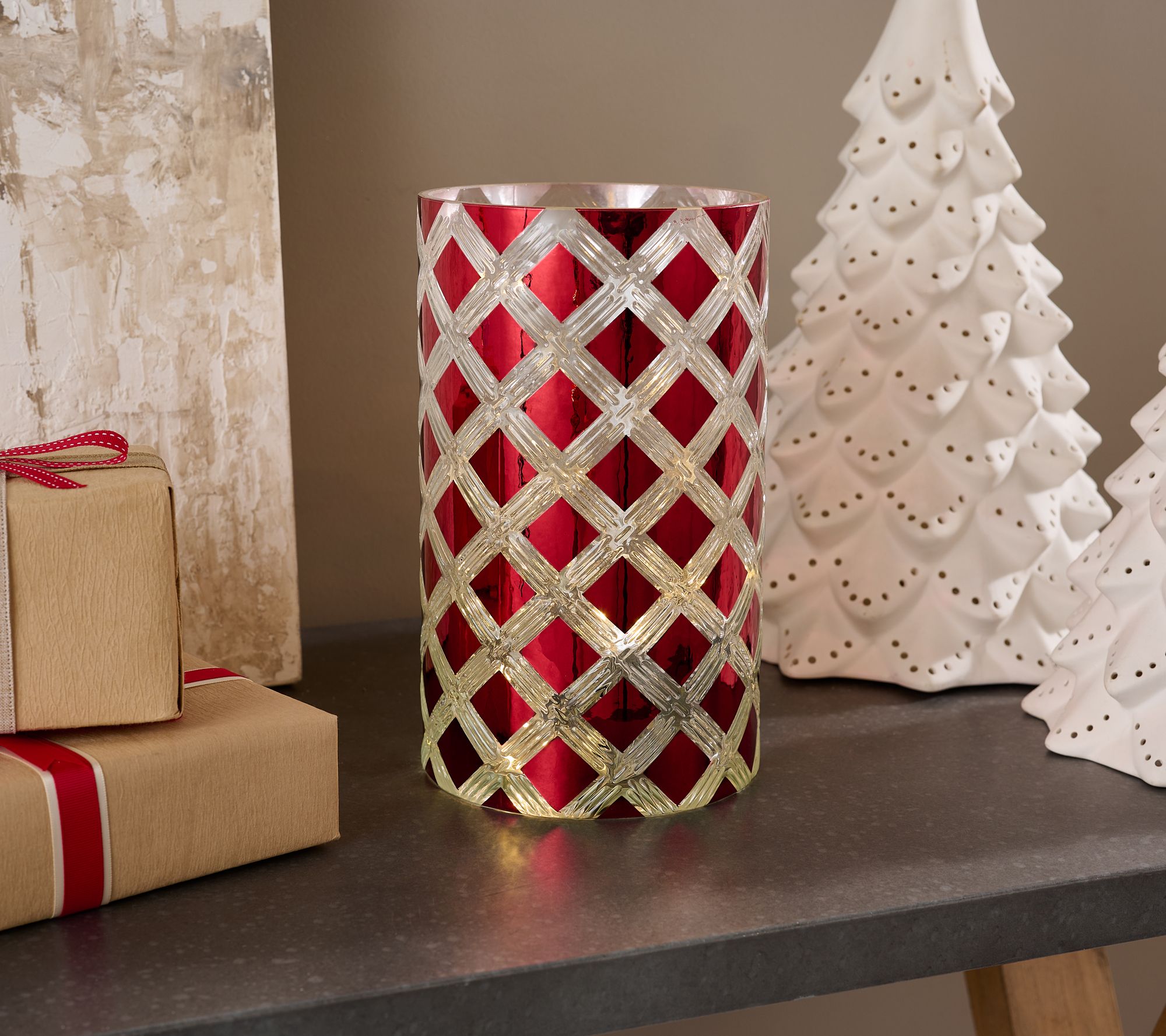 Highlight your holiday decor with an ethereal glow when you add this stunning hurricane to your display. Illuminating from within with a microlight strand, it sets the mood for a festive holiday season. From the Valerie Parr Hill Collection.