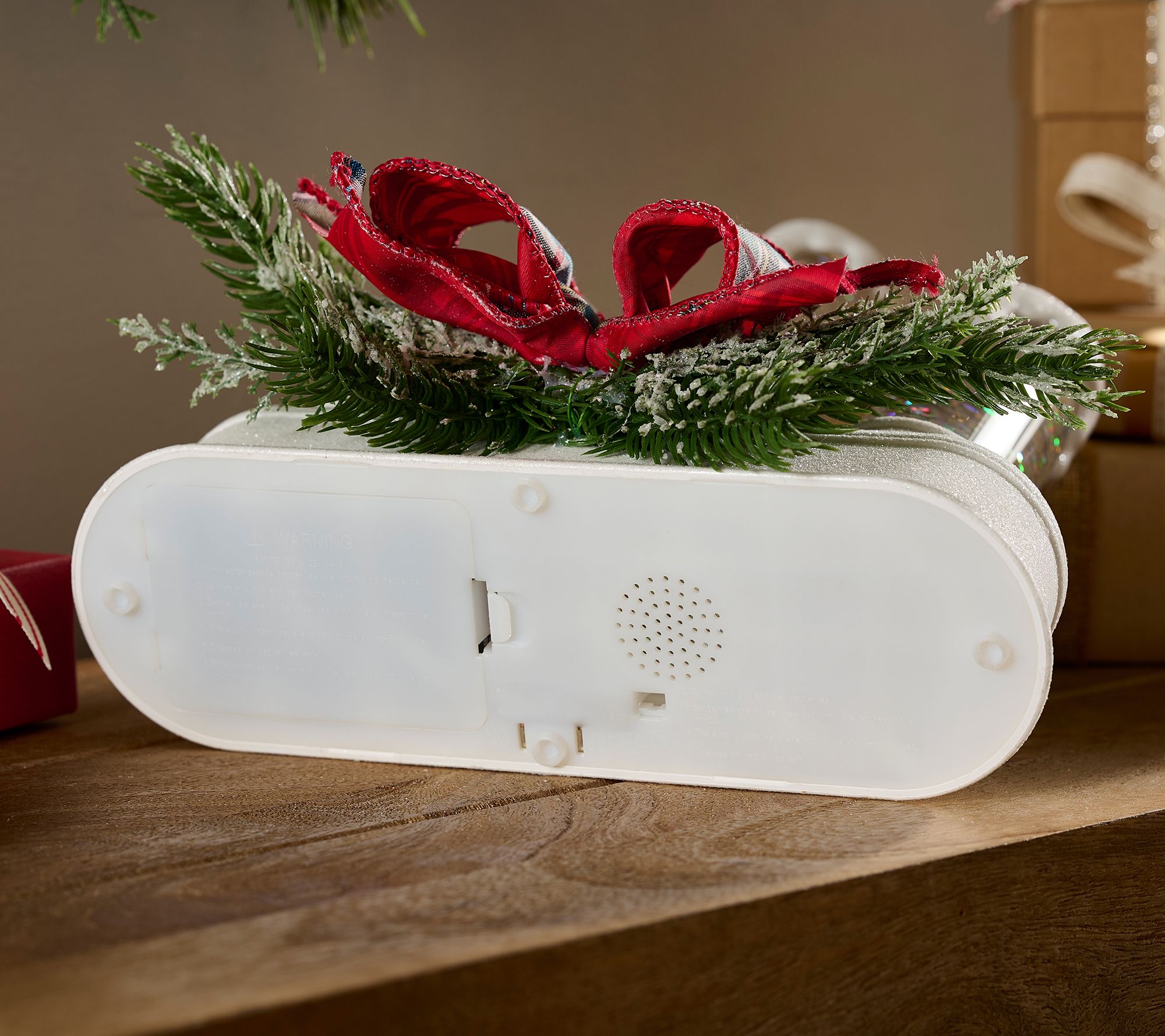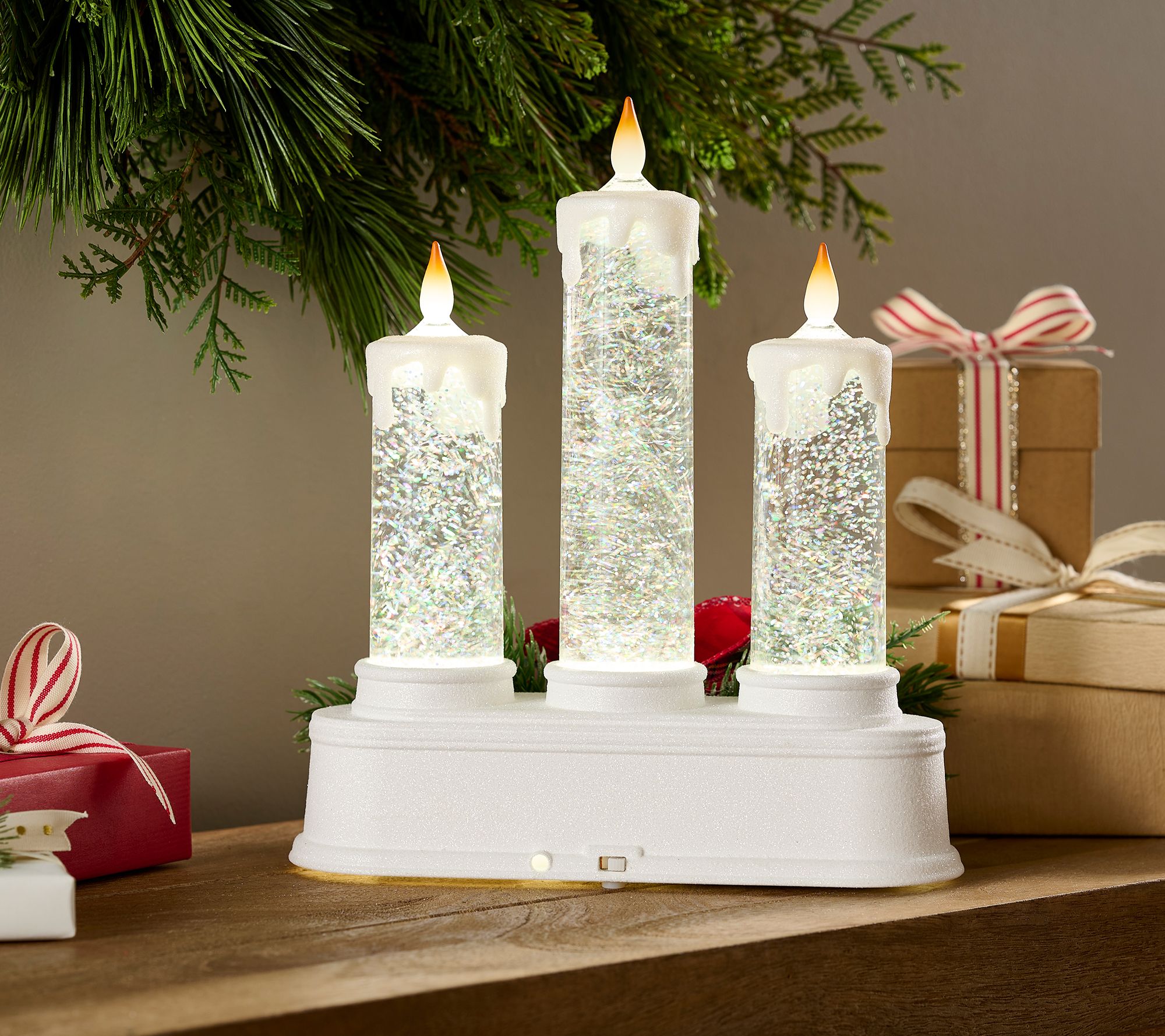 Light up the night with this glittered holiday centerpiece. Three taper candles emit a soft glow with plenty of sparkle to set a festive mood. From the Valerie Parr Hill Collection.