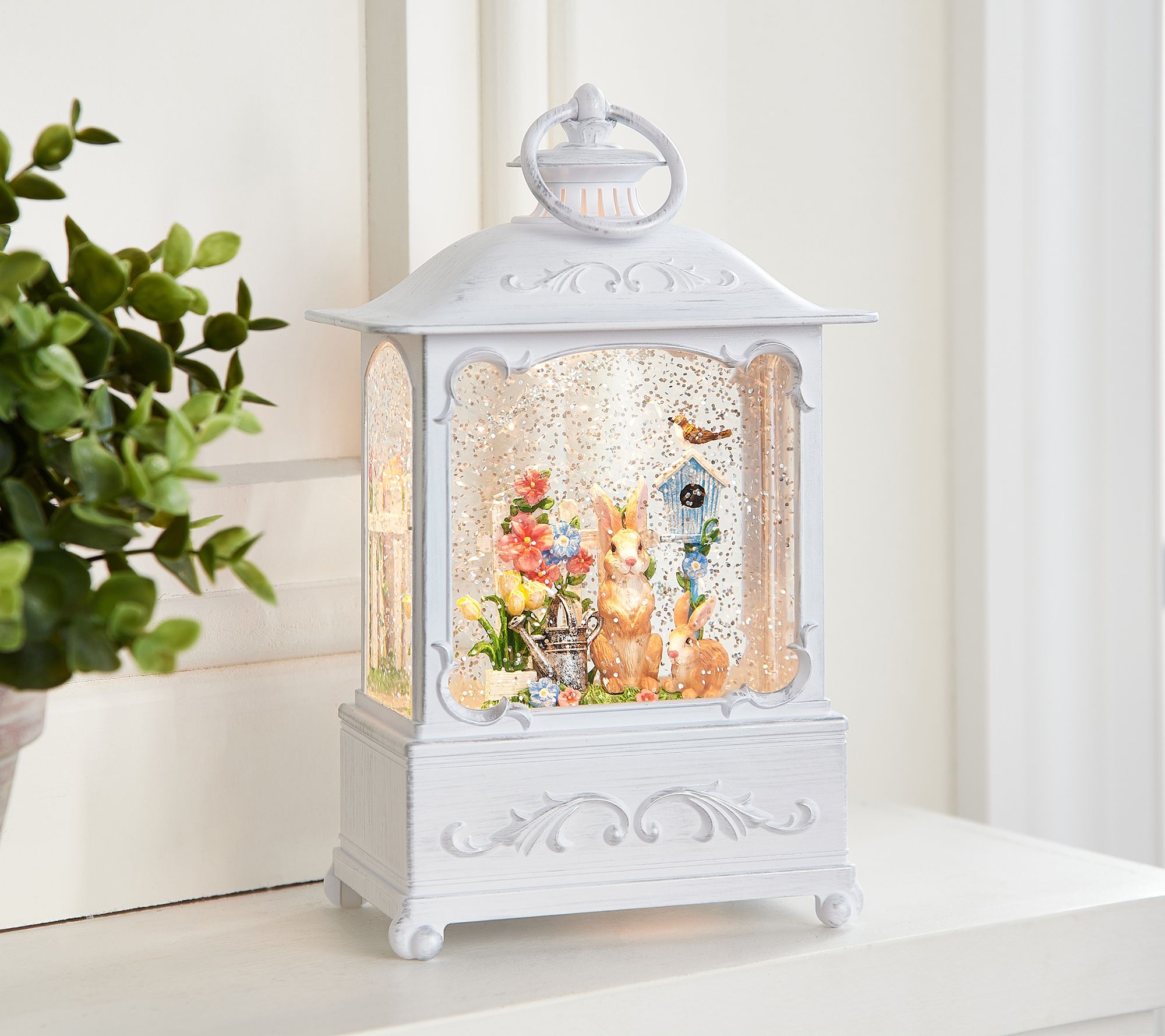 A 3D springtime scene surrounded by swirls of glitter illuminates within this vintage-like lantern. Display it on a shelf or mantel and wow your guests with its beauty. From the Valerie Parr Hill Collection.