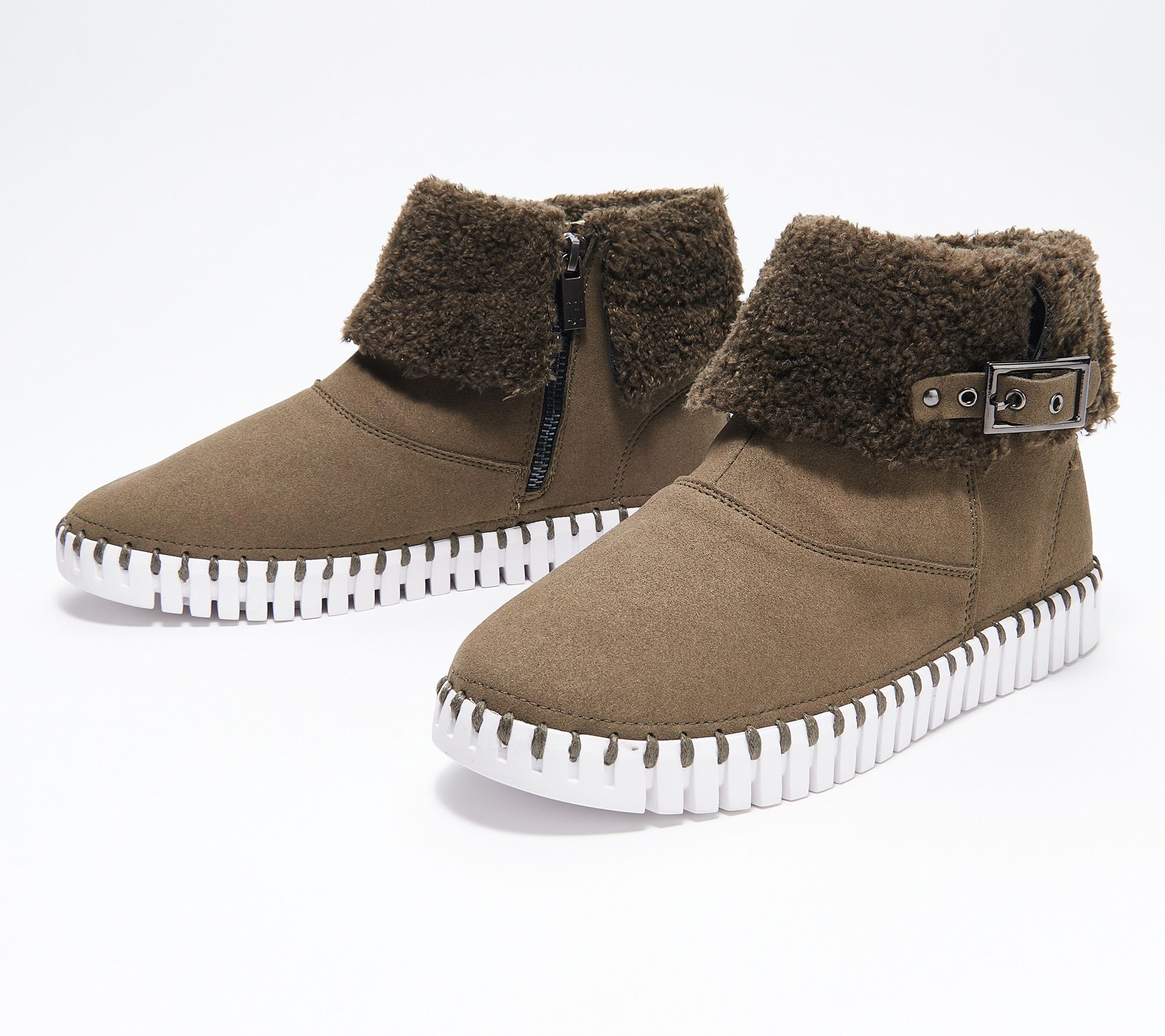 • Decorative buckle, faux-shearling, removable footbed