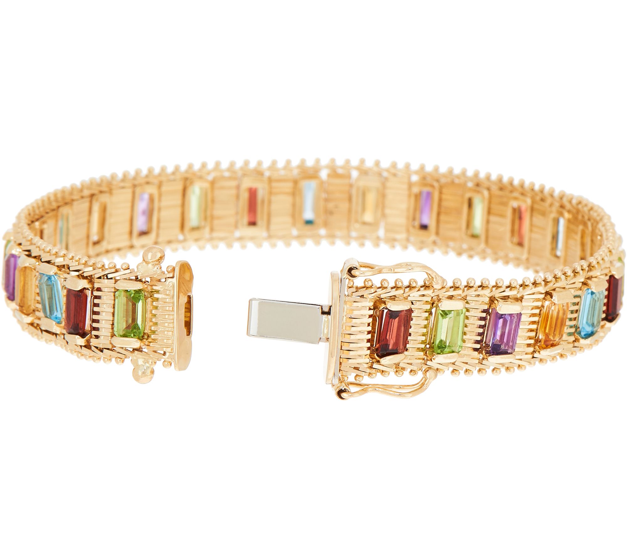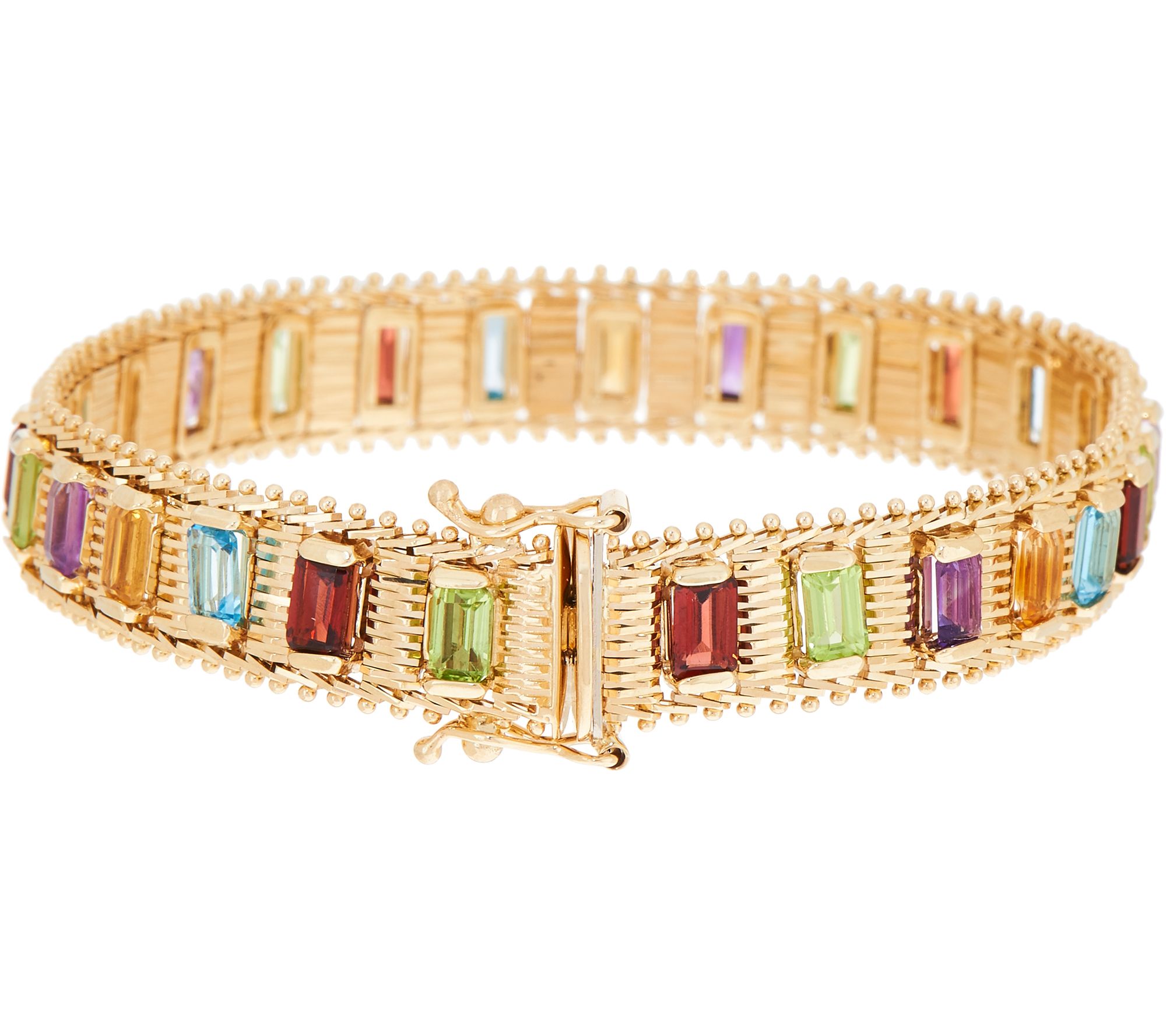 • Diamond-cut links surrounded by beaded borders; alternating octagonal gemstones, including garnet, amethyst, peridot, blue topaz, and citrine