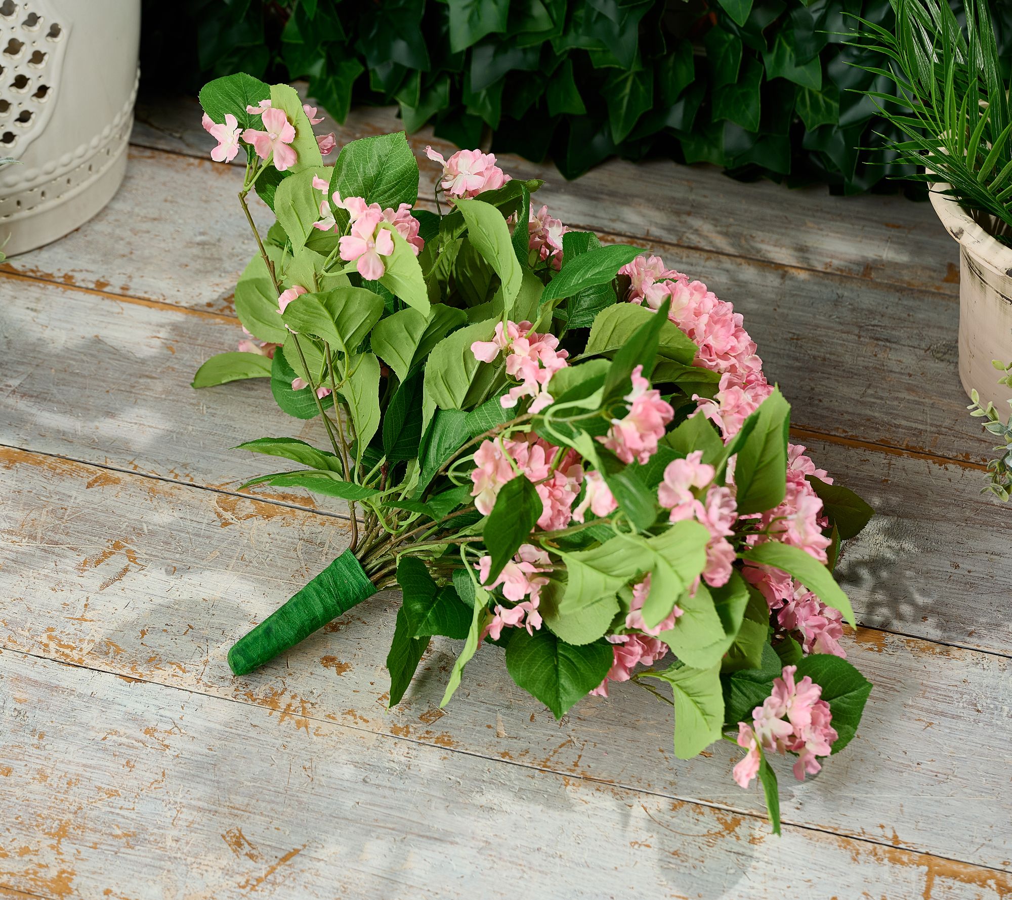 • 40 lifelike hydrangea blooms mixed with green leaves