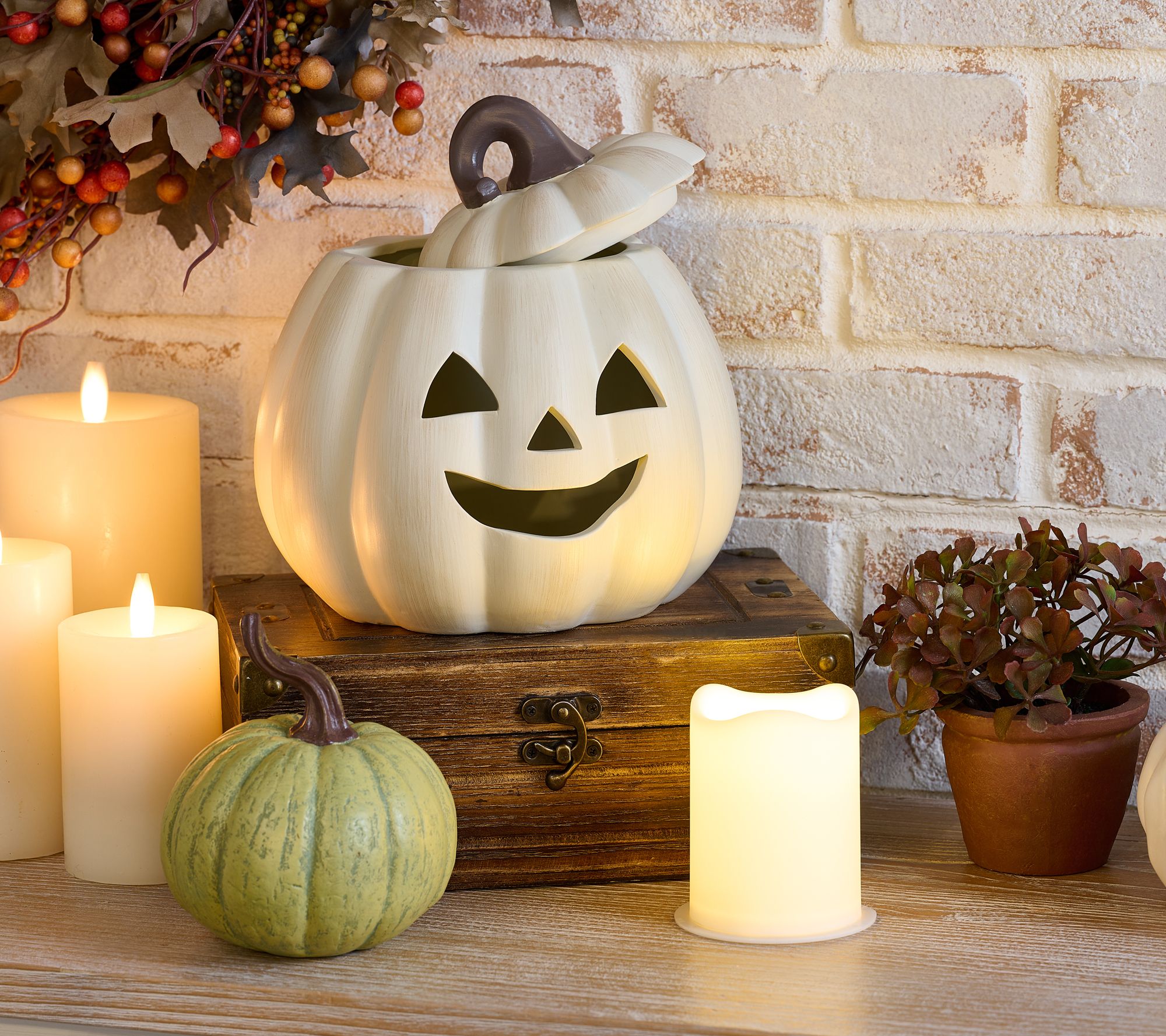• Includes ceramic pumpkin and flameless pillar candle