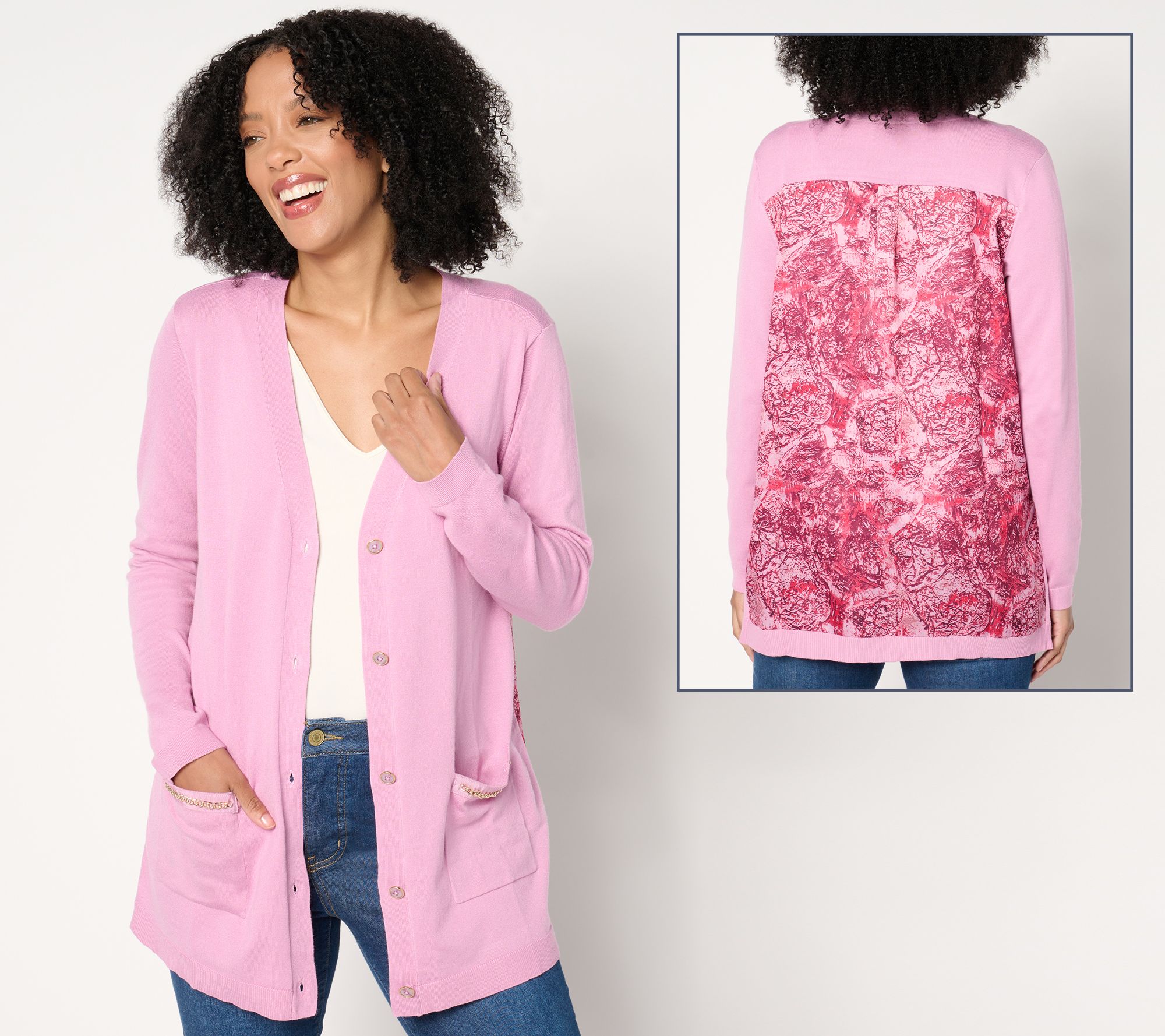 A printed woven back panel gives this cardigan a little something special. Wear it over tanks and tees for a stylish layered look. From Susan Graver.