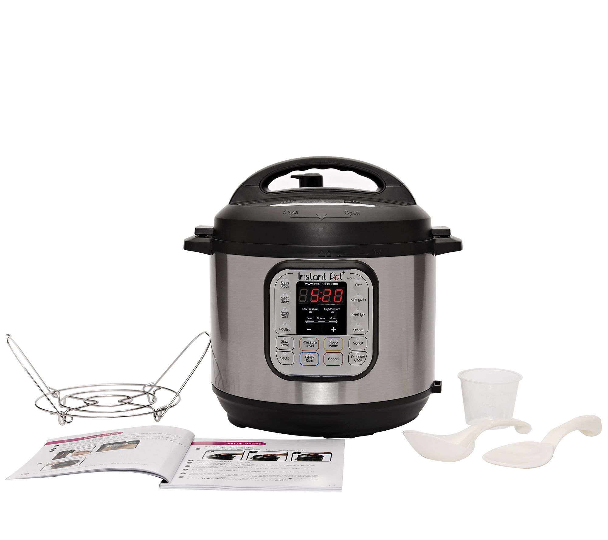 • Includes 6-qt pressure cooker, stainless steel steam rack, rice paddle, soup spoon, measuring cup, and recipe book