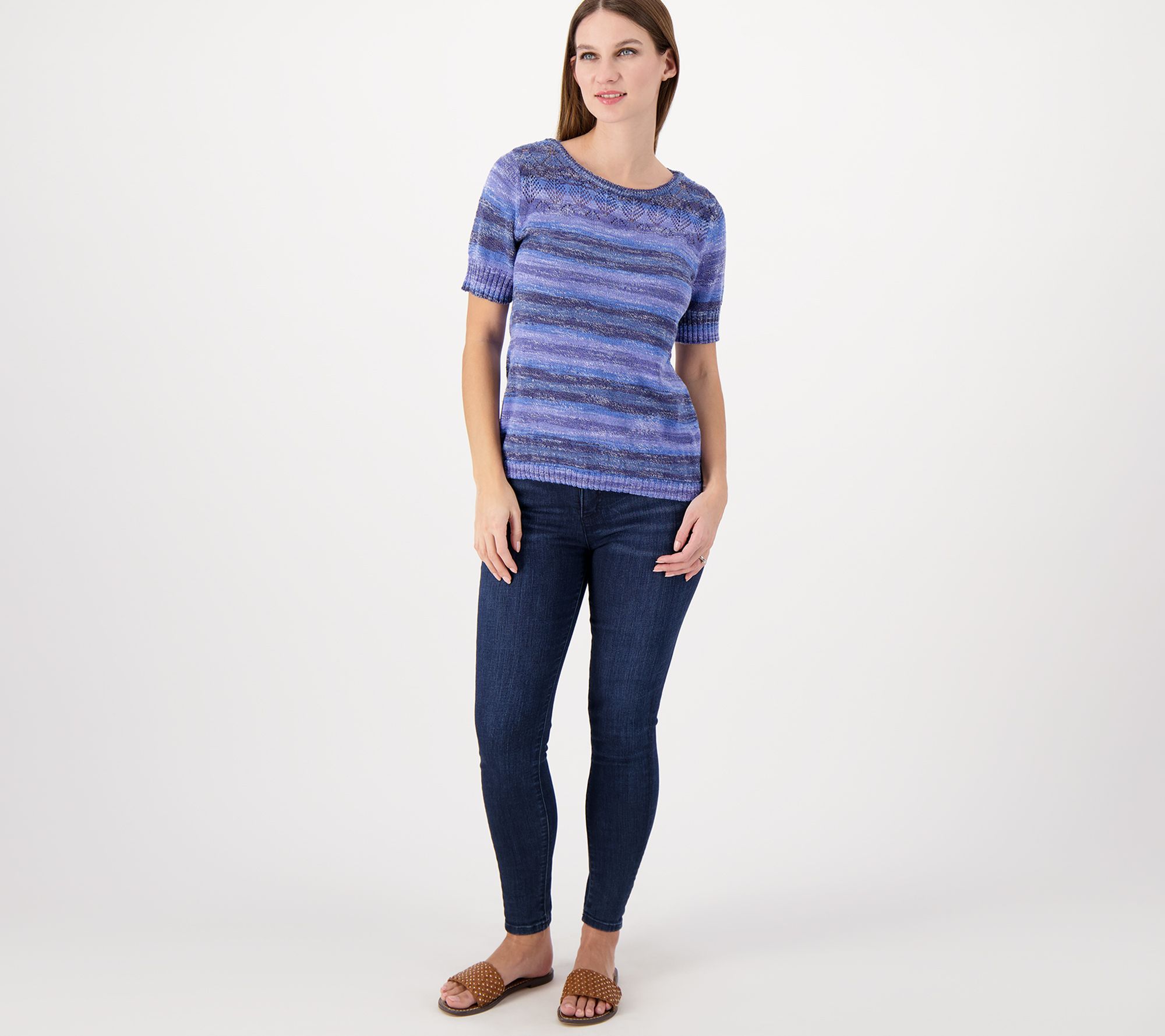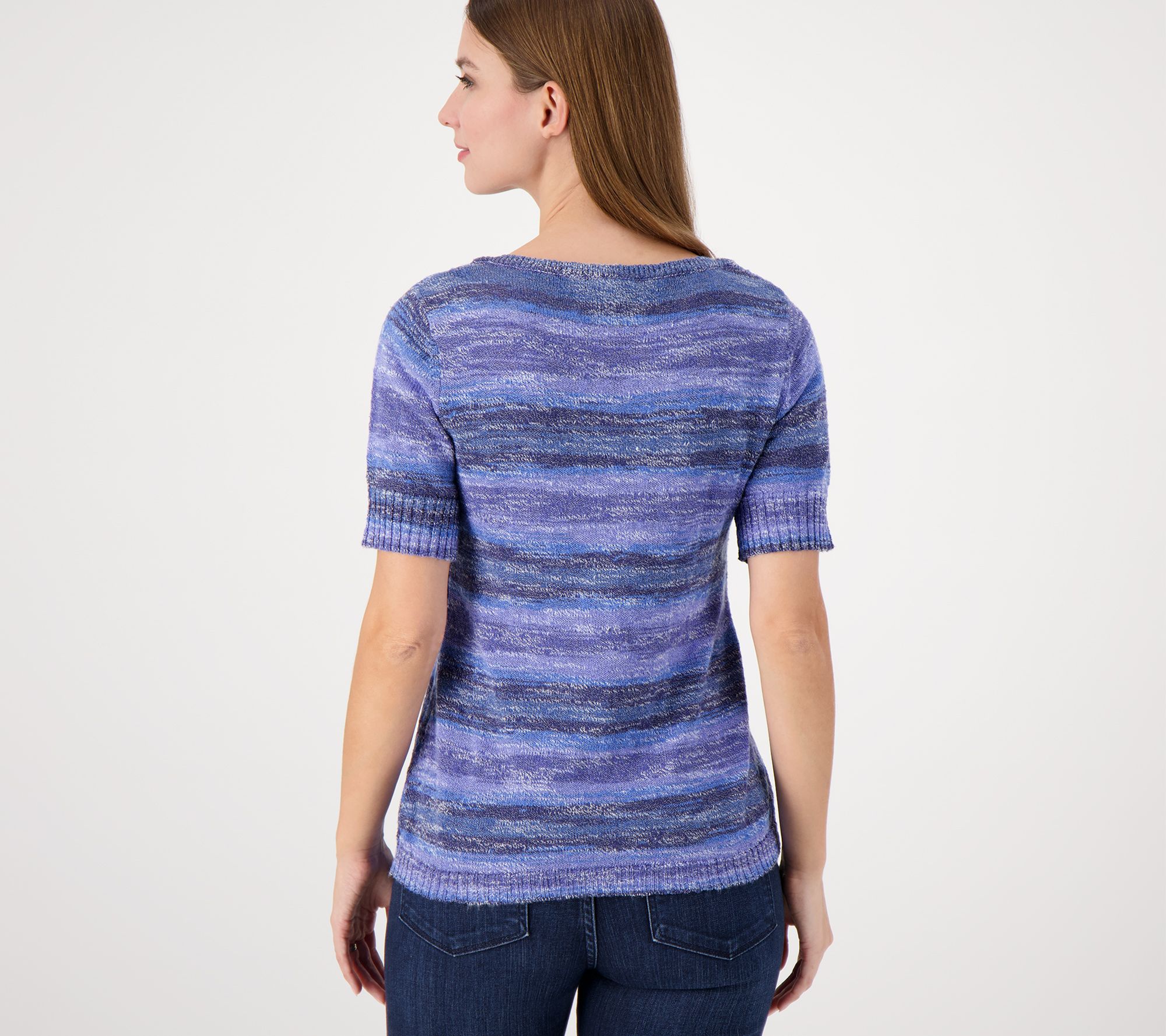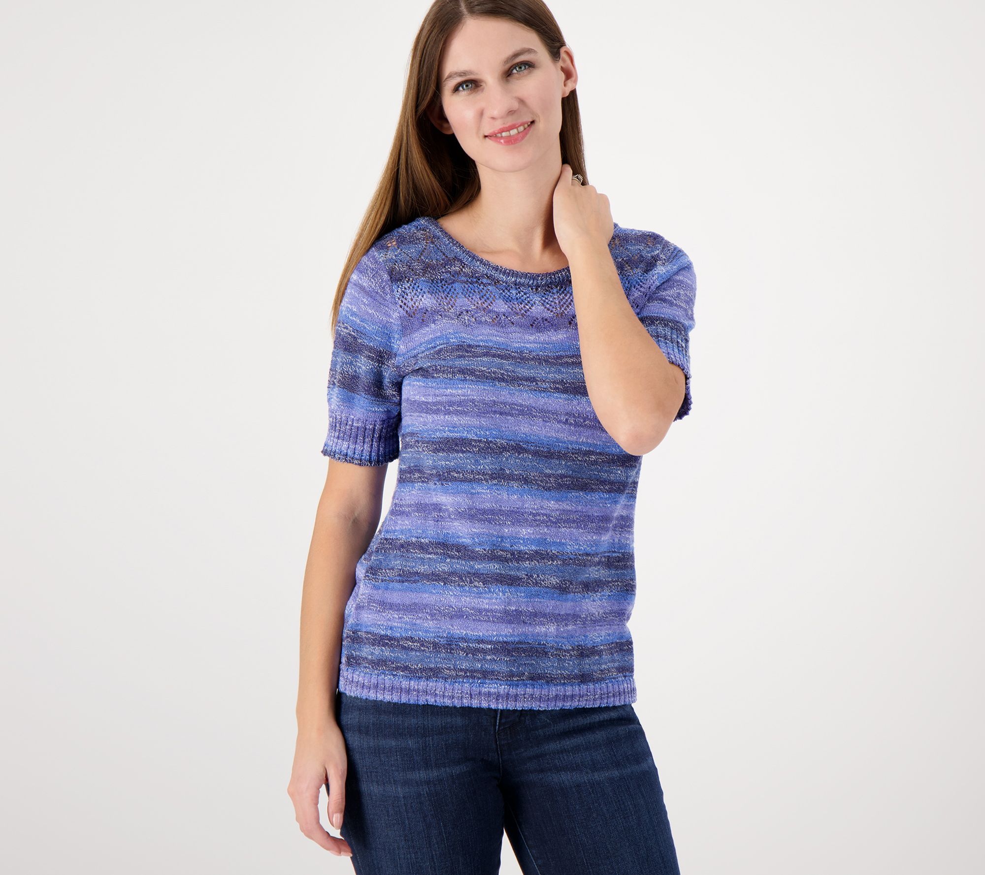 Earn your style stripes in this on-trend space dye sweater. The subtle pointelle detailing near the boat neckline adds an extra eye-catching element. From Isaac Mizrahi Live!TM.