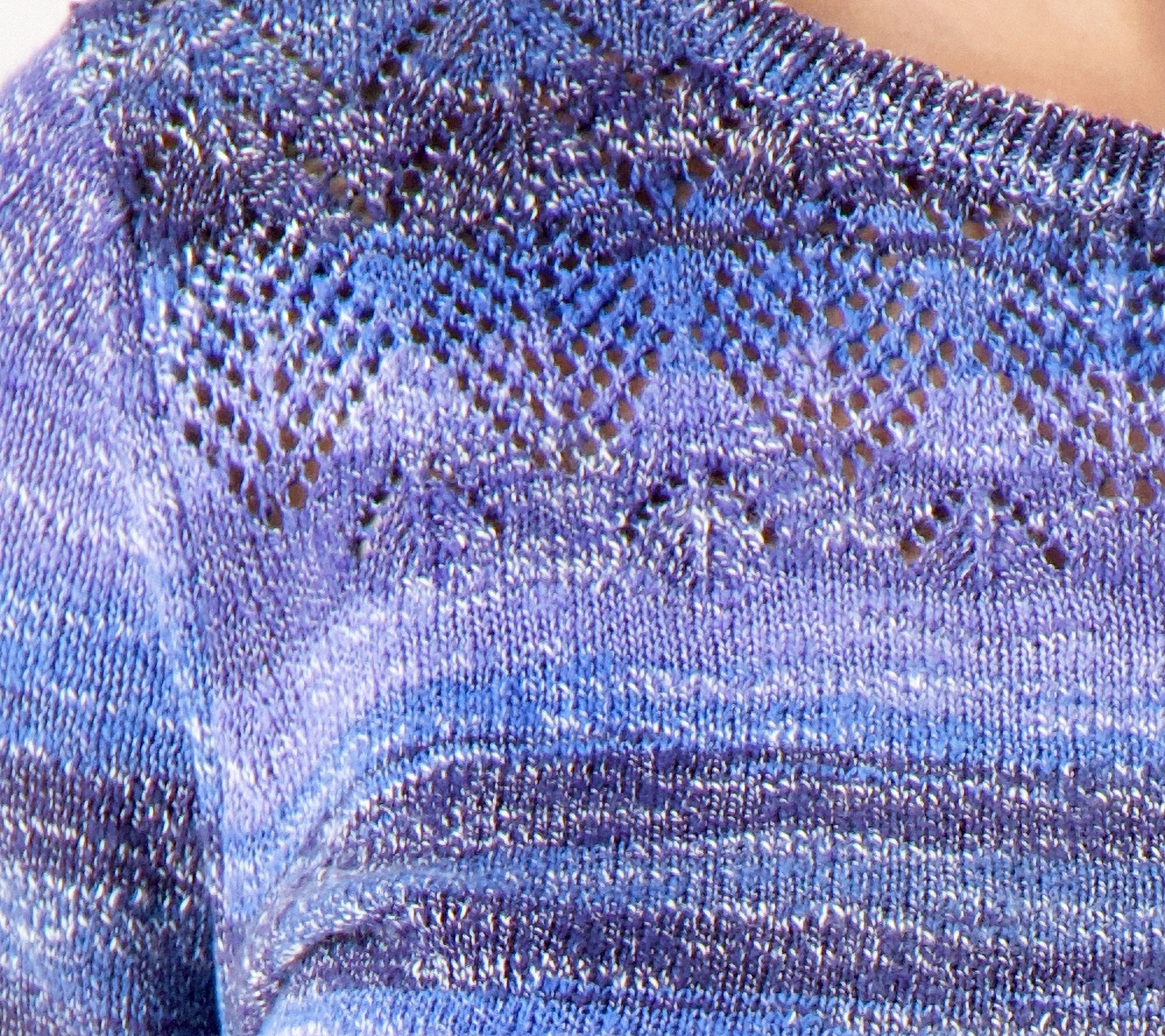 • Features: pointelle details near boat neckline, short sleeves, contrast stripe at back neckline, space dye pattern