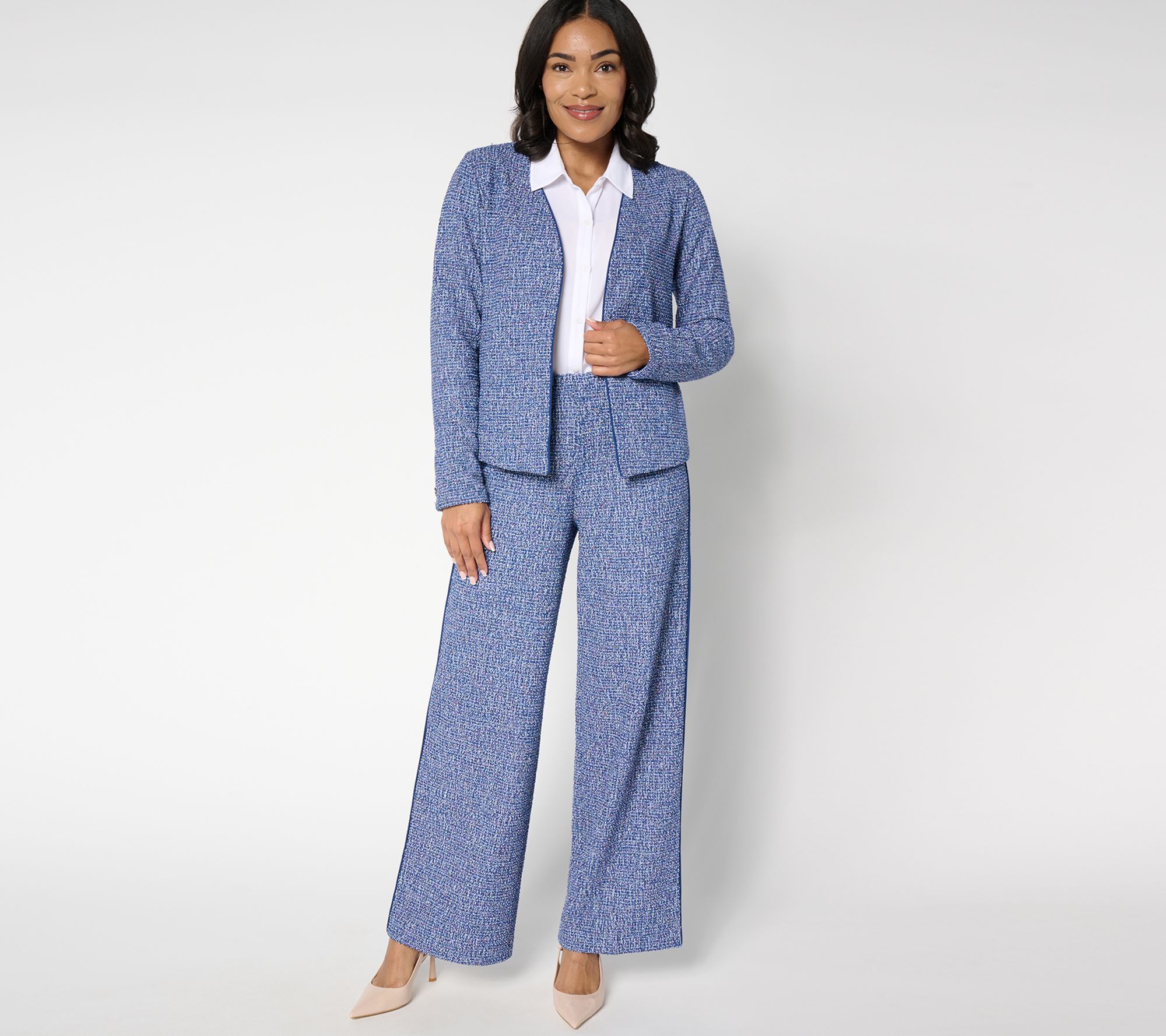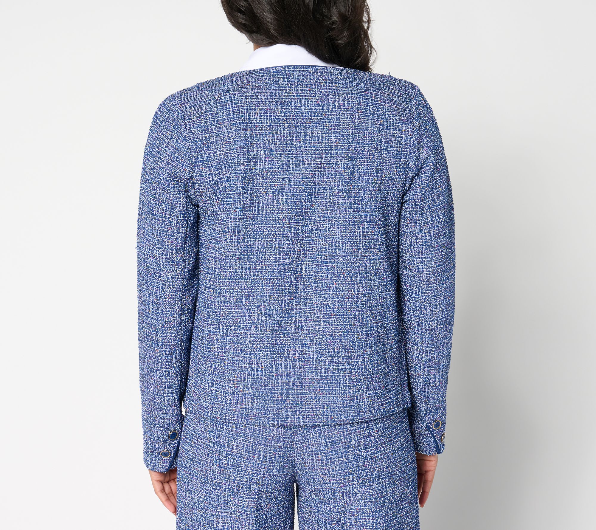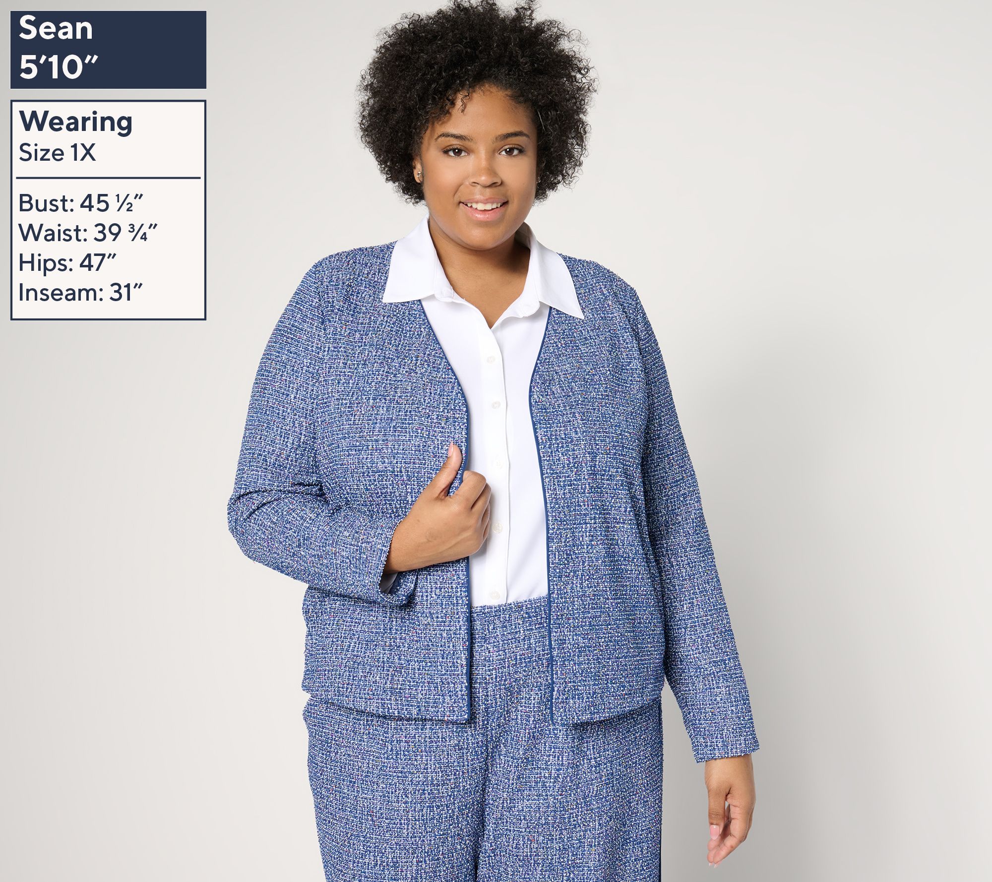 Embrace an effortless attitude of classic confidence with this jacquard open front cardigan. Edge piping trim at the neck and center front brings a polished touch to this layered look, while the buttoned sleeves and side seam pockets add practical elegance. From Isaac Mizrahi Live!TM.