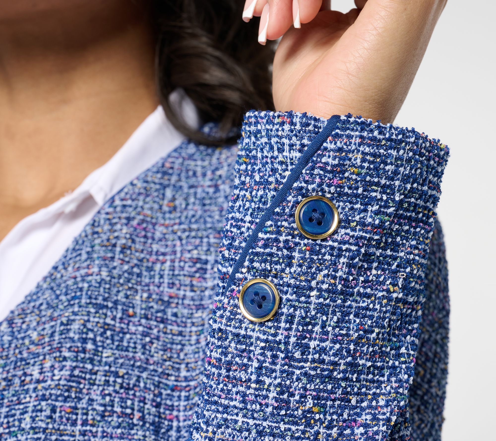 • Features: open front, edge piping trim at neck and center front, long sleeves, side seam pockets, button at sleeves