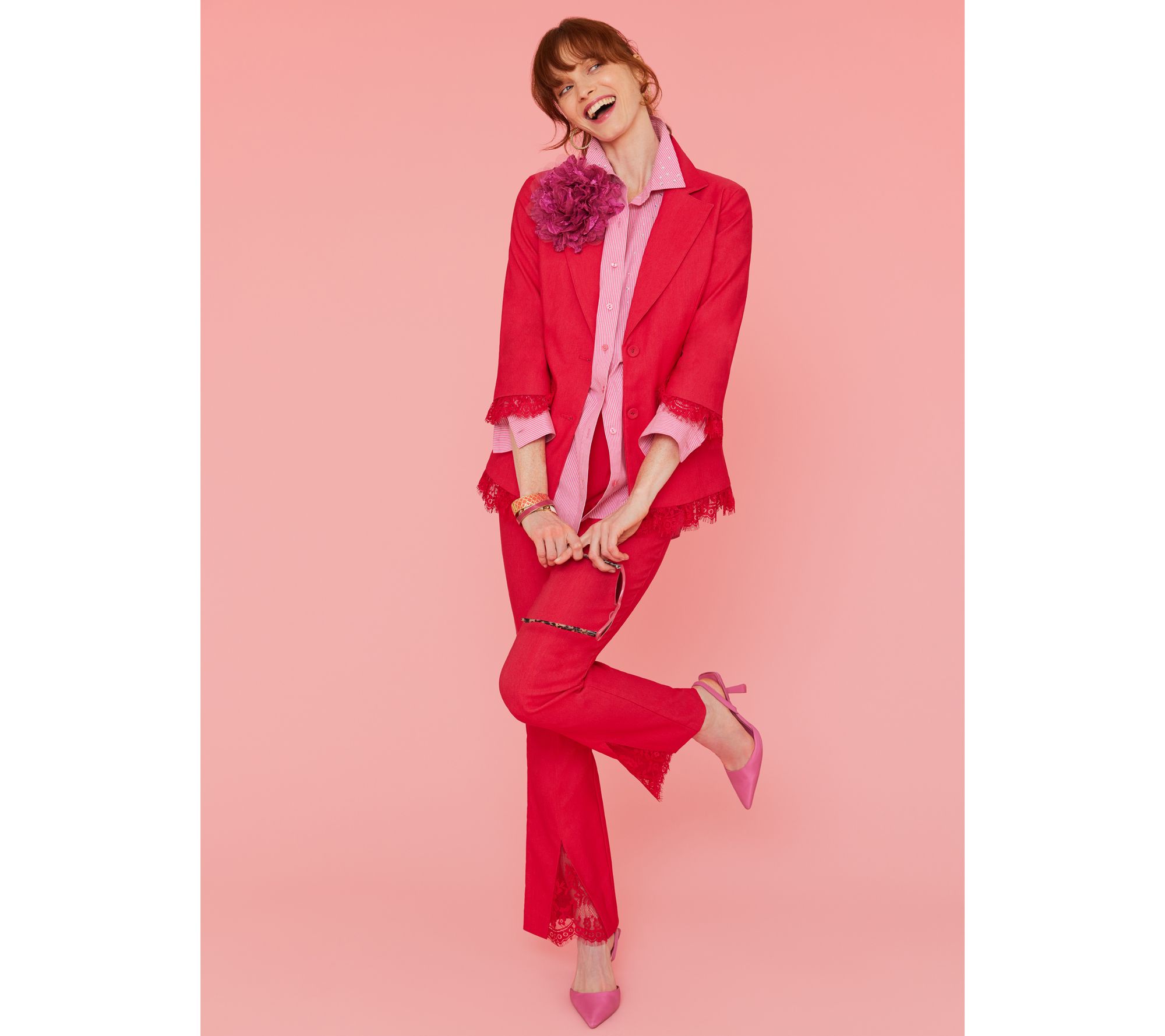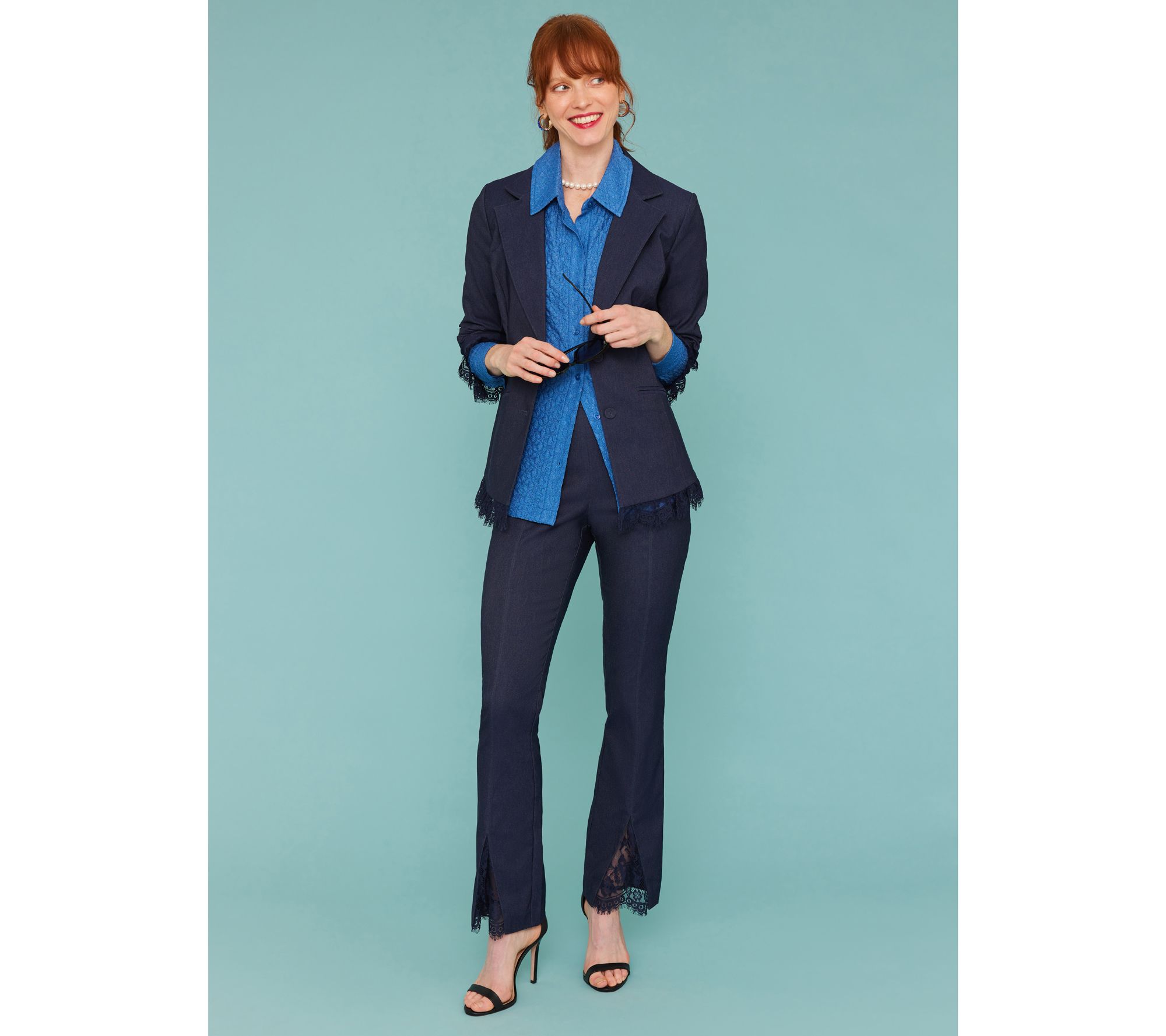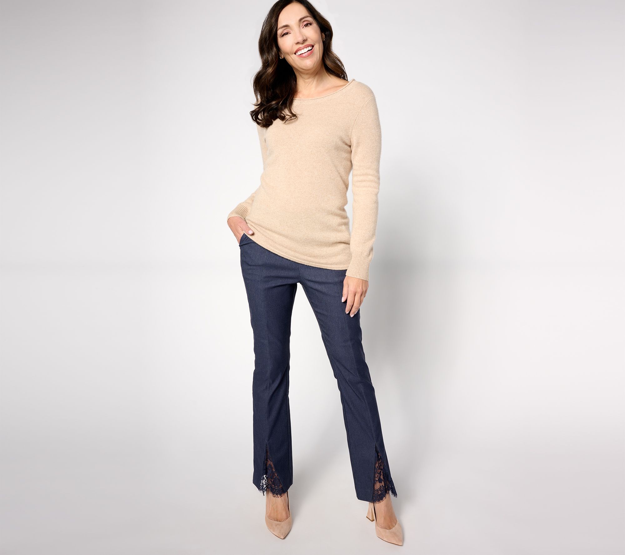 Sneak peek! Lace trim reveals just enough at the hems of this slimmer boot-cut style, making them a hit for any dressy-ish occasion. From Isaac Mizrahi Live!TM.