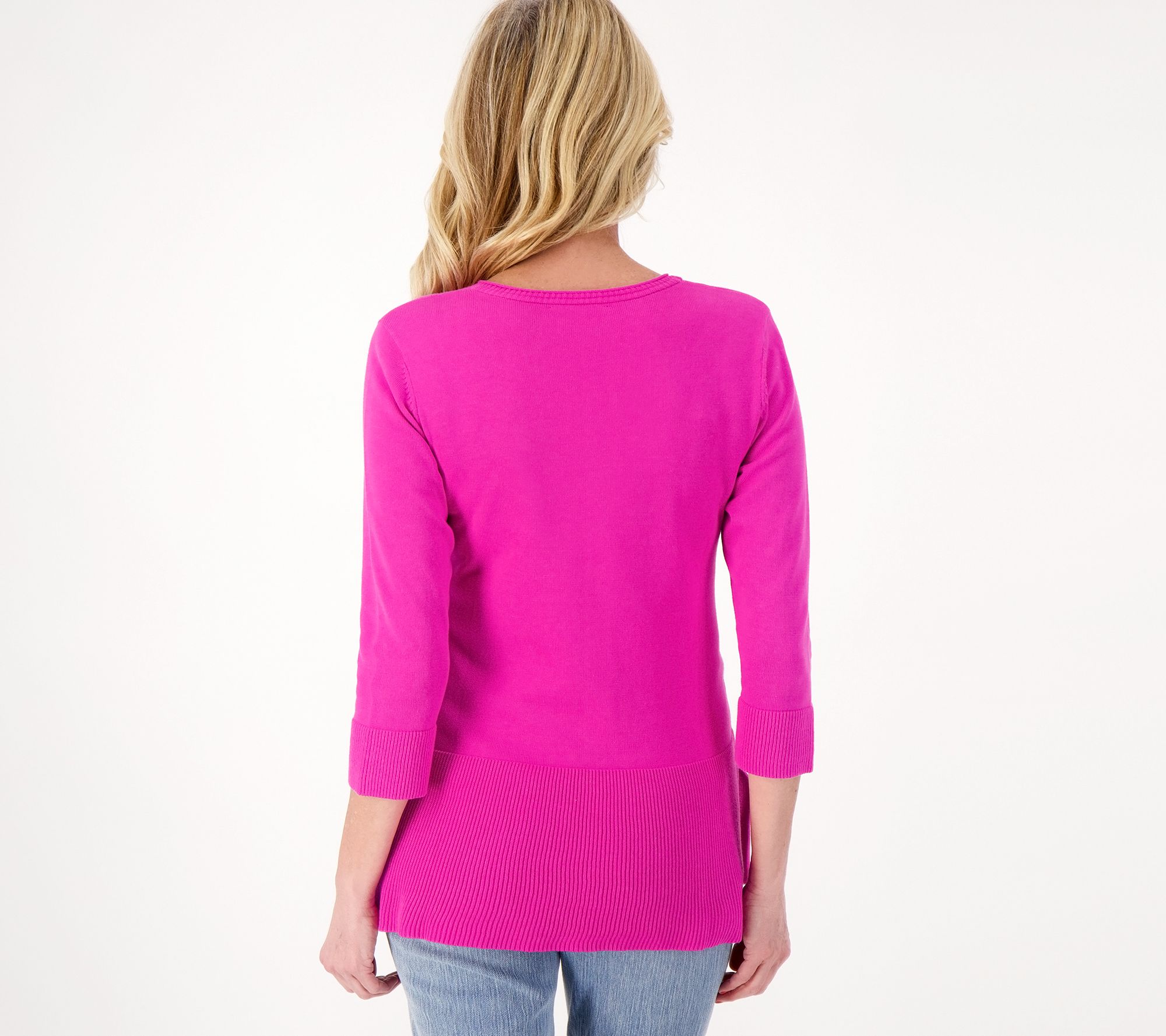 • Features: 3/4-length sleeves, ribbed details, side slit