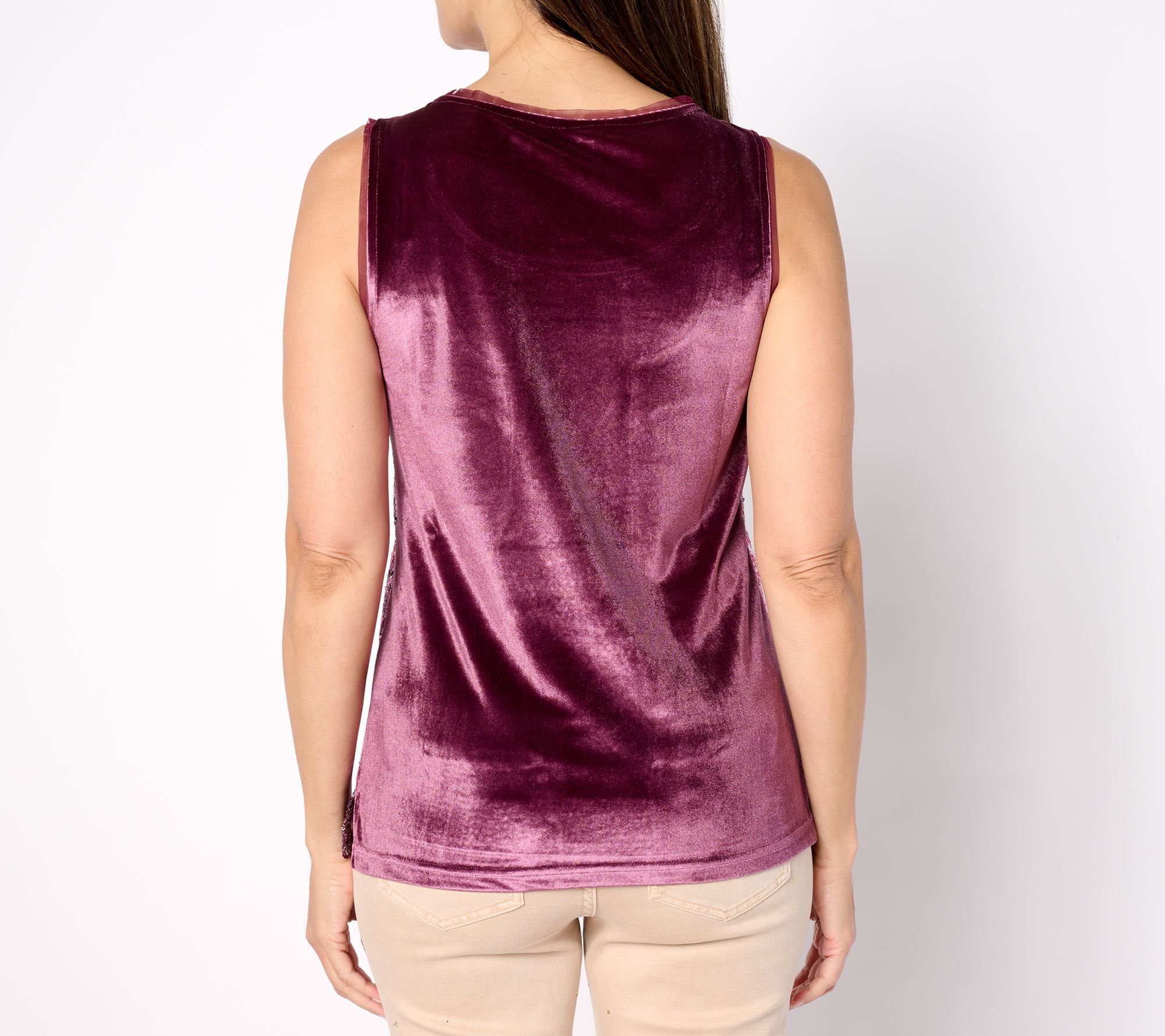 Compliments greet you at the door dressed in this sparkly sequined tank. A flexible velvet back and tricot lining encourage you to bust a dance move, join the holiday sing-along, or get your family charades on. From Isaac Mizrahi Live!TM.