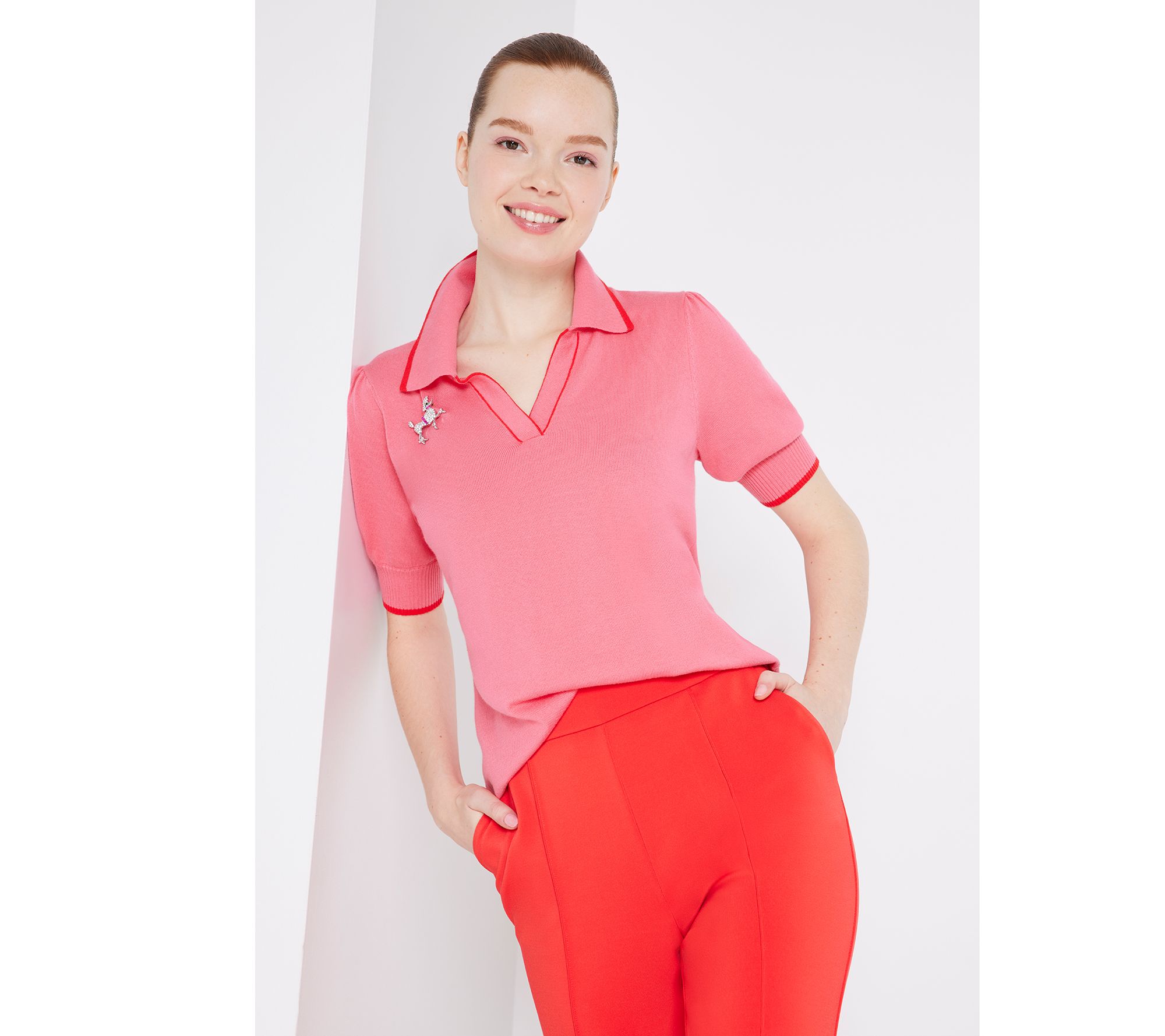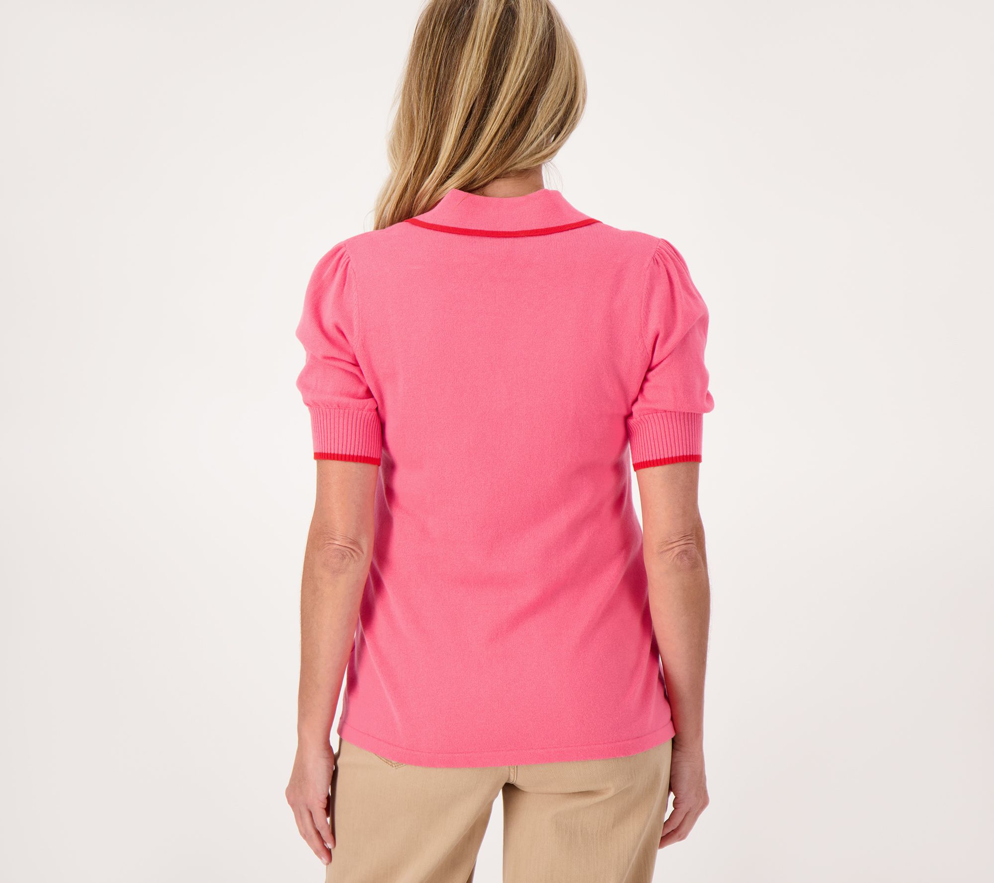 Simply sweet -- that's how we'd describe this polo sweater. With dainty elbow sleeves, ribbed cuffs, and a contrasting stripe detail, this top exudes understated elegance. From Isaac Mizrahi Live!TM.