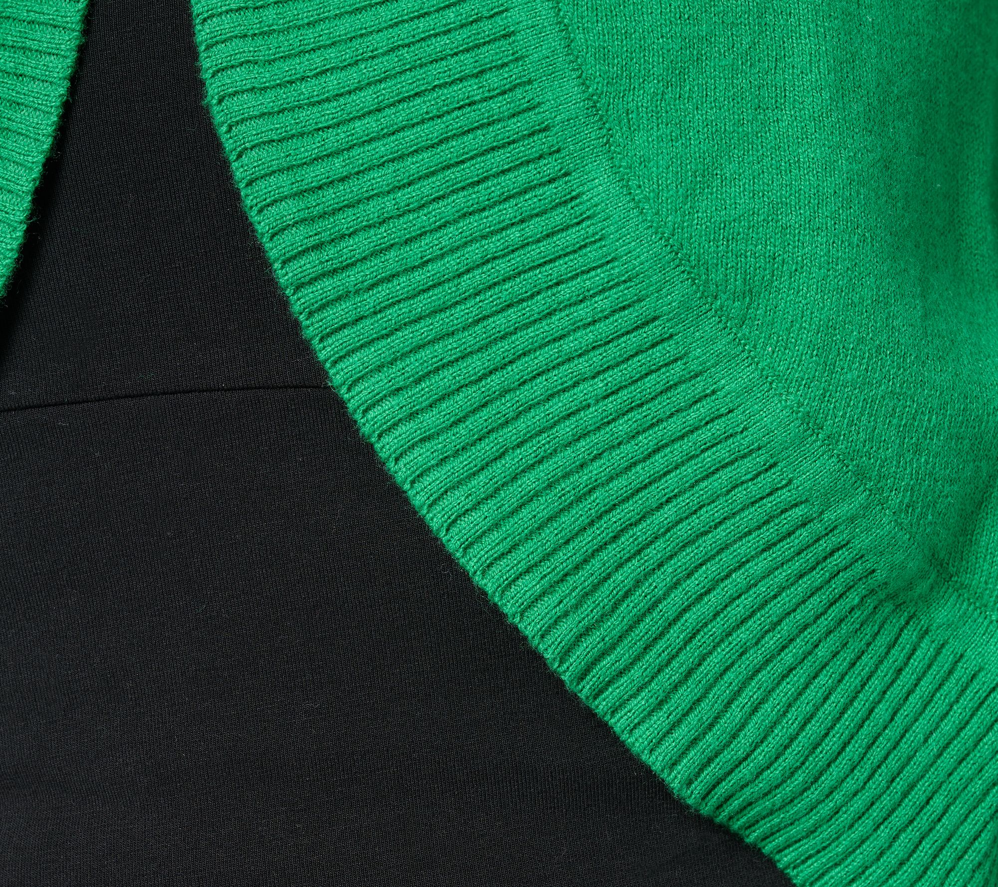 • Features: ribbed sleeve hems, neckline, and placket; open front; elbow-length sleeves