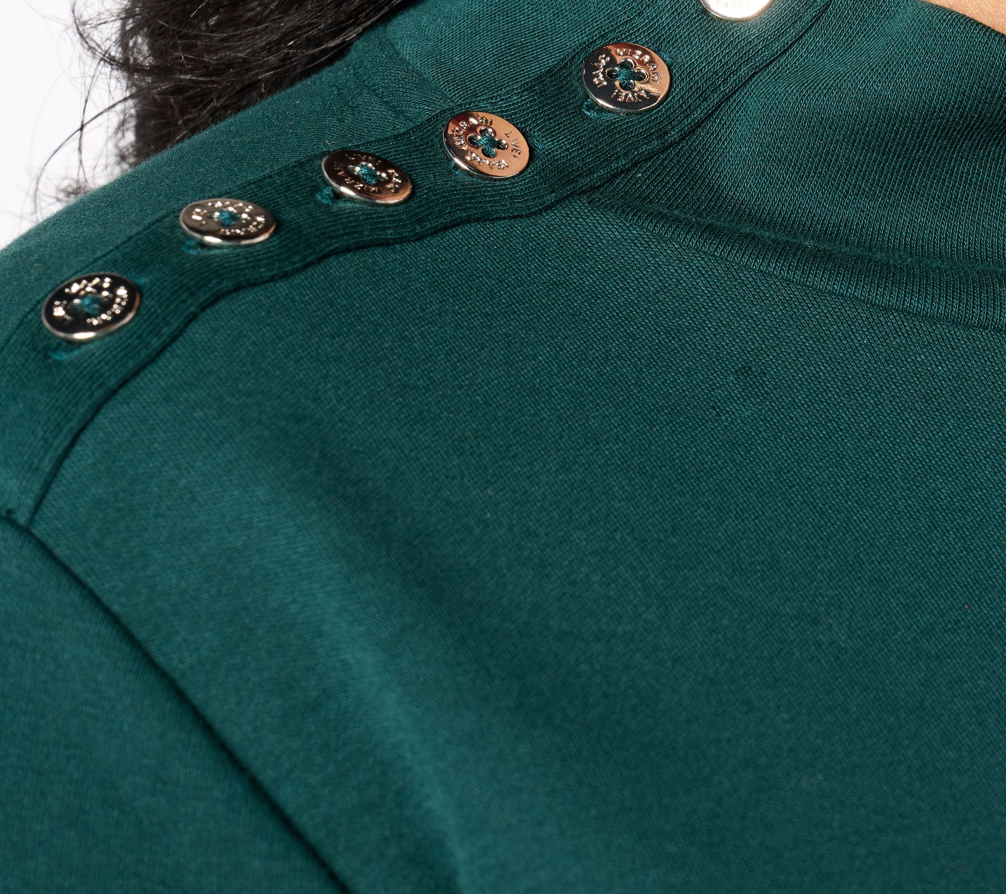 • Features: mock neck, 3/4 sleeves, gold buttons at the shoulder, side slits, straight hem