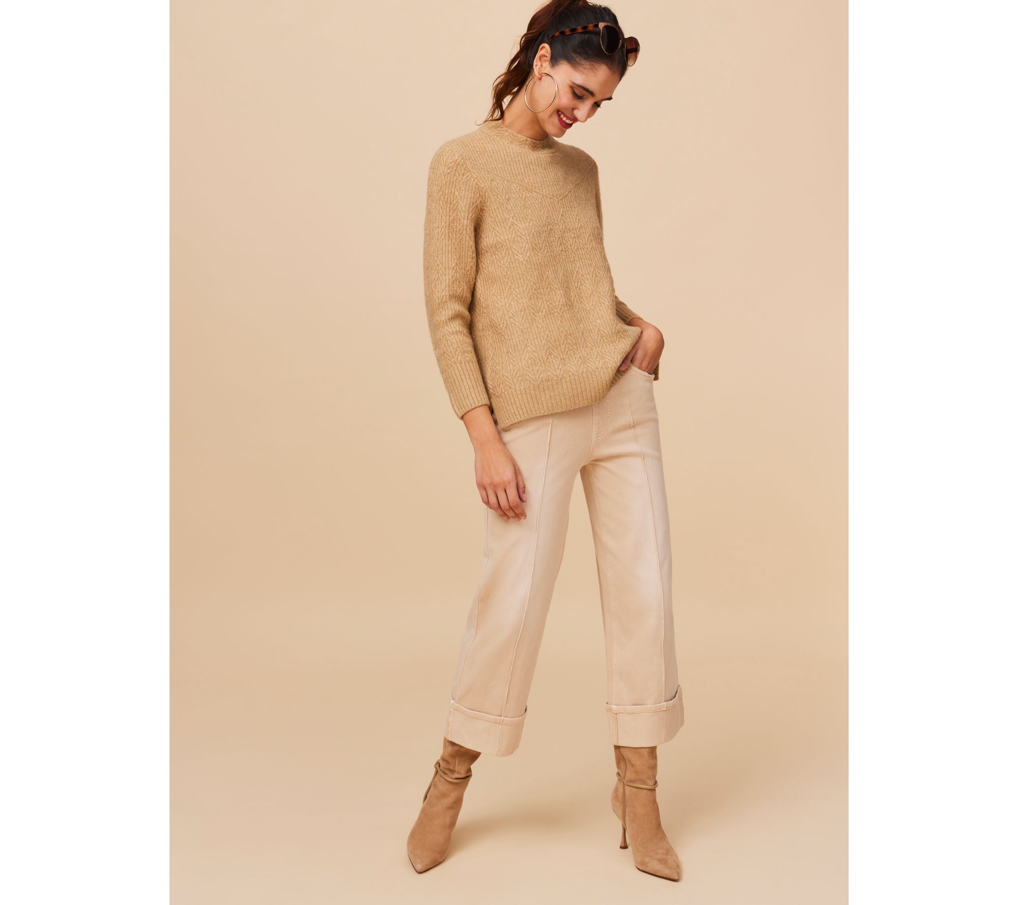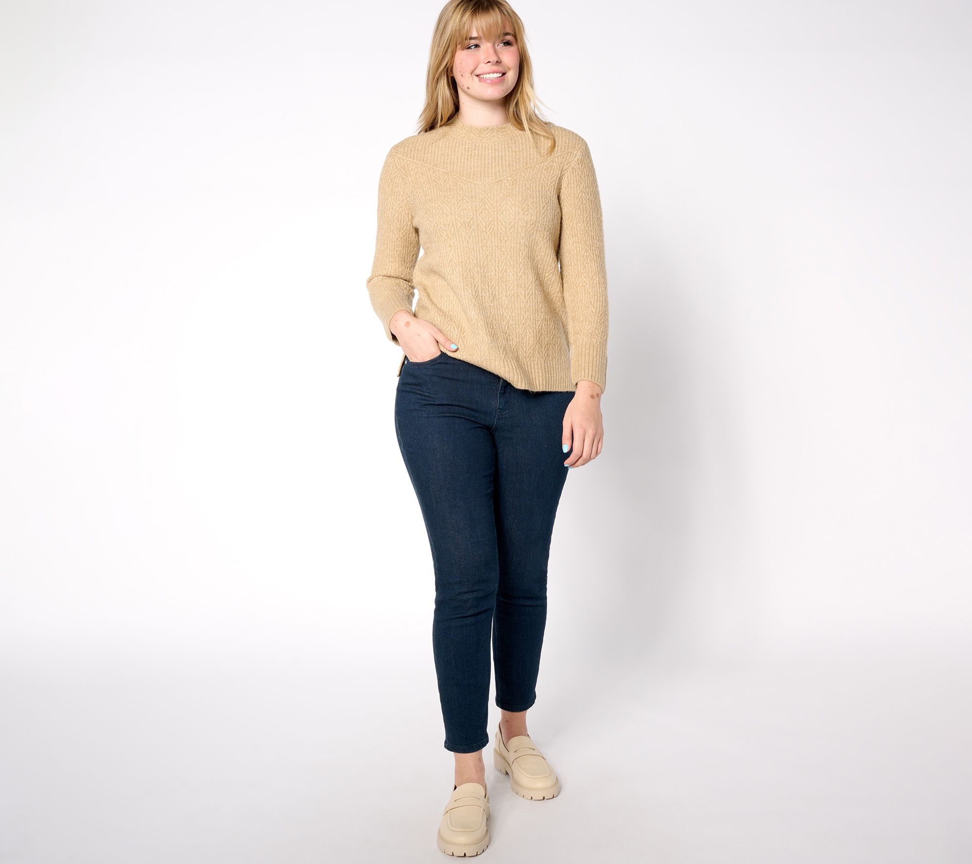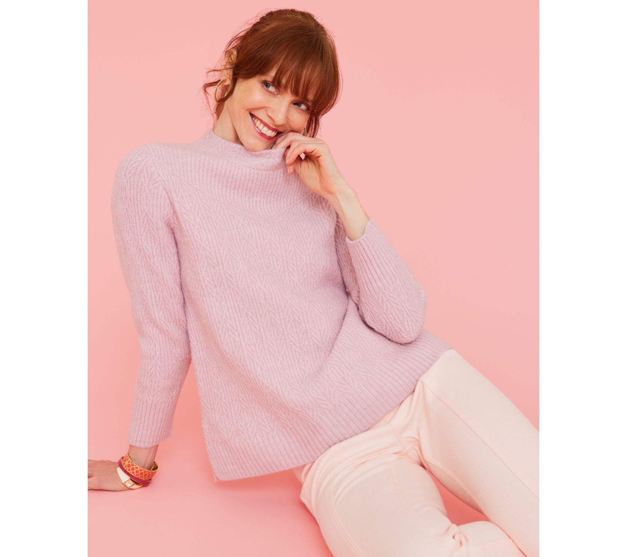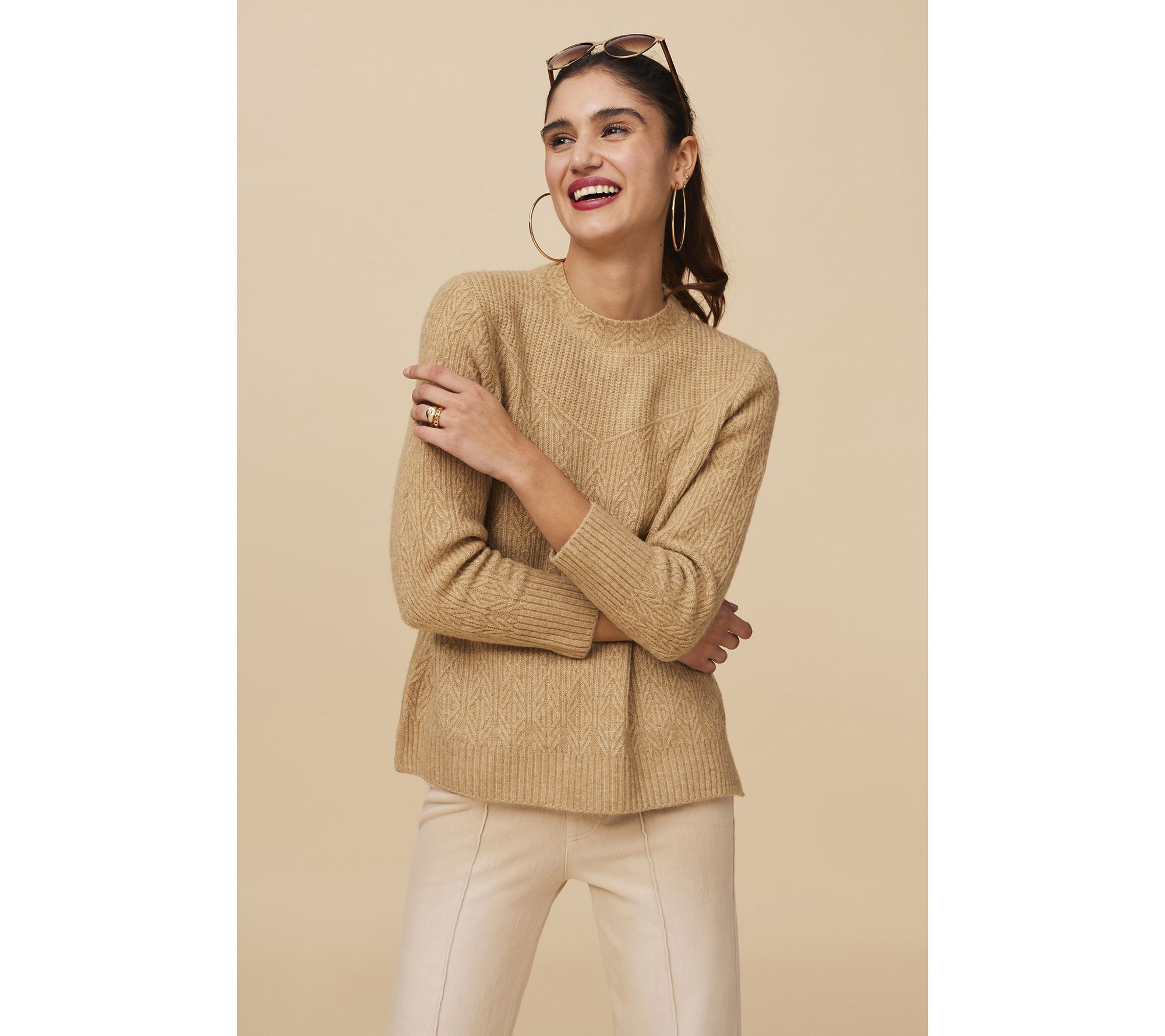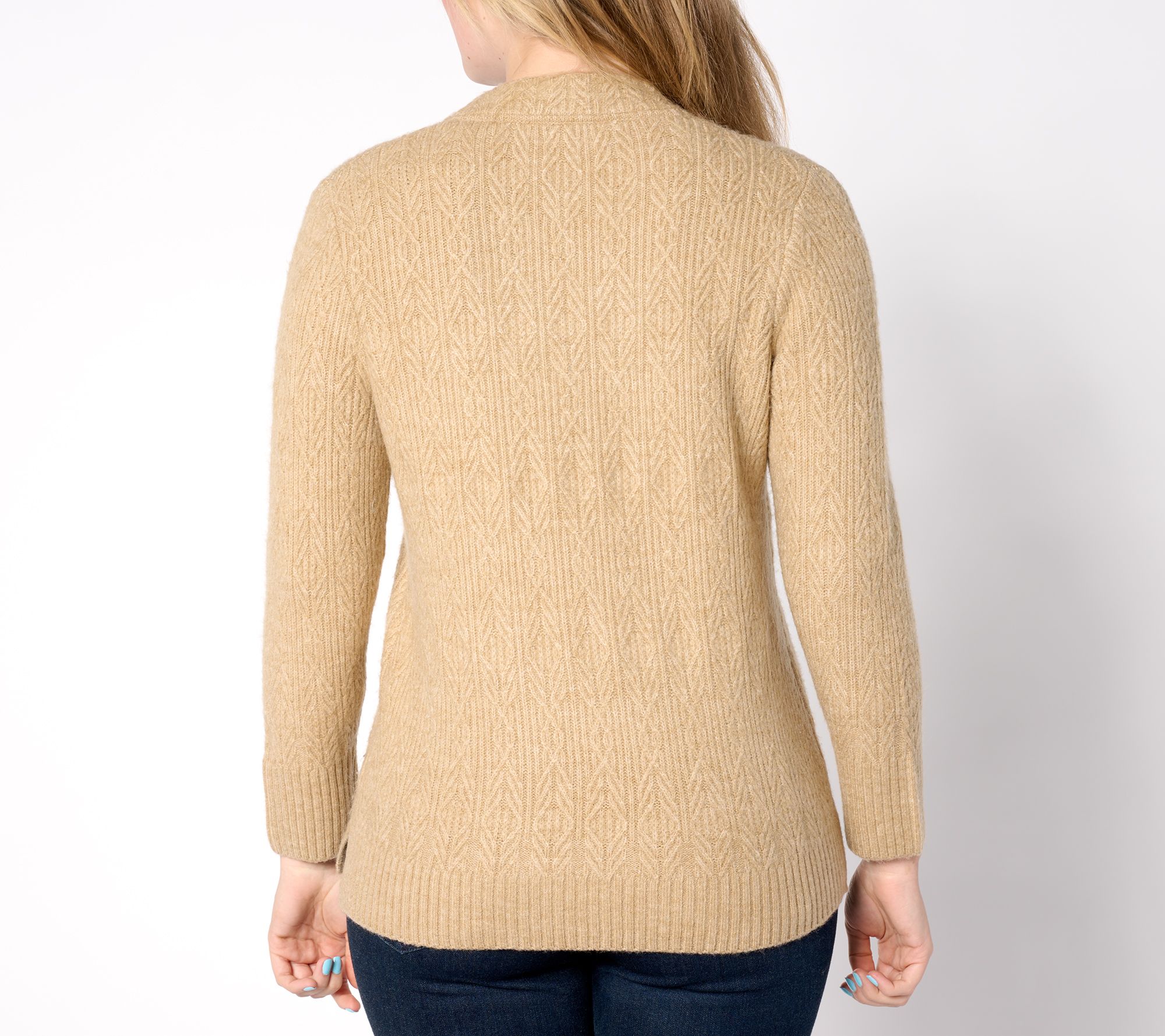 The weather outside may be frosty, but you'll be oh-so cozy in this classic cable-knit sweater. Pair it with your favorite jeans and some ankle boots and you'll be chic (and winter-ready) from head to toe. From Isaac Mizrahi Live!TM.