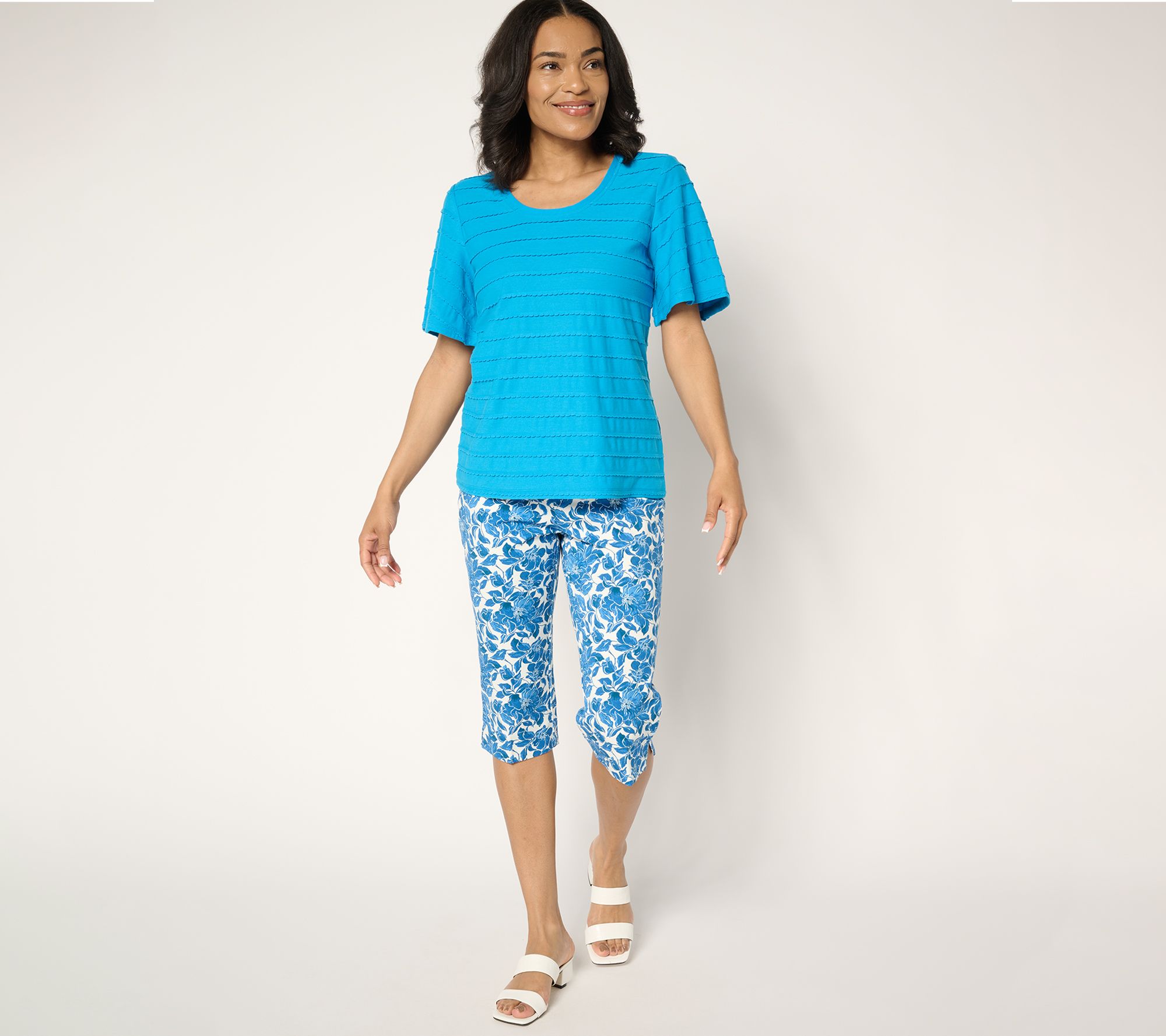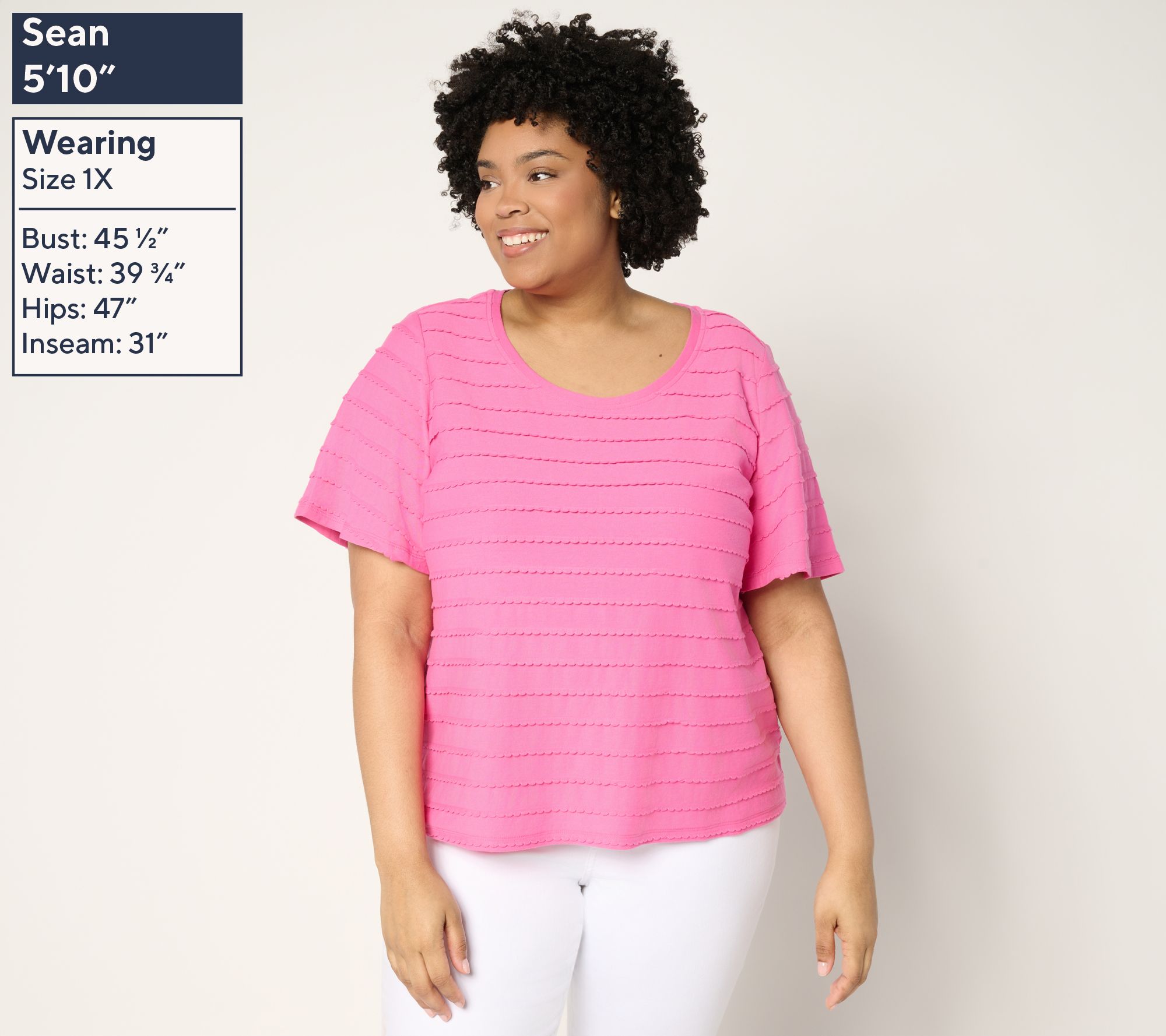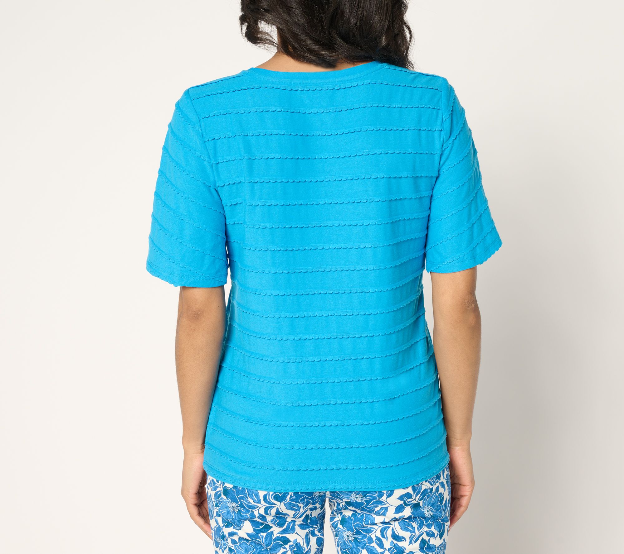 Isaac takes a tactile twist on stripes with this summery scoopneck top. Neat, vertical rows of scalloped trim line the semi-fitted silhouette, giving the illusion of allover striping while adding dimensional depth to the look. Playful flounce sleeves finish the chic design. Trust us -- you'll reach for this one again and again! From Isaac Mizrahi Live!TM.