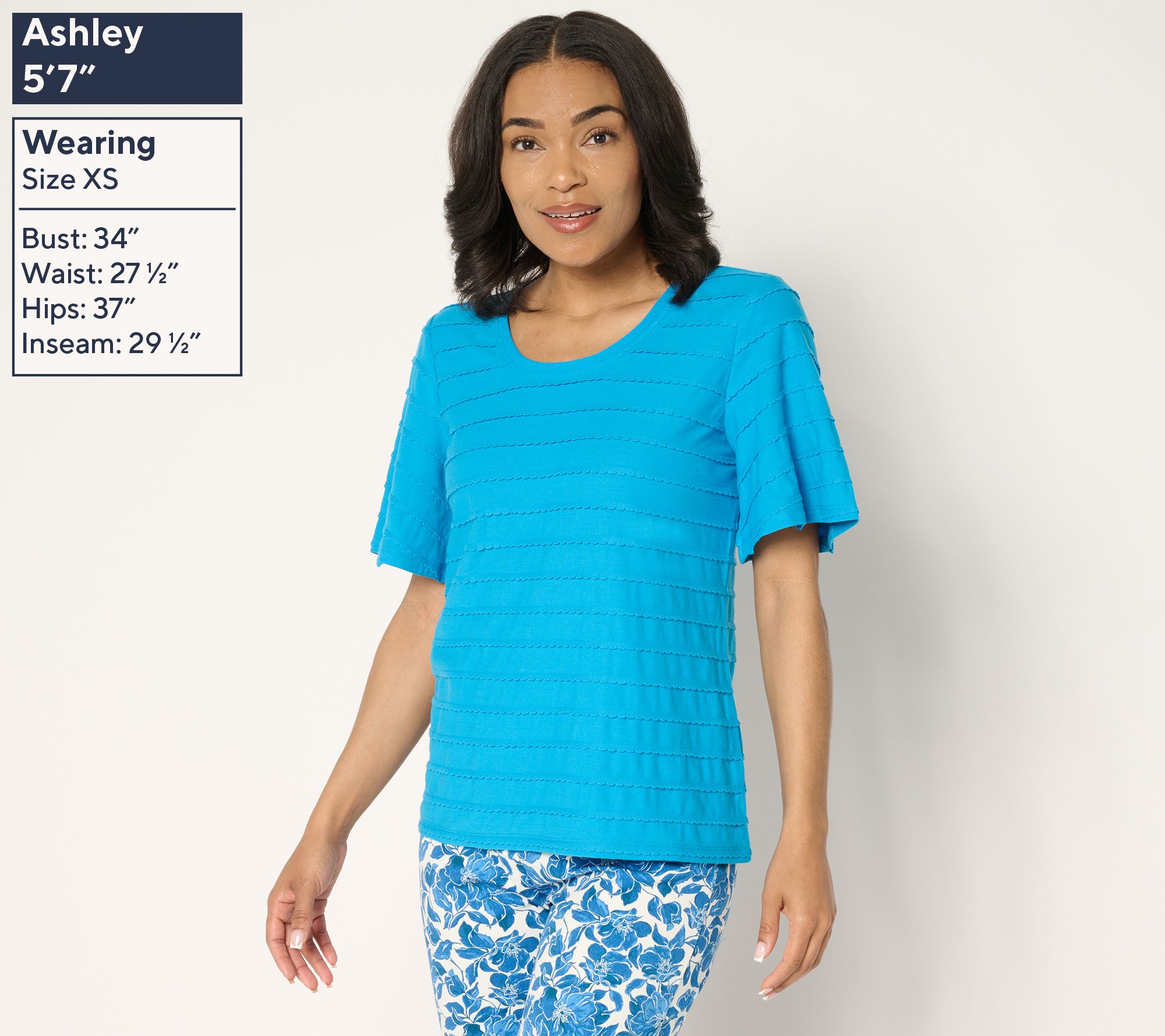 • Features: scalloped stripe pattern, scoop neckline, short flounce sleeves, straight hem