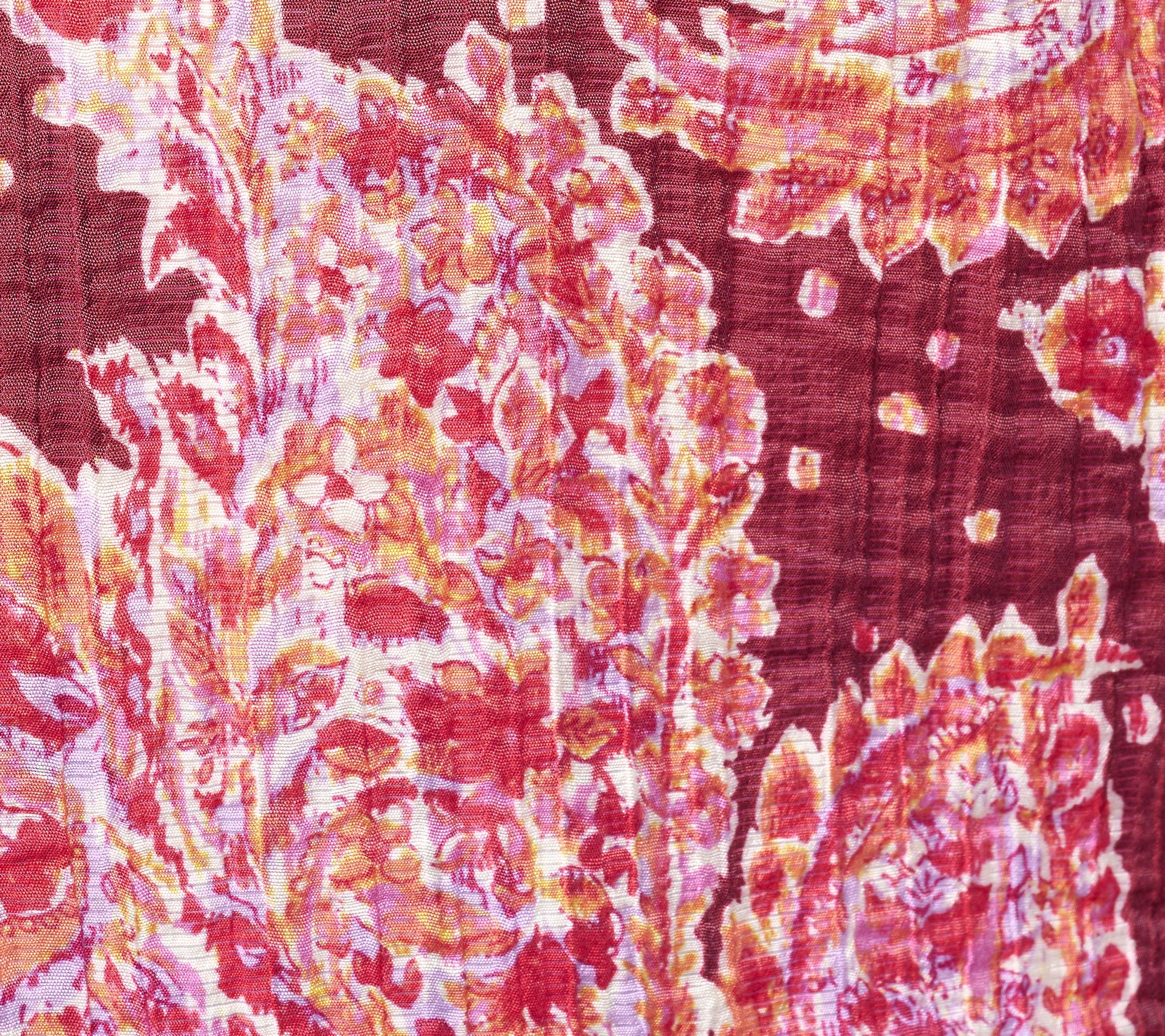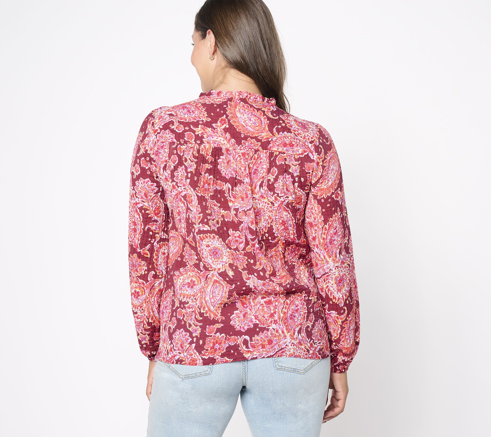 • Features: allover print, button-front closure, Y-neckline with ruffle and ladder lace trim insert, long peasant sleeves with ladder lace trim and elastic cuff, back yoke with shirring