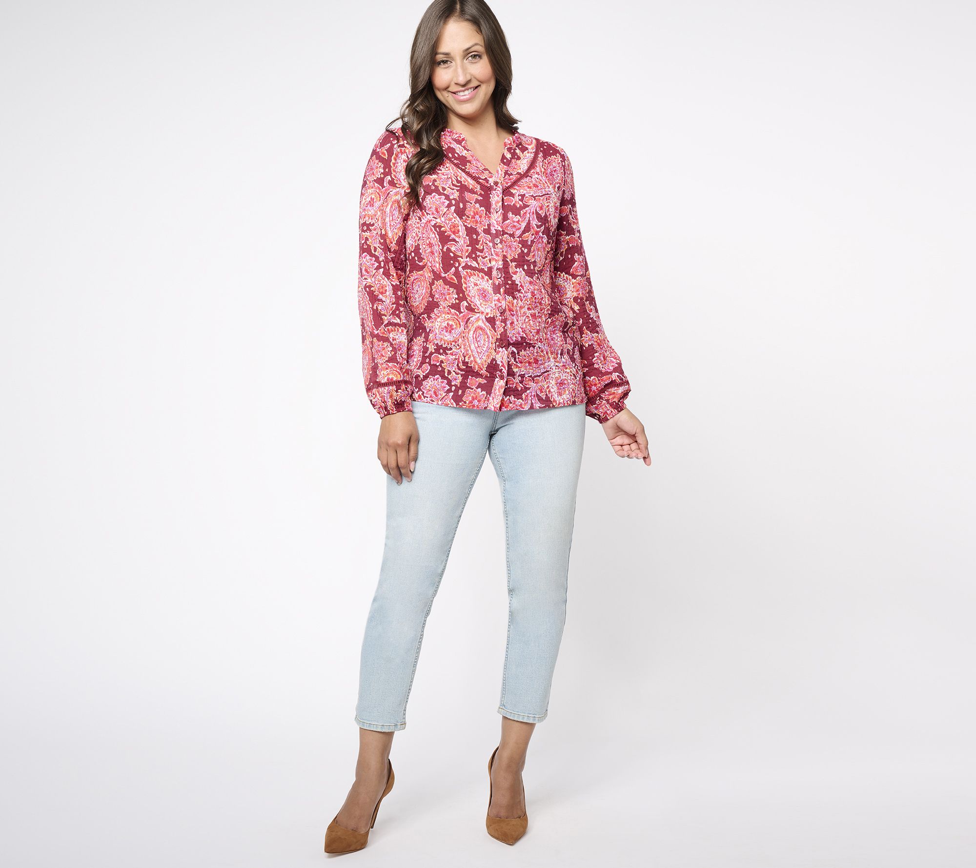 If it's an Isaac design, you know you'll find exciting, unexpected deets -- like ladder lace trim on the neckline and sleeves of this printed button-down blouse (so sweet!). Isaac, you've exceeded our expectations, once again! From Isaac Mizrahi Live!TM.