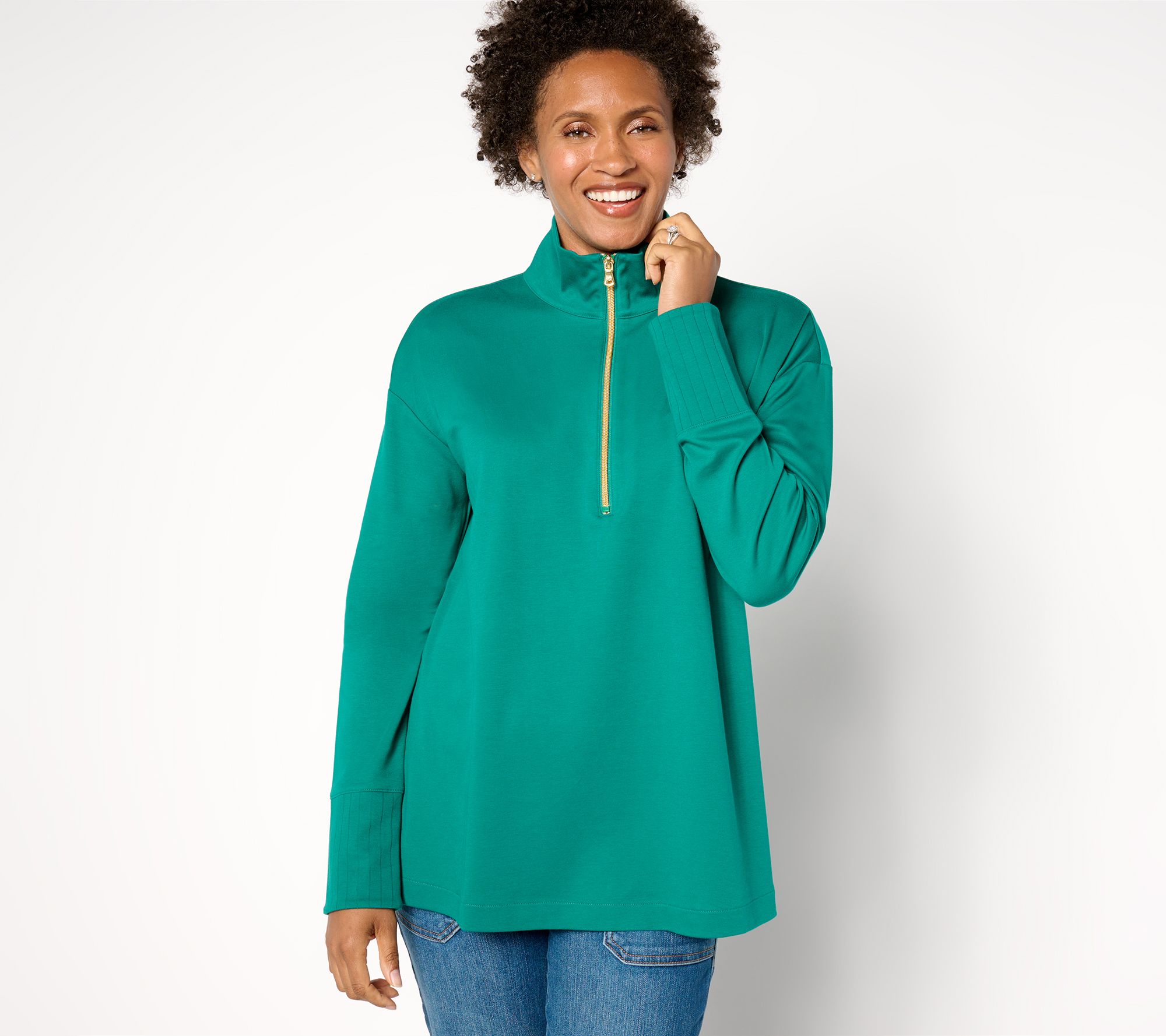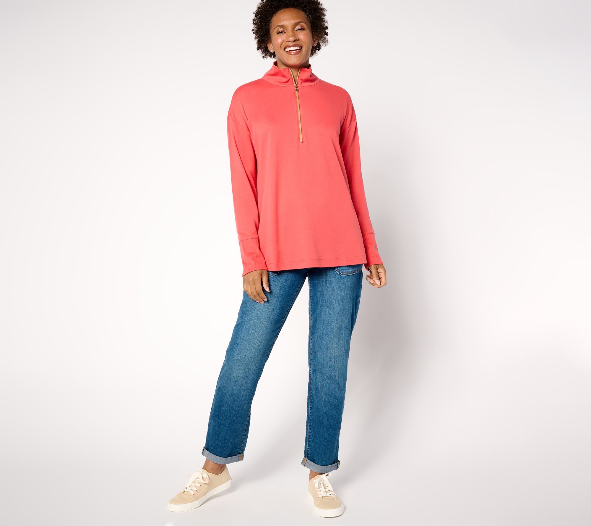 Elevate your casual wardrobe with this stylish quarter-zip pullover. Featuring a goldtone zipper closure and relaxed fit, this piece offers maximum comfort and ease. From Isaac Mizrahi Live!TM.
