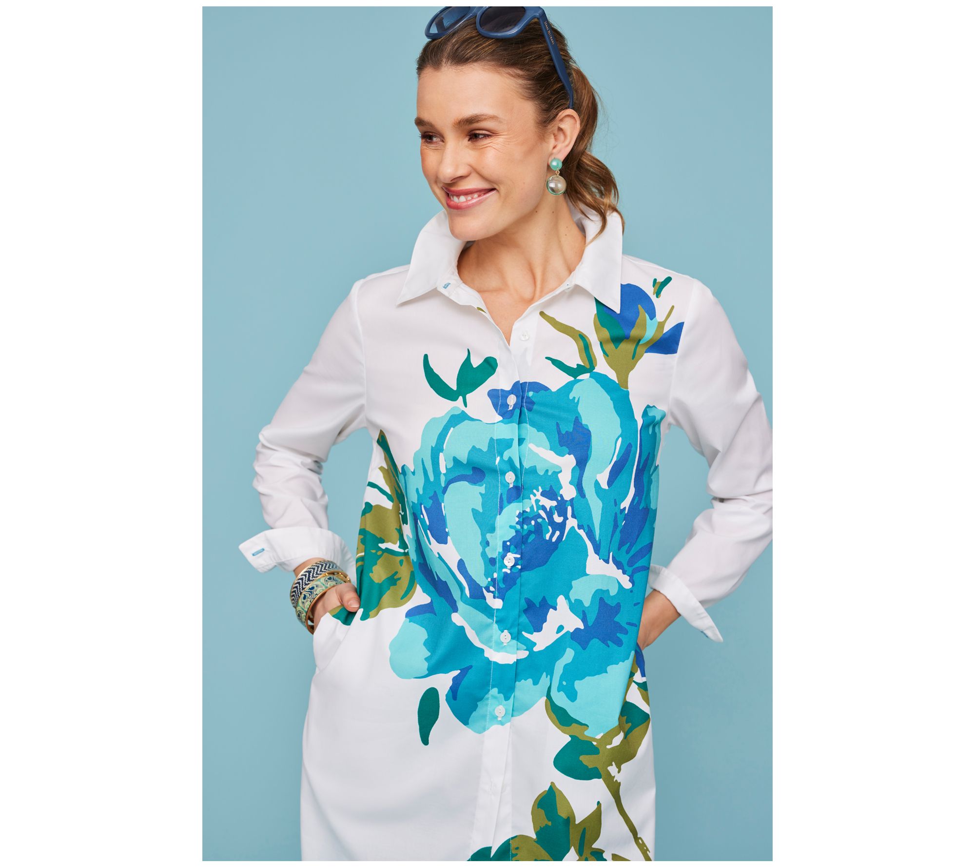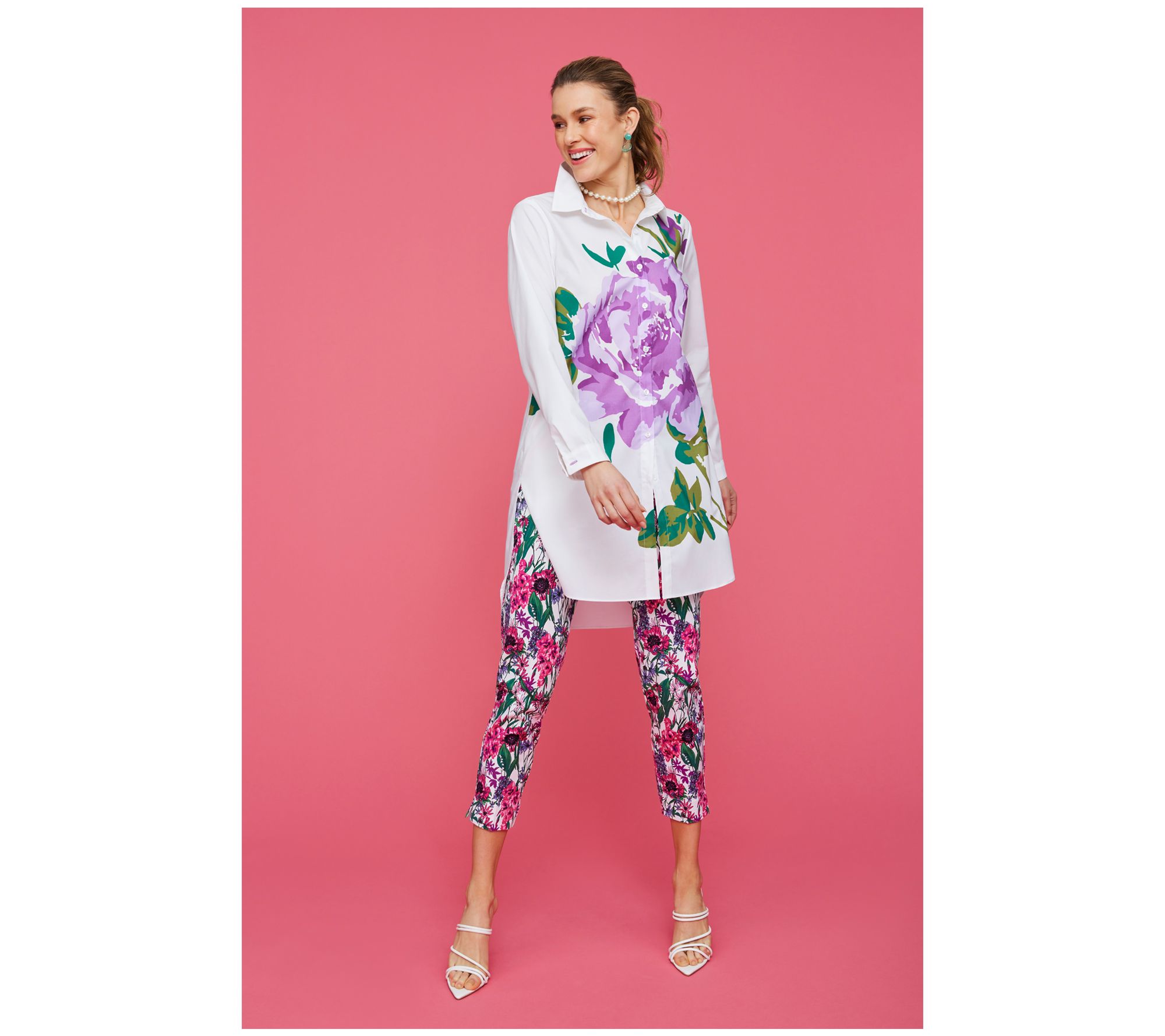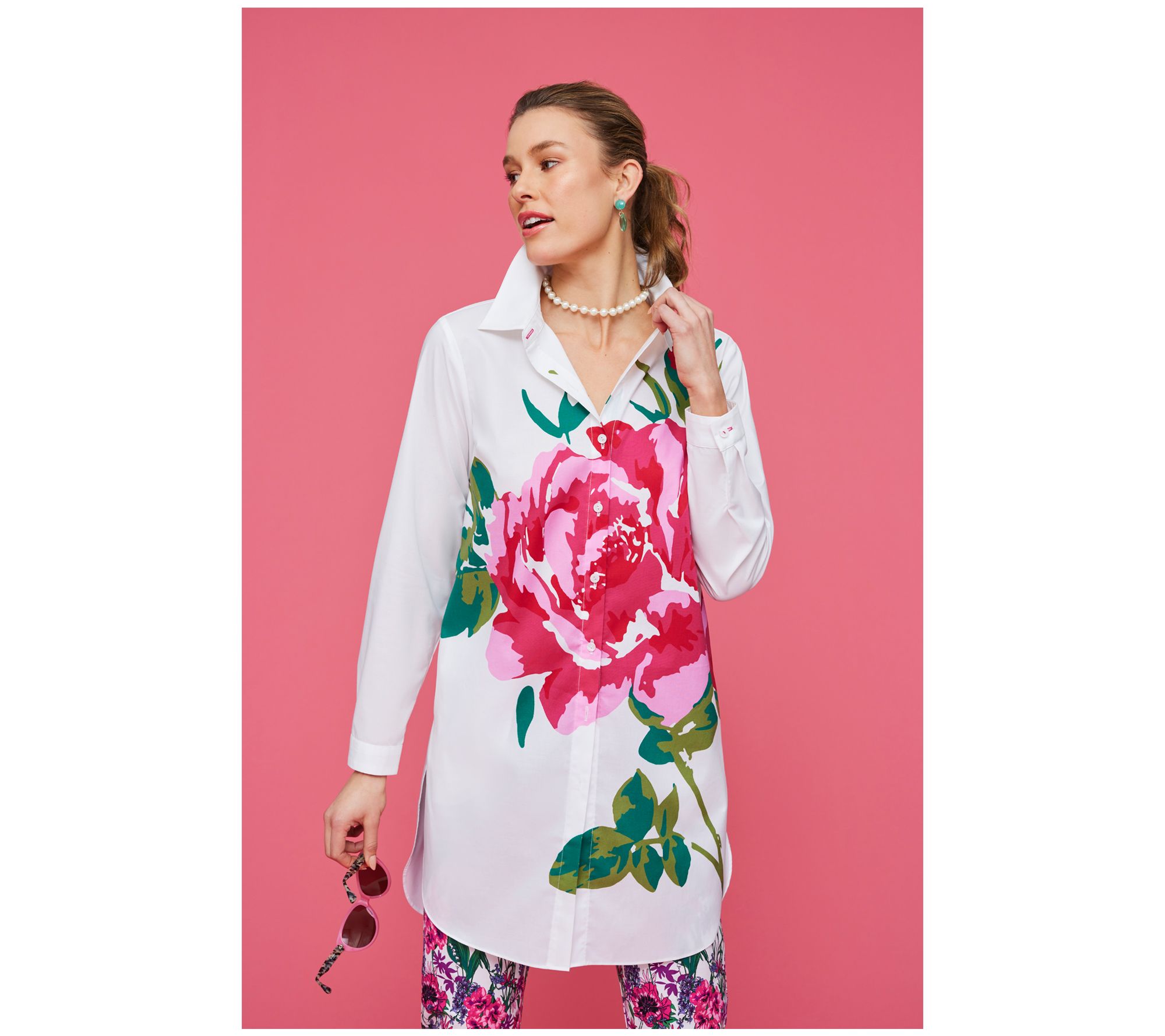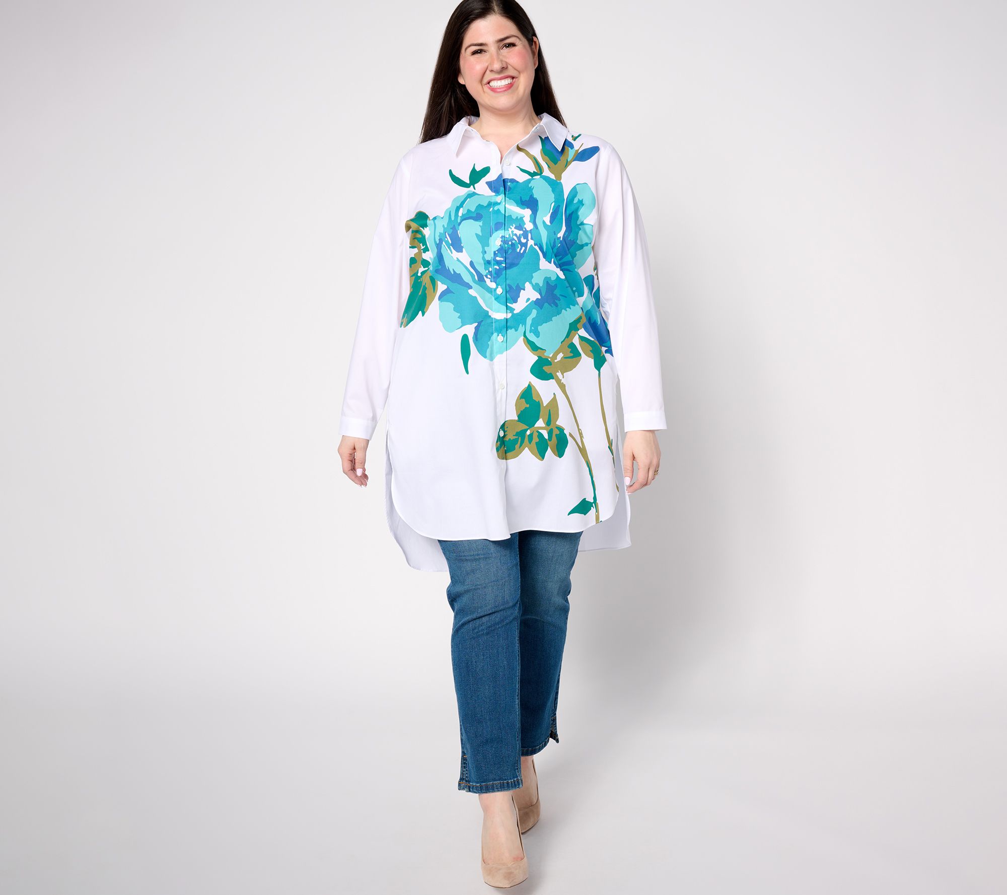 Big on blooms? (We are too!). This poplin tunic is no garden variety garment. Besides its lovable just-add-leggings length, it boldly brandishes a floral placement pattern for a big splash of color and springtime style. From Isaac Mizrahi Live!TM.