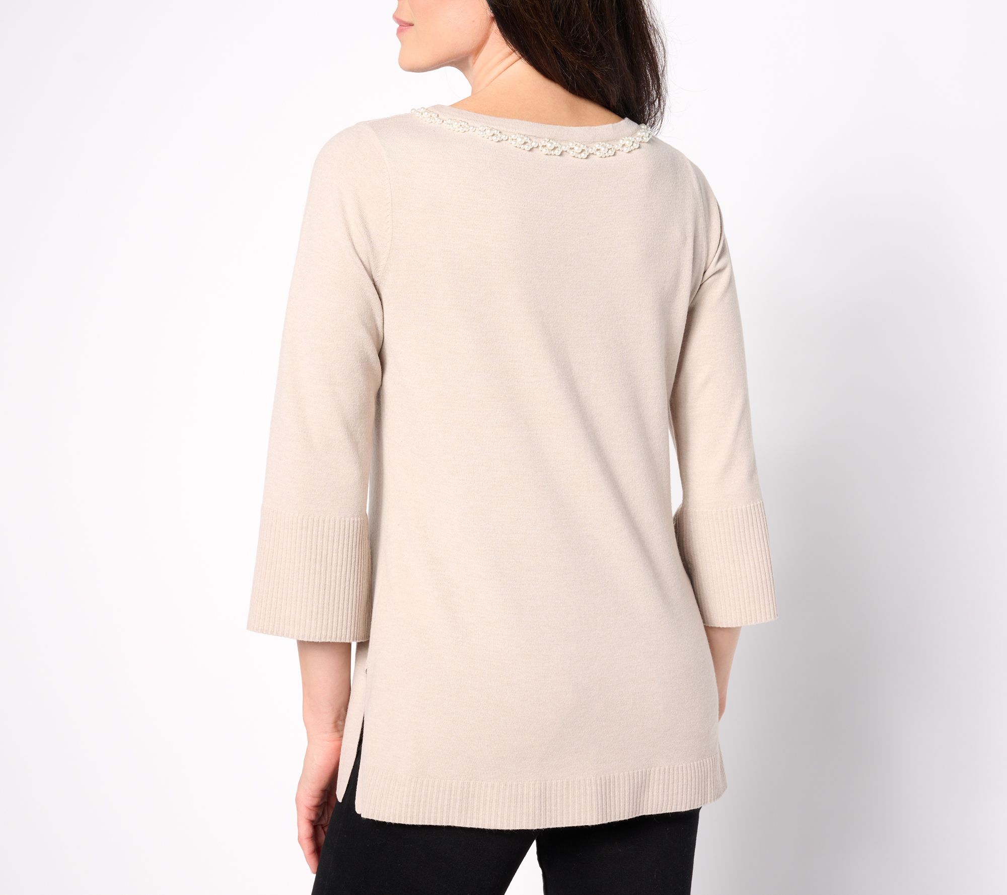 • Features: faux-pearl neckline trim, long sleeves with ribbed bell-shaped opening, ribbed hem, side slits