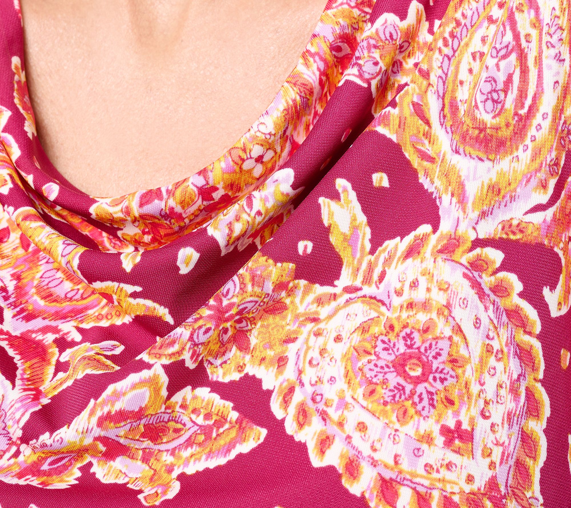 • Features: draped cowl neckline, 3/4-length sleeves, shirring details on sleeve and waist, side slit