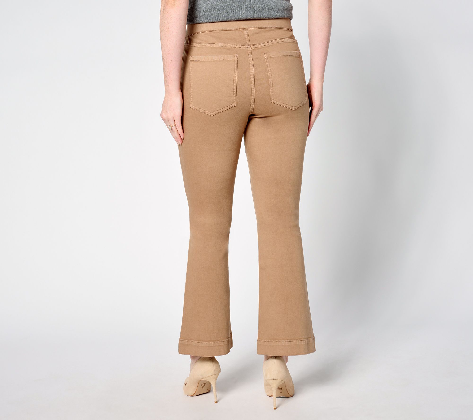 • Features: pull-on style, encased elastic waistband, five-pocket styling, built-in apron with cross-stitching for stomach smoothing, deep hem, ankle length