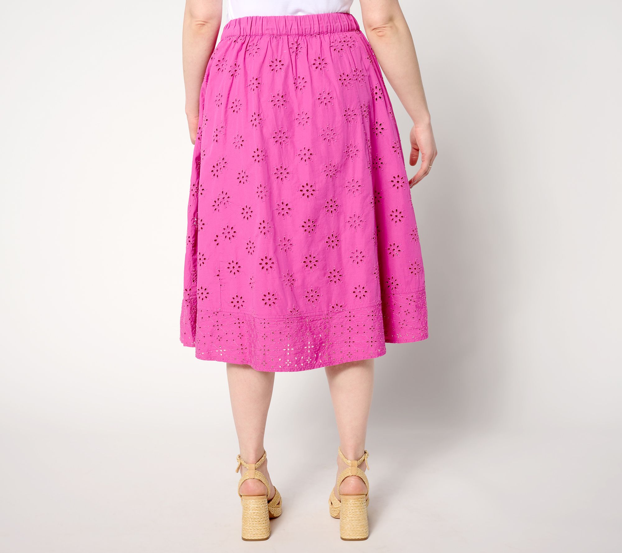 • Features: pull-on, encased elastic at back waistband, flat front waistband, princess seams, pockets, embroidered eyelet, midi length