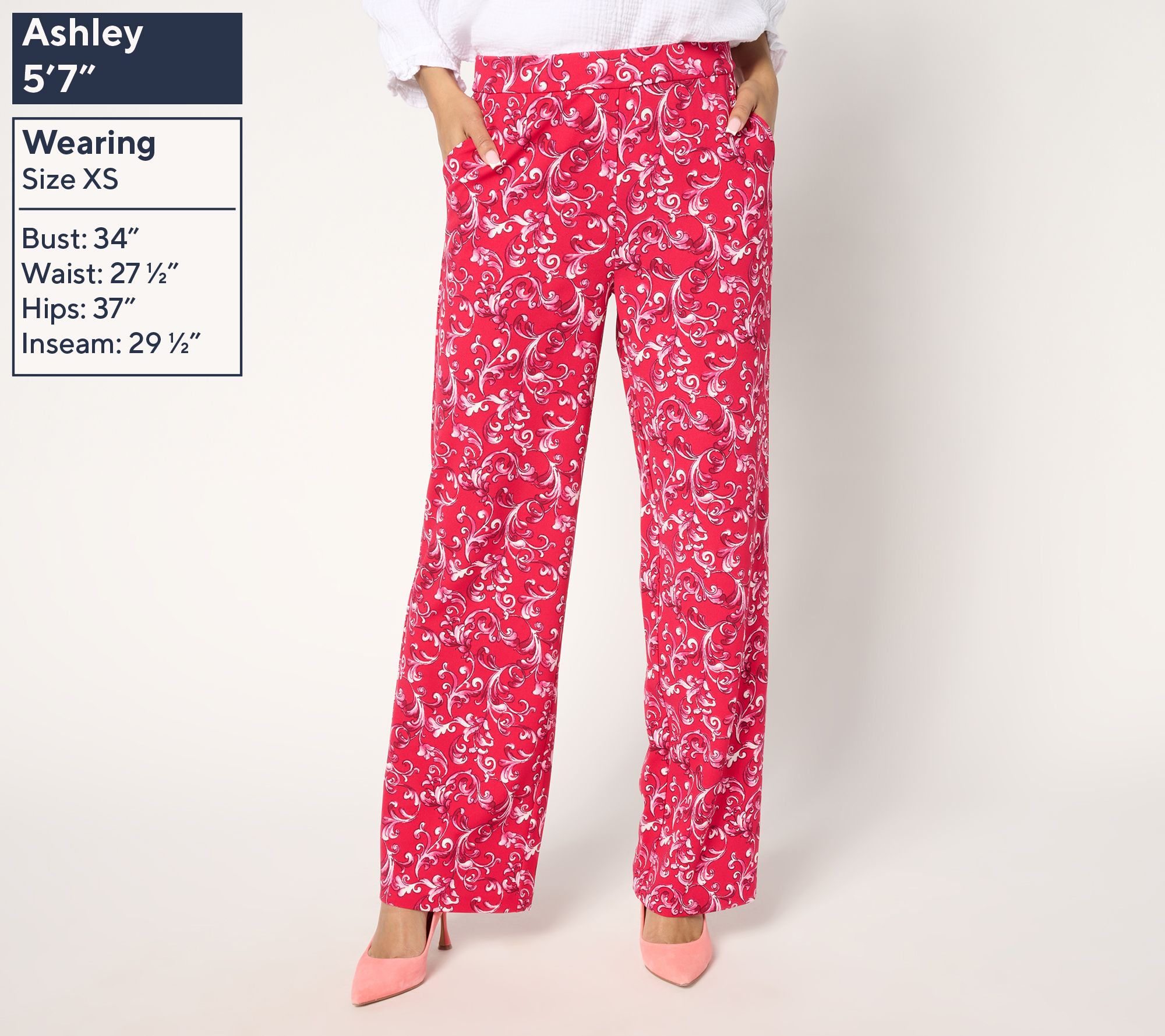 • Features: allover print, clean-finished pull-on waistband, slash pockets, blind hem finish