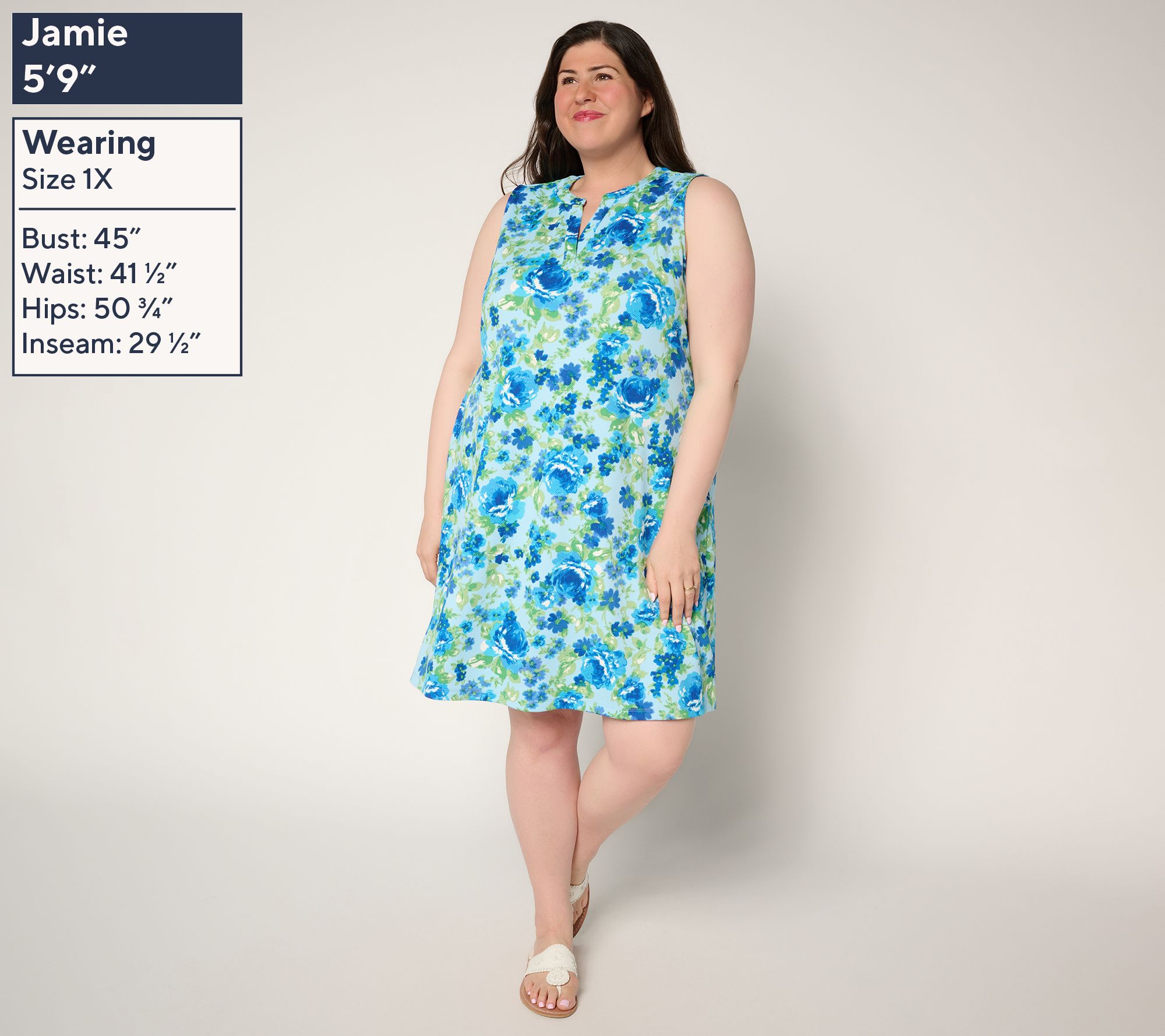 • Features: sleeveless, printed, on-seam pockets, forward shoulder, split neckline