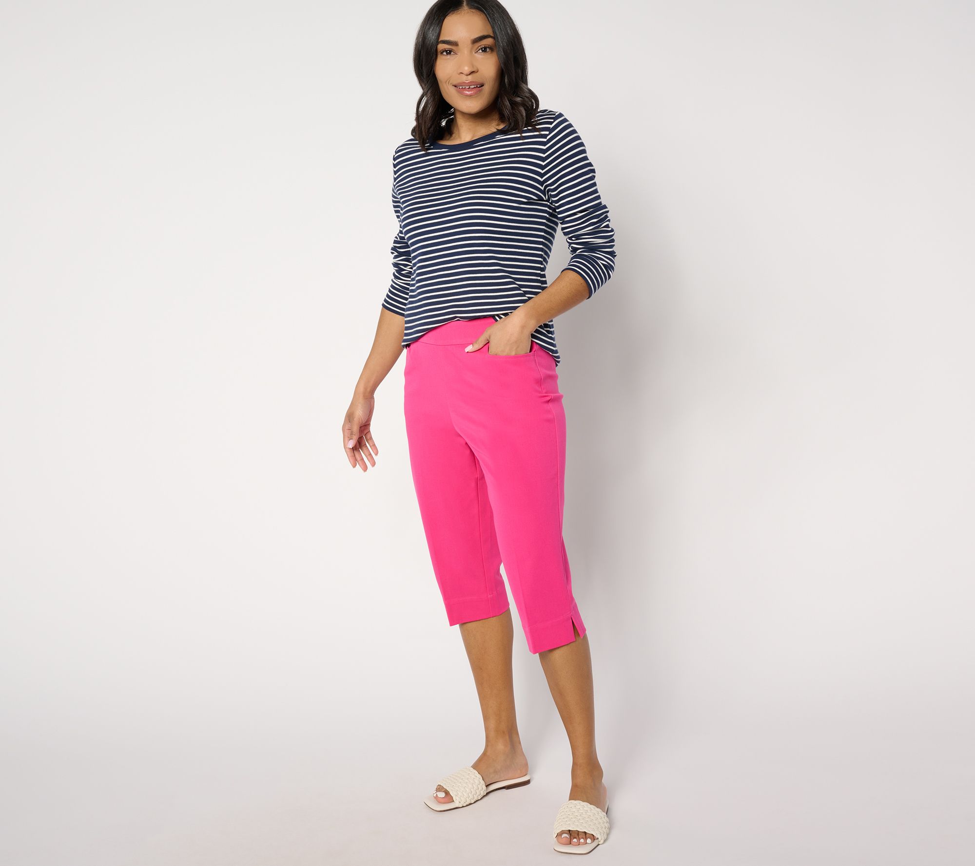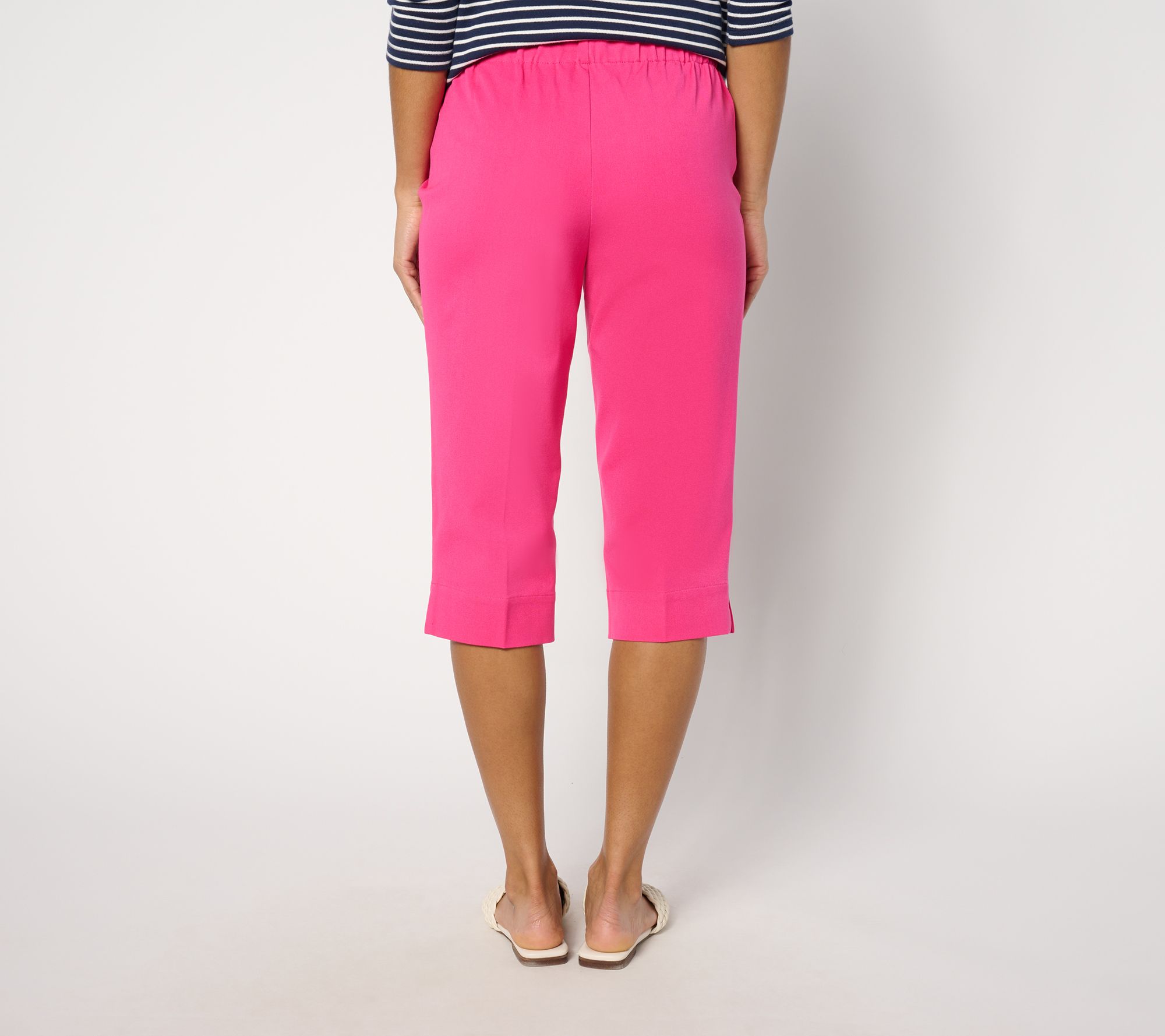 A touch of stretch and an elastic waistband make these pedal pushers a comfortable choice. The crease down the front and back is a sophisticated detail you'll love. From Isaac Mizrahi Live!TM.