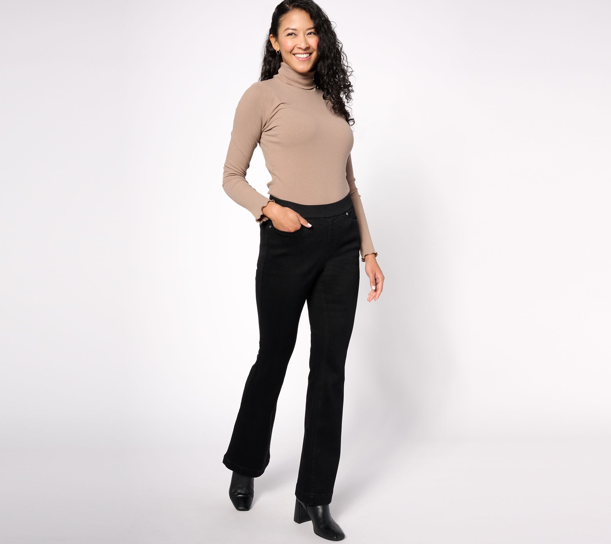 No wriggling. No shimmy-ing. No hoping the zipper won't split. These premium True Denim flared-leg jeans pull right on, so you can power through your day in sublime comfort looking poised and polished. Welcome to your worry-free wardrobe. From Isaac Mizrahi Live!TM.