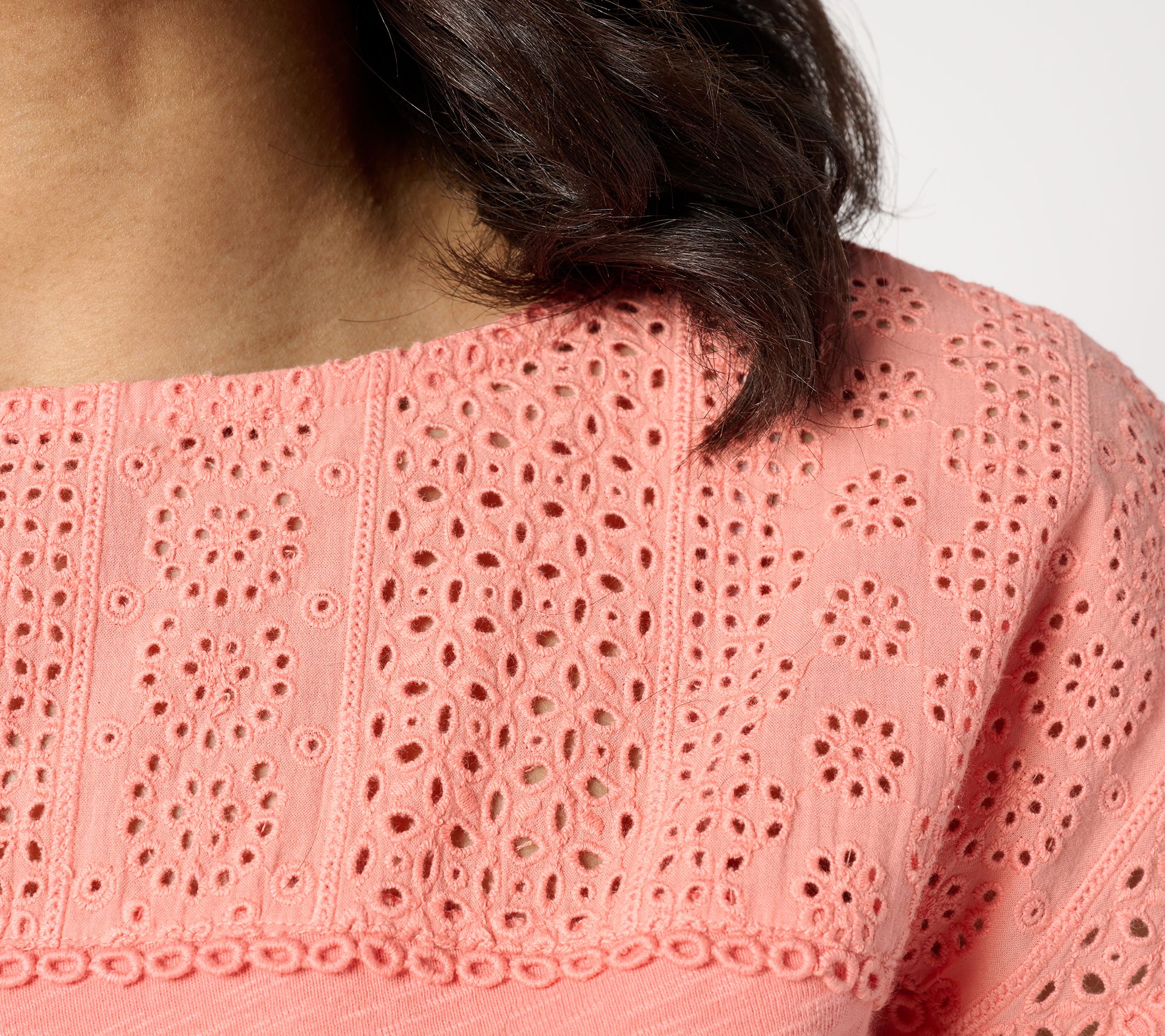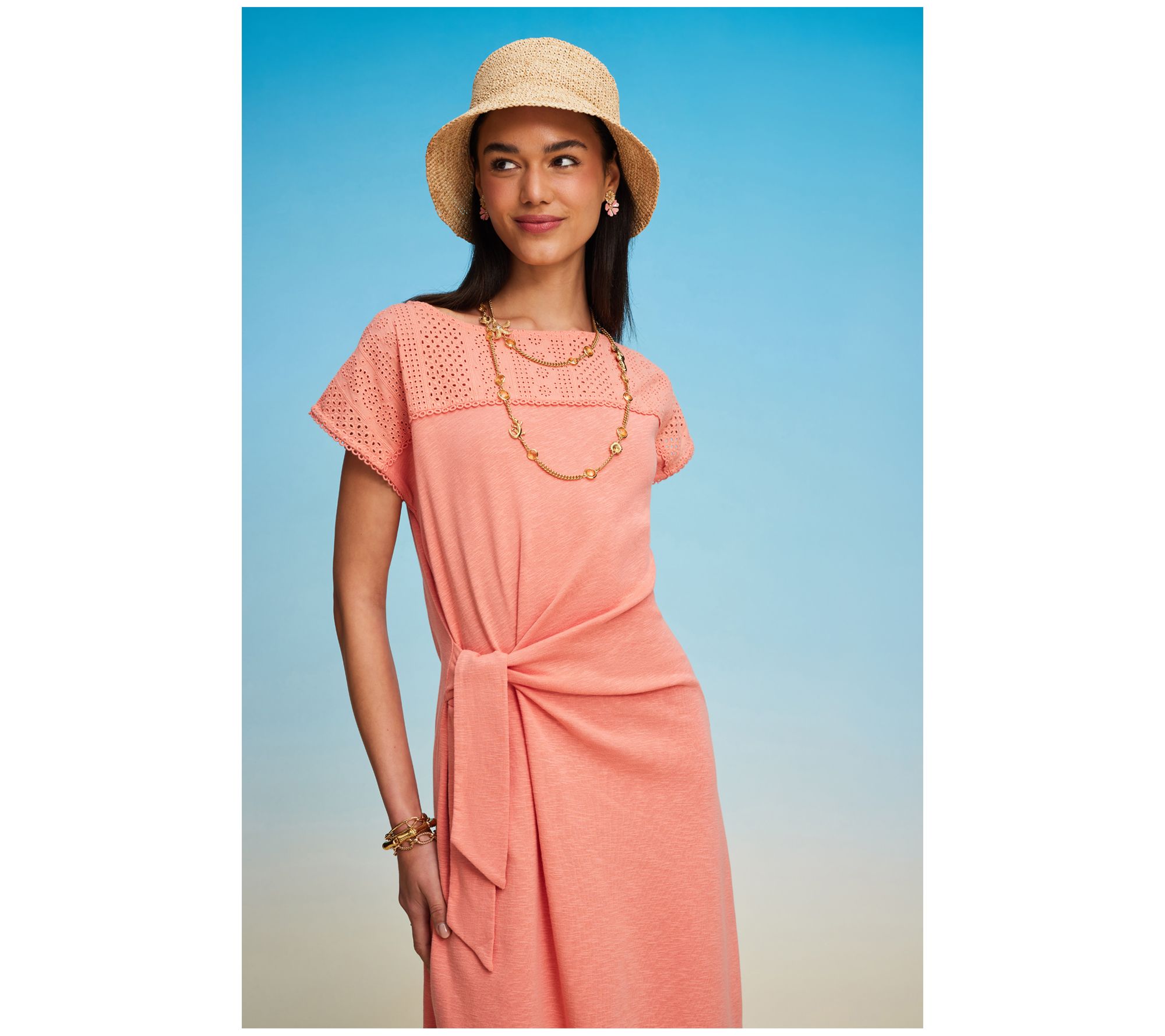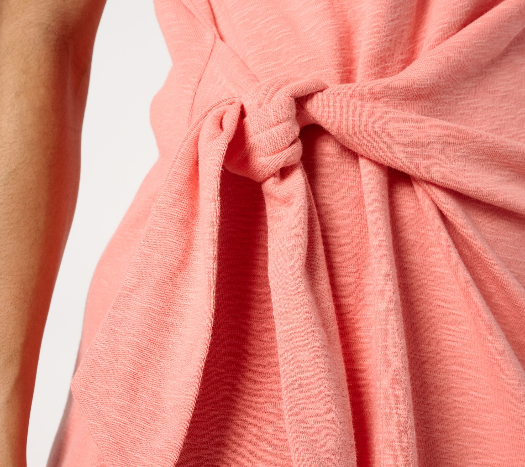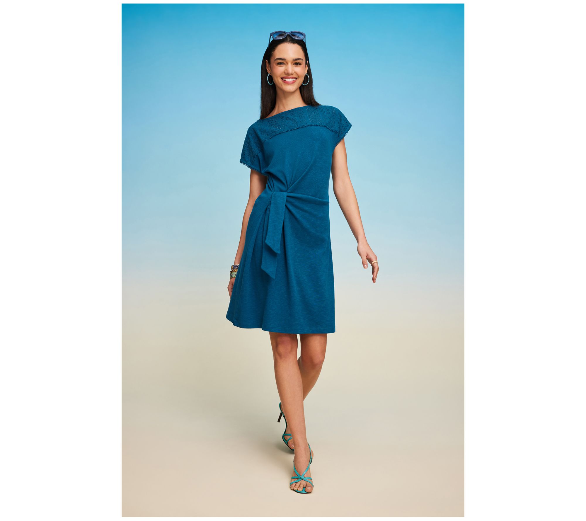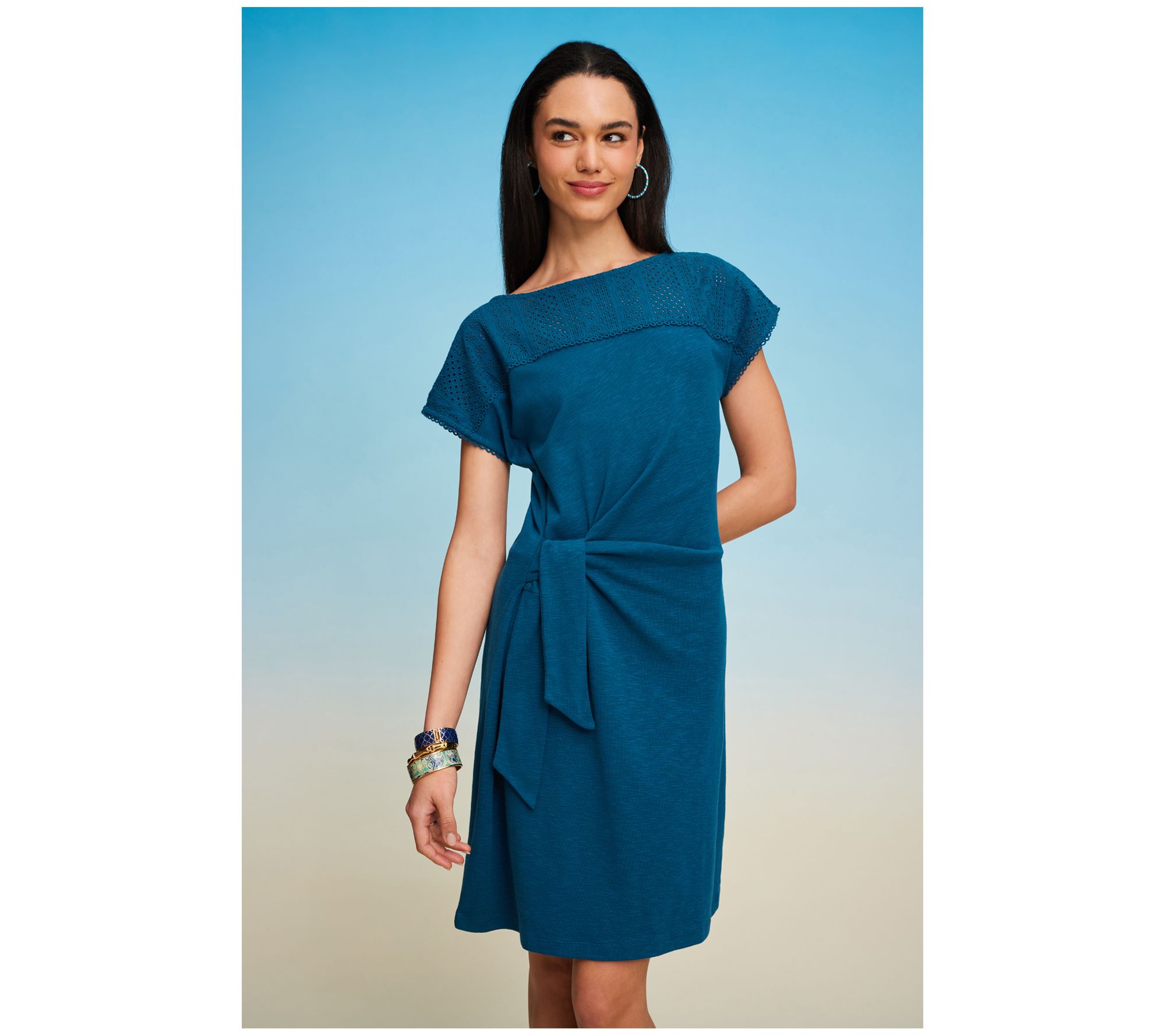 • Features: boatneck, extended cap sleeves, front yoke with visible loop trims, functional asymmetrical side tie at right side, straight hemline