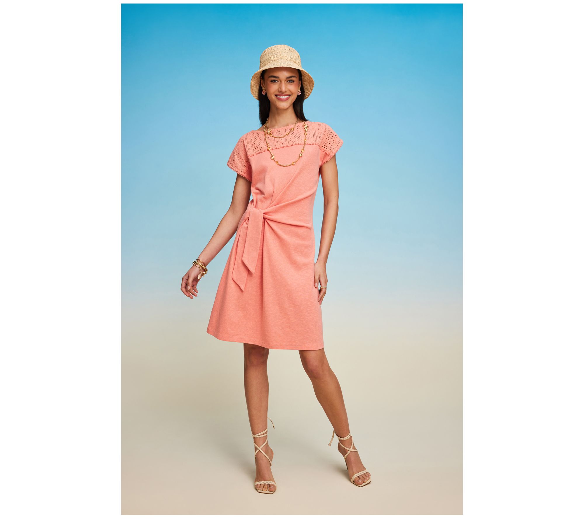 Dress to impress in this fashion-forward frock that features a cutout detail along the neck and shoulders and a functional side tie that cinches the waist to create a flattering and feminine silhouette. From Isaac Mizrahi Live!TM.