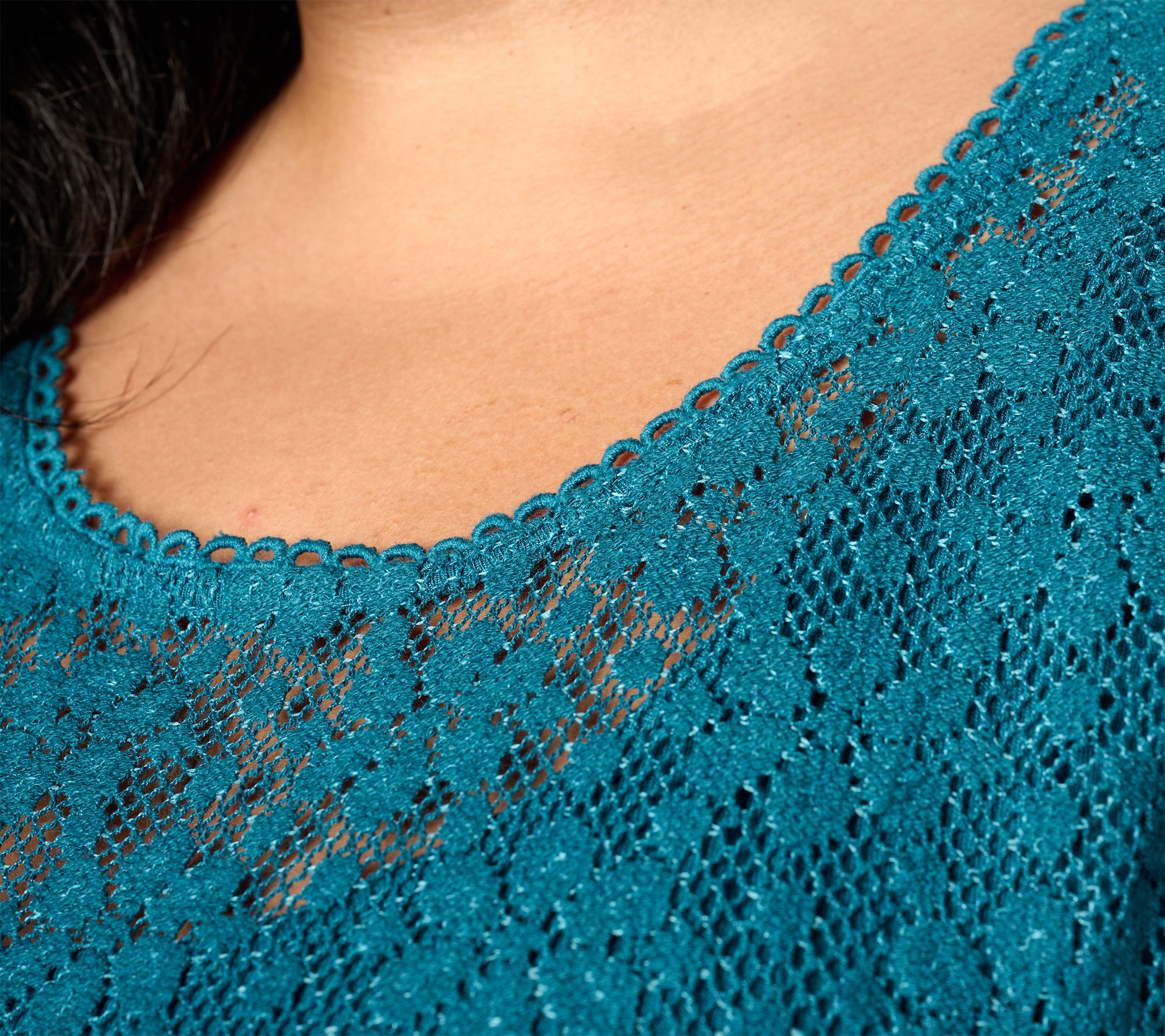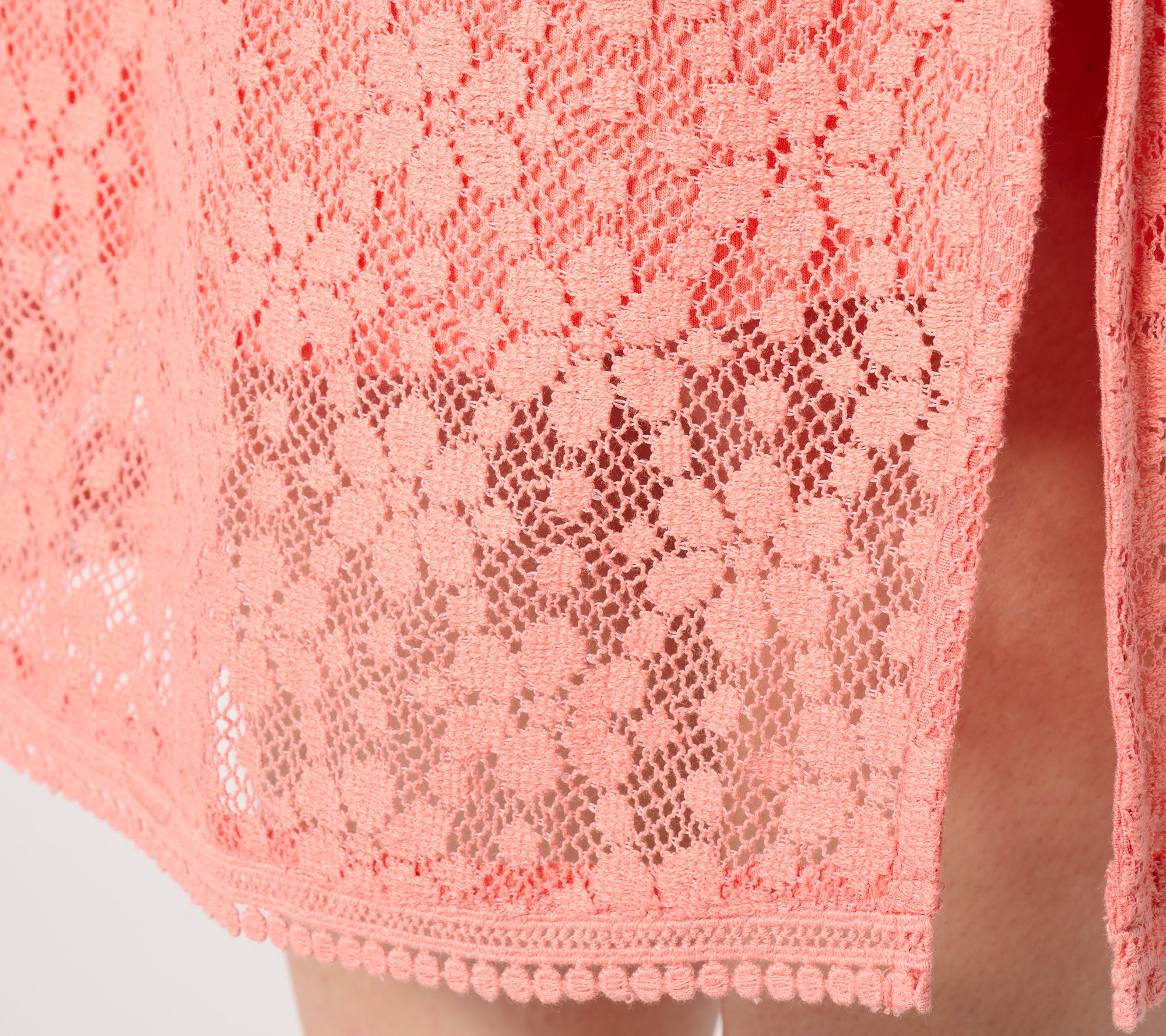 • Features: round neckline, crochet lace shell, jersey lining, sleeveless, side slits, midi length