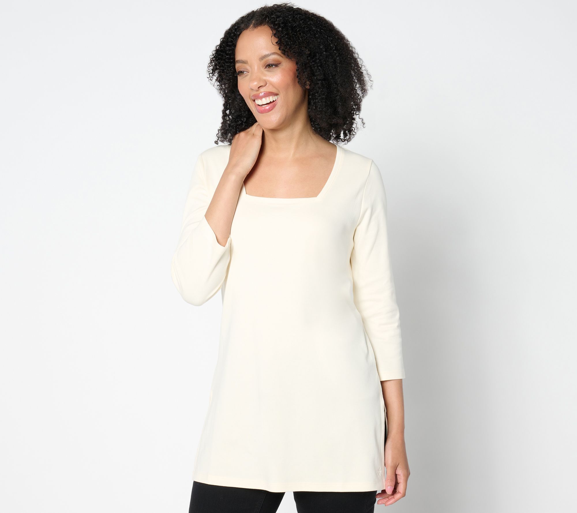 When it's time for a basics upgrade, this pima cotton tunic makes a smart selection. The longer length provides comfortable coverage, while the square neckline creates an elegant option to showoff your favorite statement necklaces. From Isaac Mizrahi LiveTM.