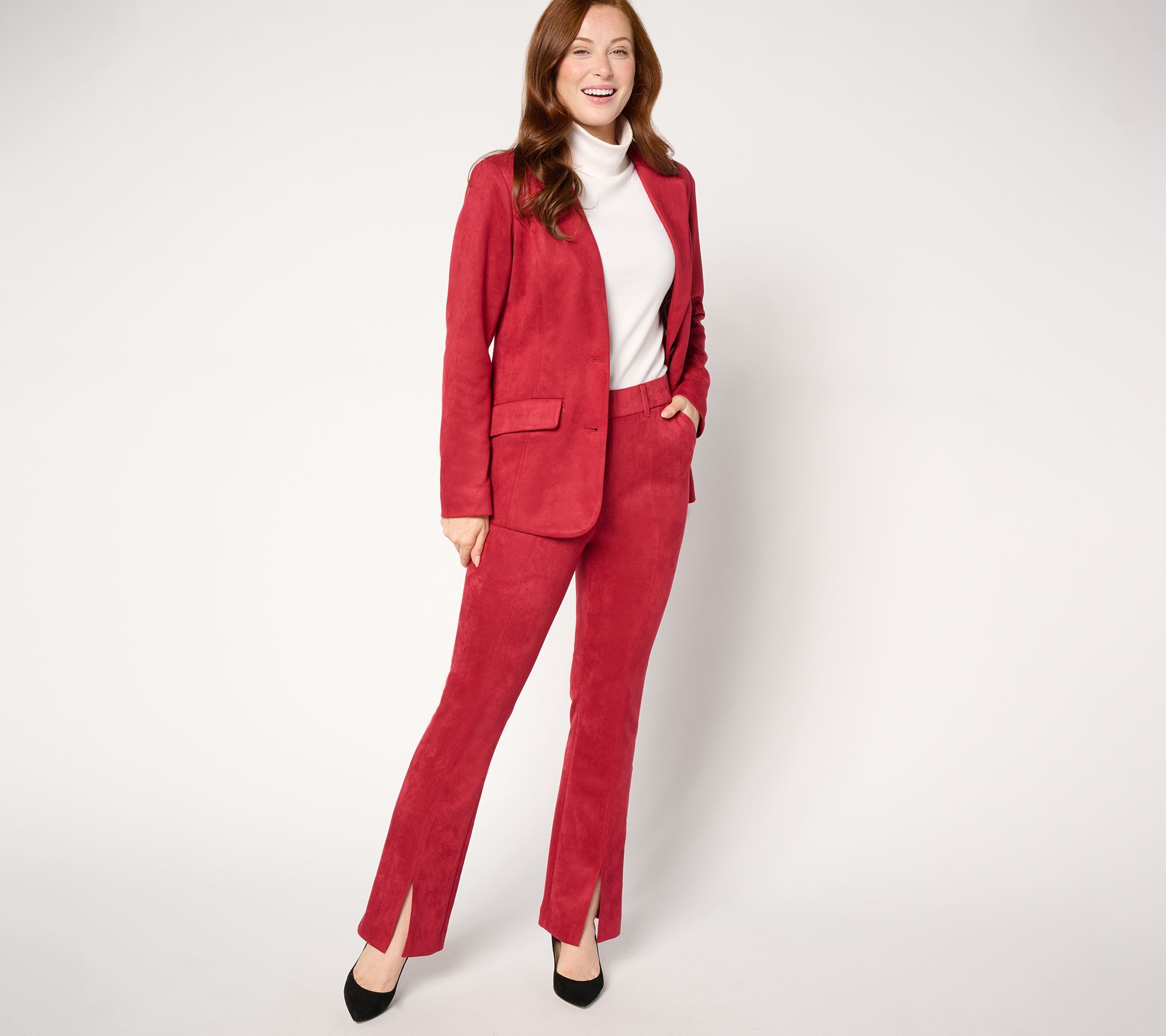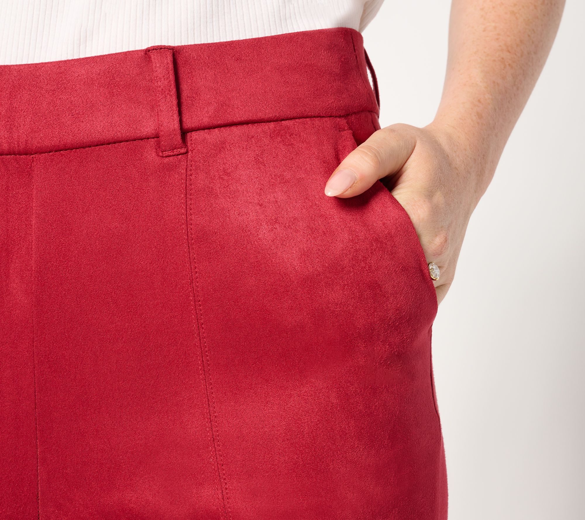 Day in the office or a night on the town? Whatever's on the agenda, you'll look fresh and feel fab in these stretch faux suede pants from Isaac. Scored some new shoes? Your latest obsession will def be on display with the front slit at the leg bottom providing ample opportunity to spotlight your fave footwear. From Isaac Mizrahi Live!TM.