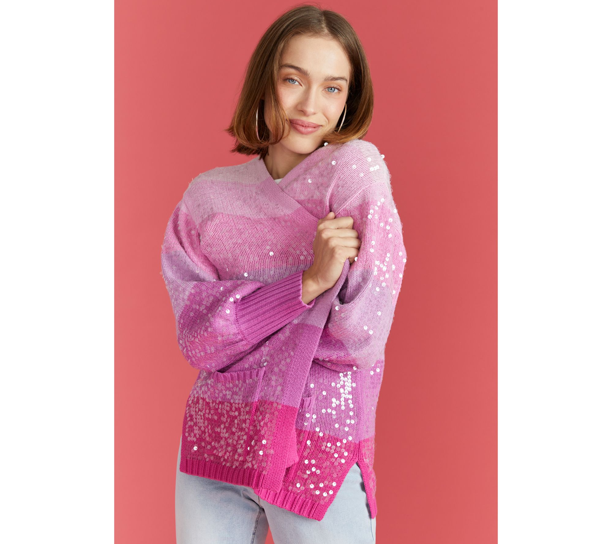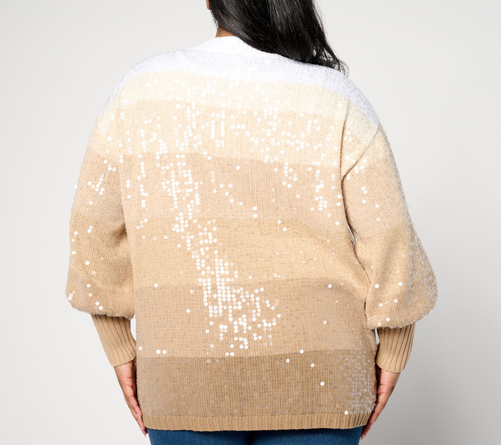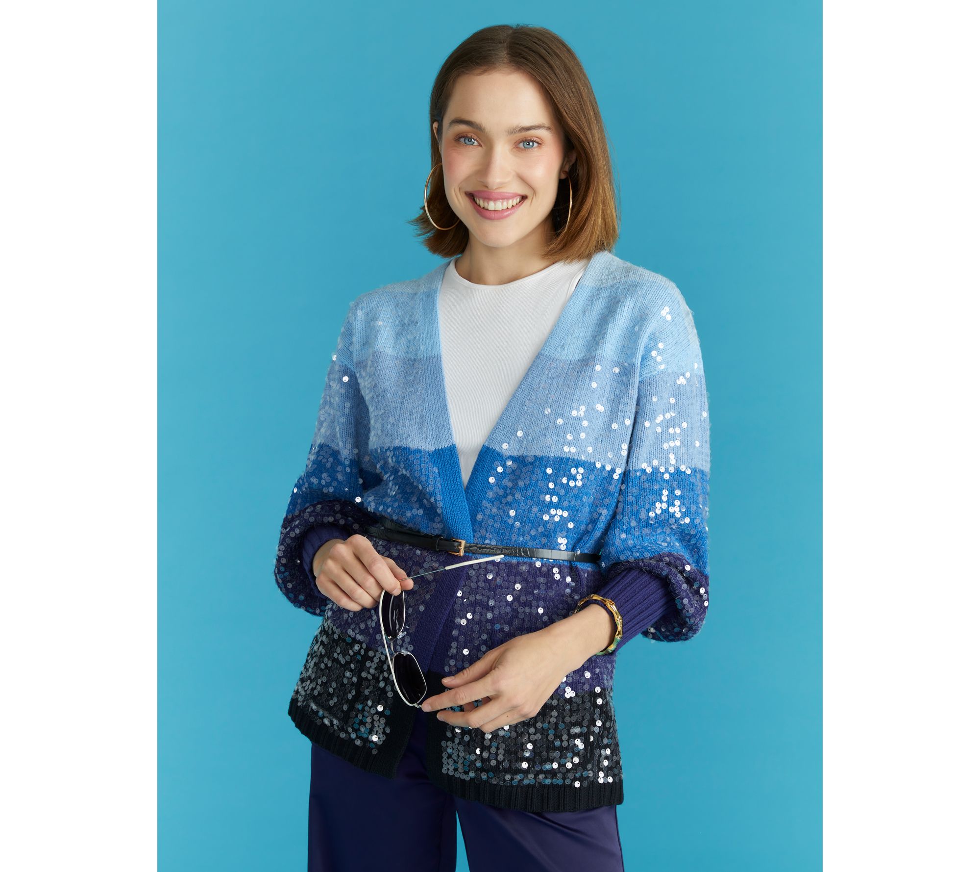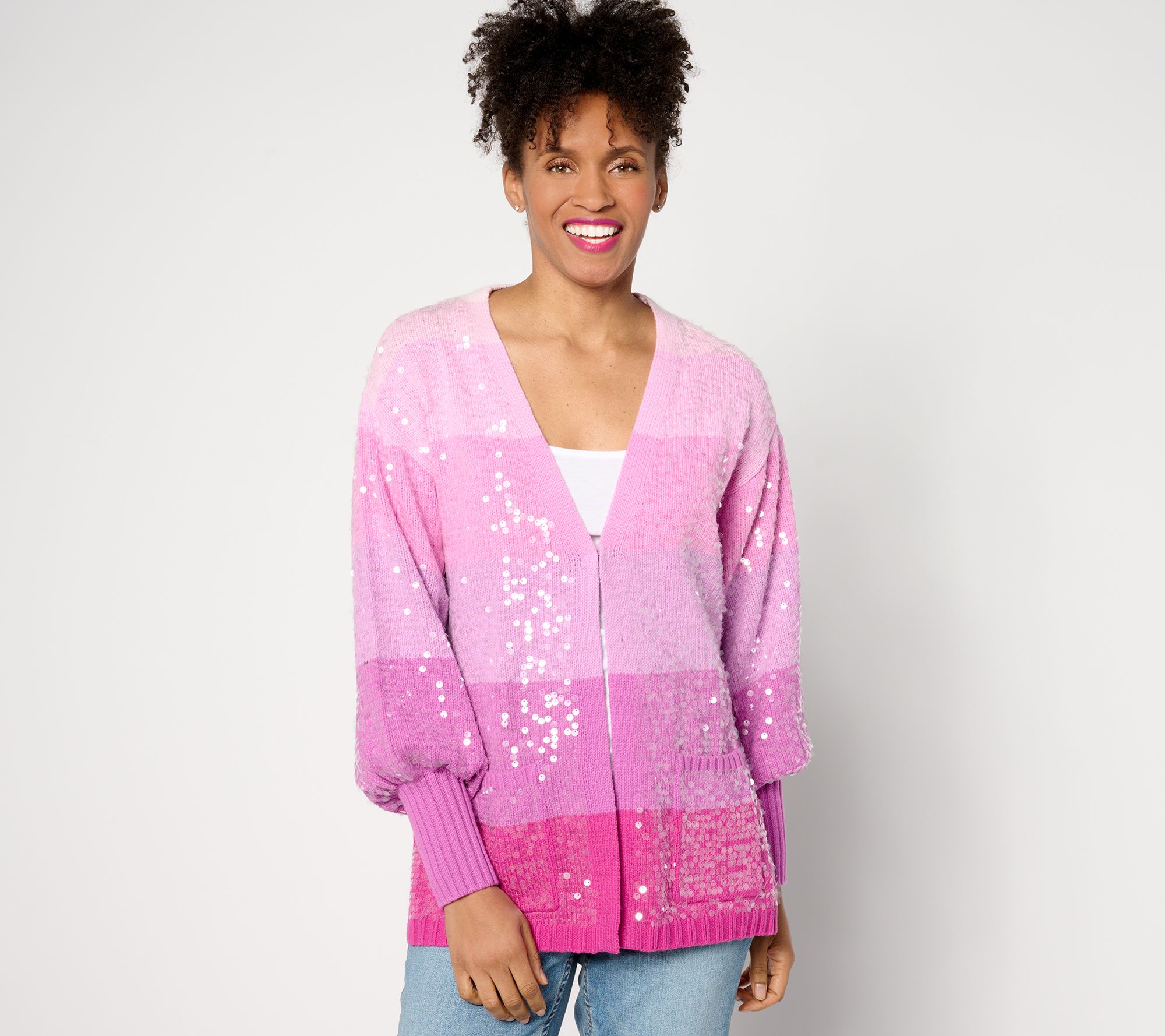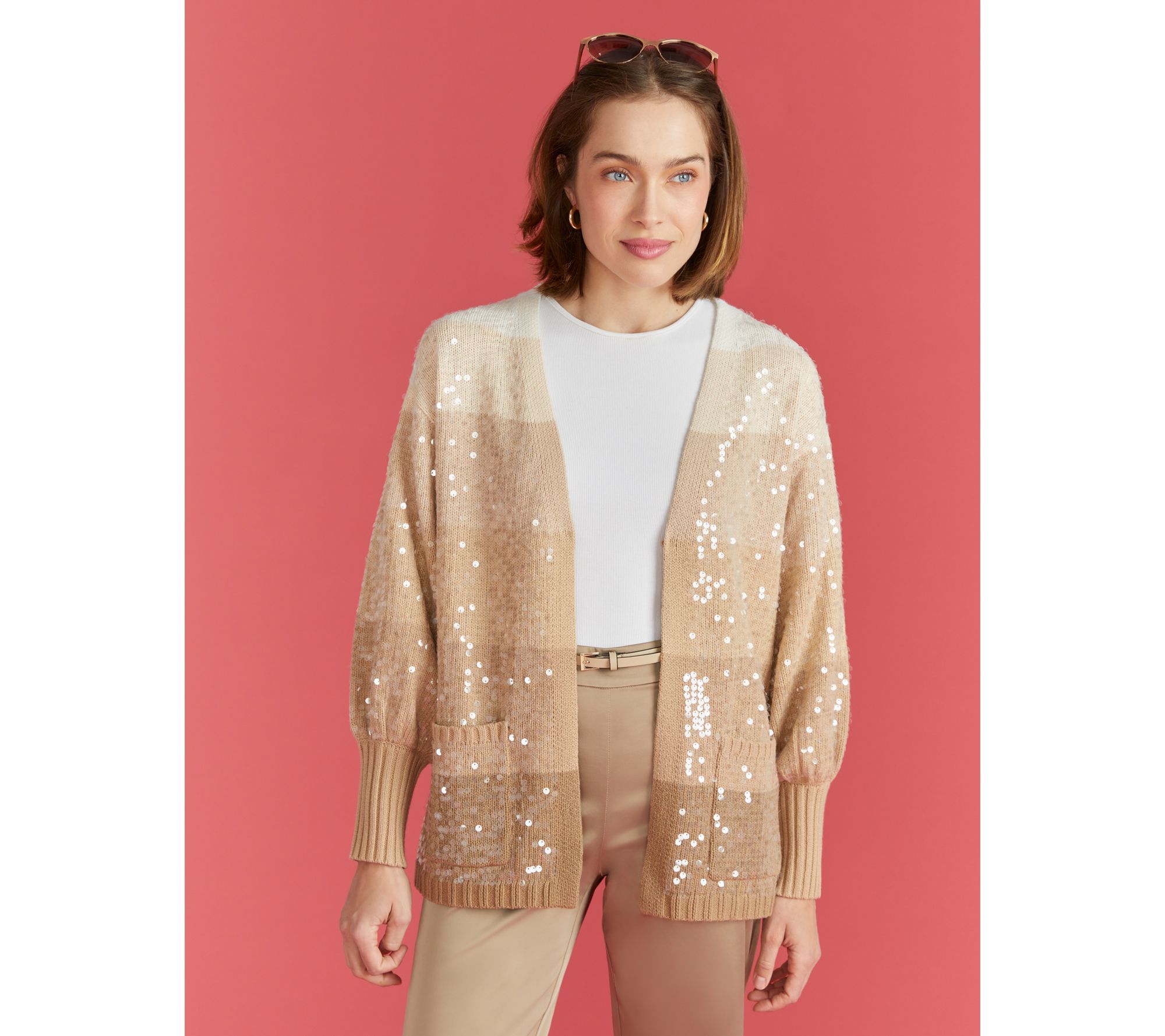 It's your time to shine -- in any situation -- with Isaac's multistripe cardigan. With shimmery paillettes dotting the entire landscape, this subtly sparkly pick catches the light just right and is just as comfortable glowing up your tee and jeans as it is your LBD (little black dress). From Isaac Mizrahi Live!TM.