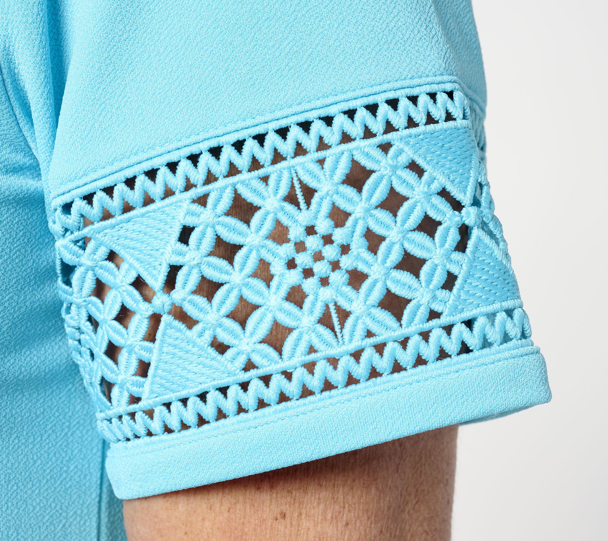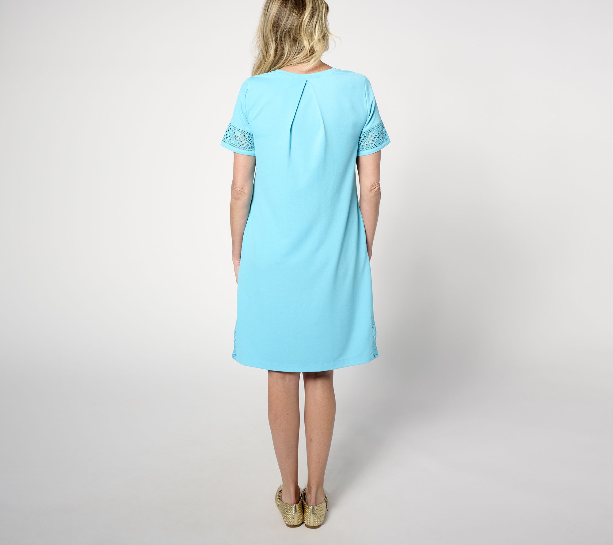 • Features: solid, lace trim on short sleeves, side slit, pockets, round neck, inverted box pleat at center back
