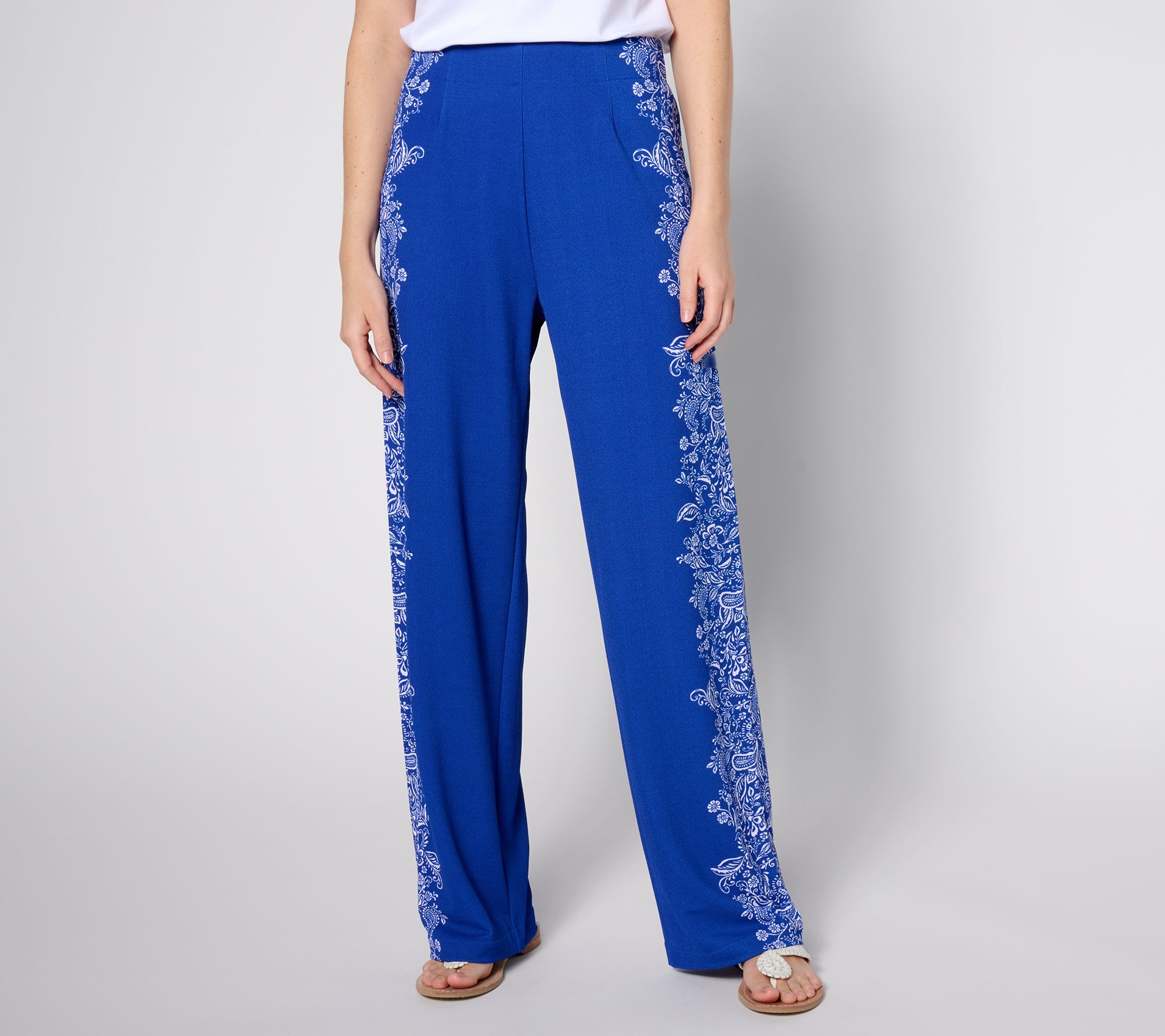 We're particularly fond of these pull-on pebble knit pants for pairing with crisp white shirts or tonal tops -- and letting the paisley placement print absorb all the well-deserved attention. From Isaac Mizrahi Live!TM.