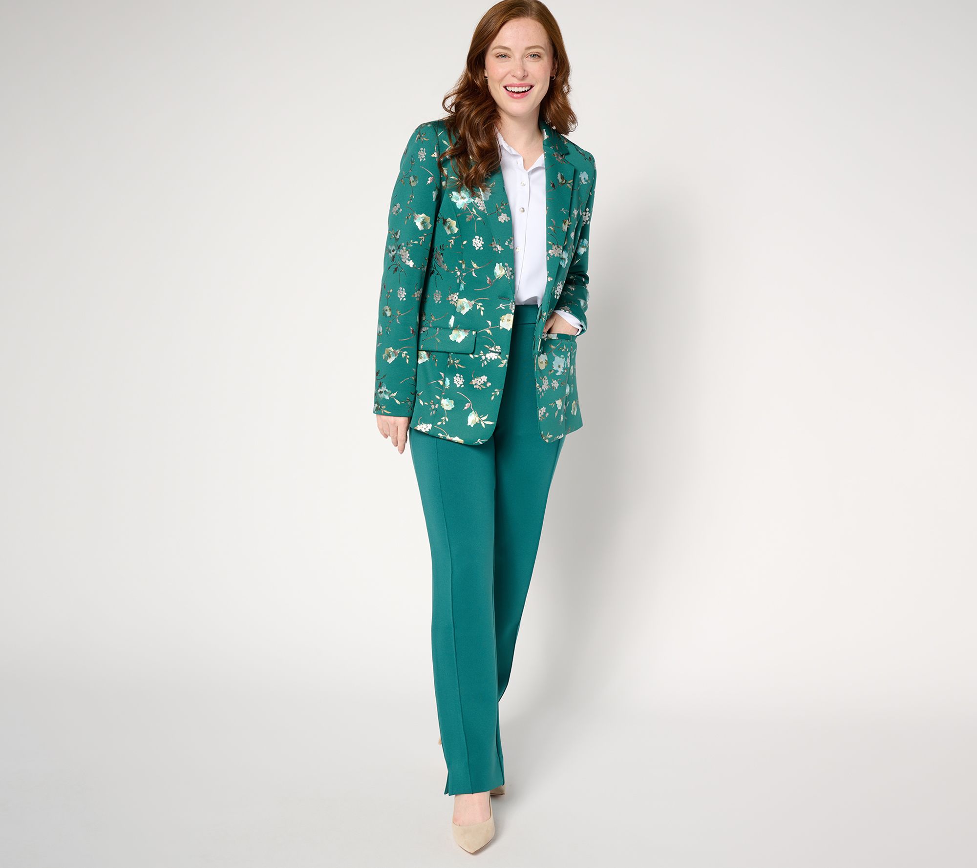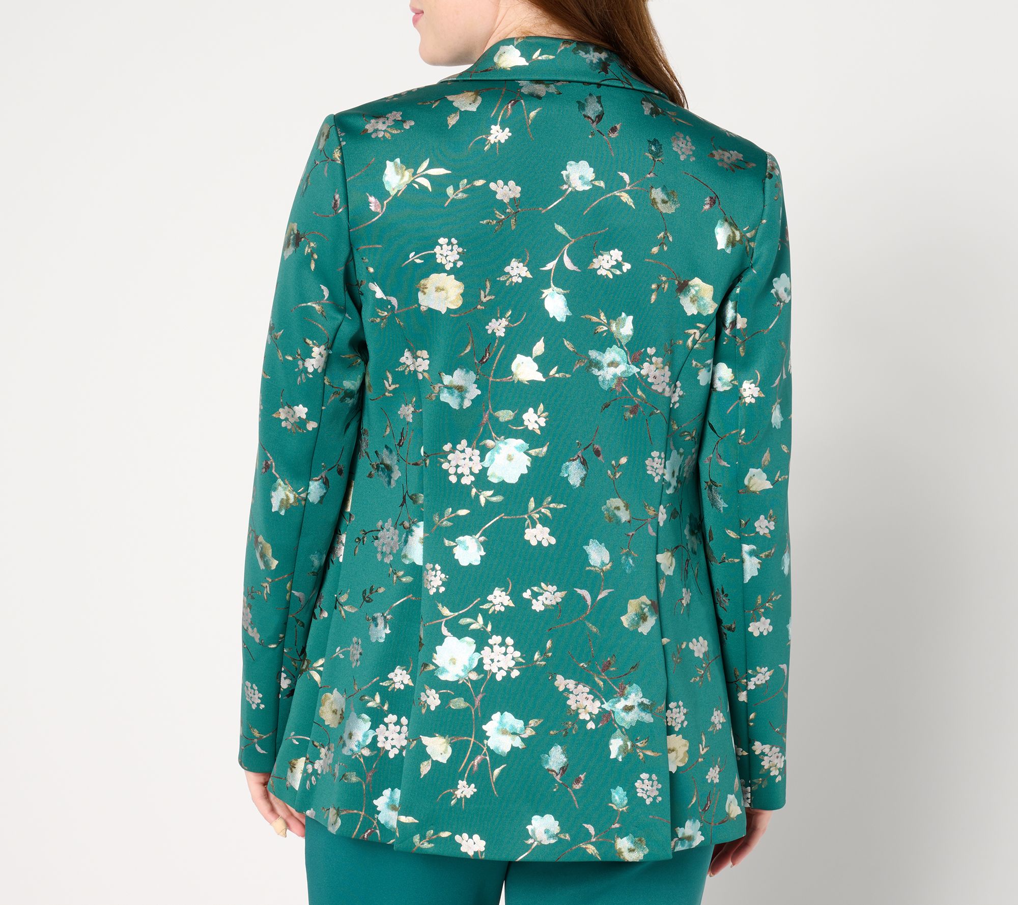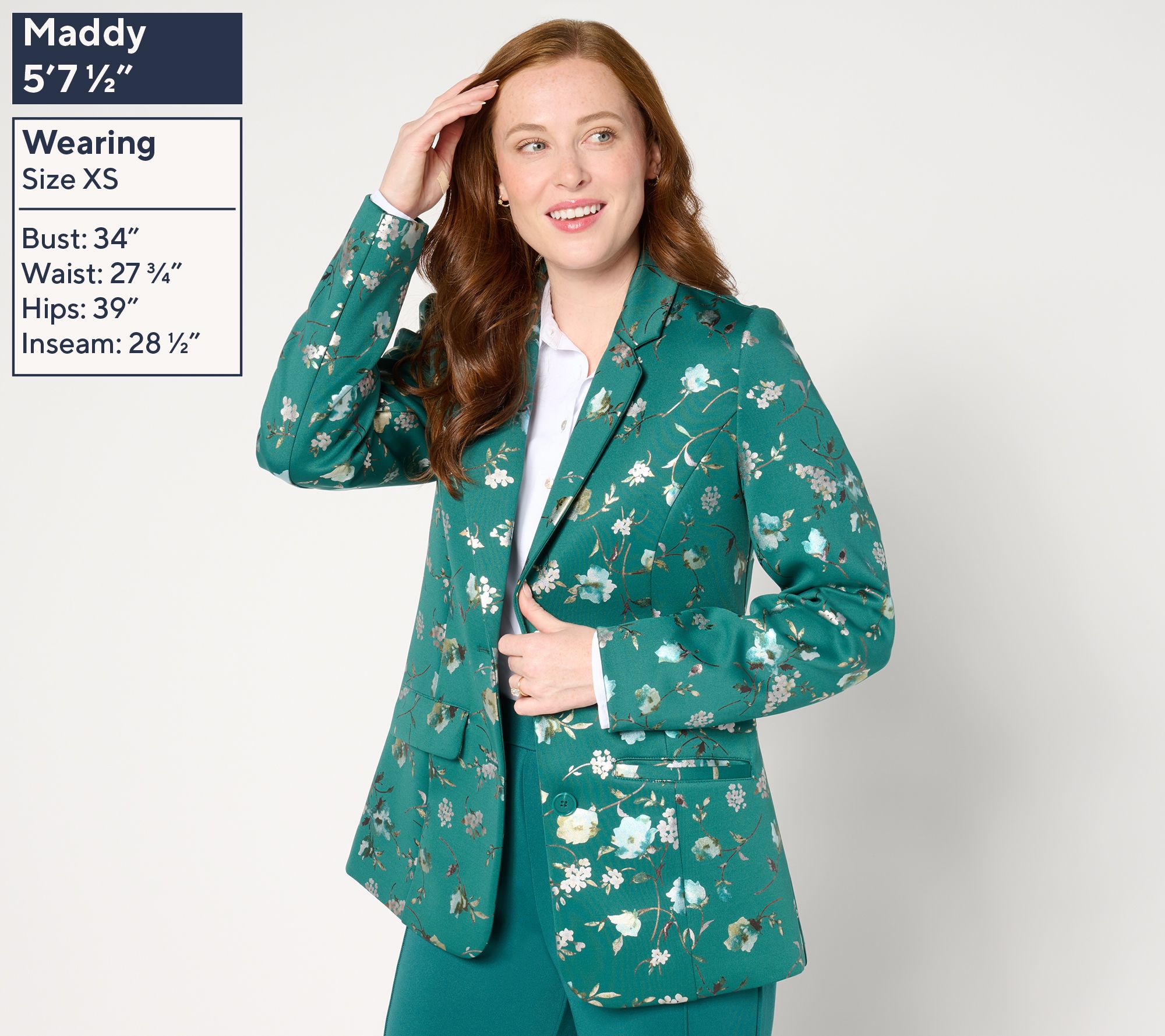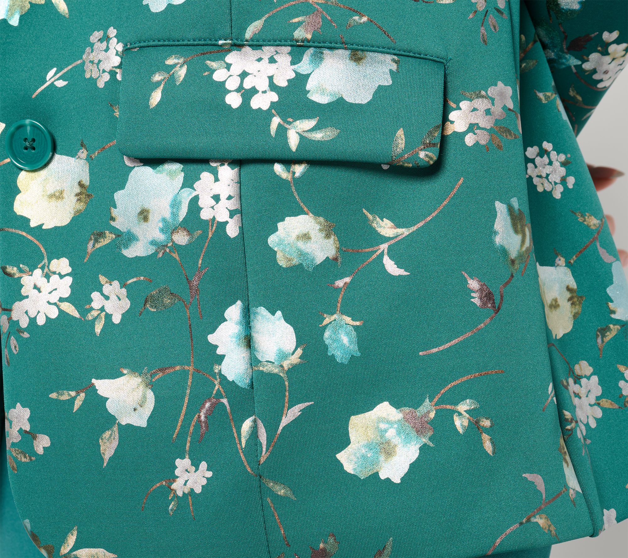 • Features: single-breasted style, two-button closure, floral print, angled welt pockets with flaps