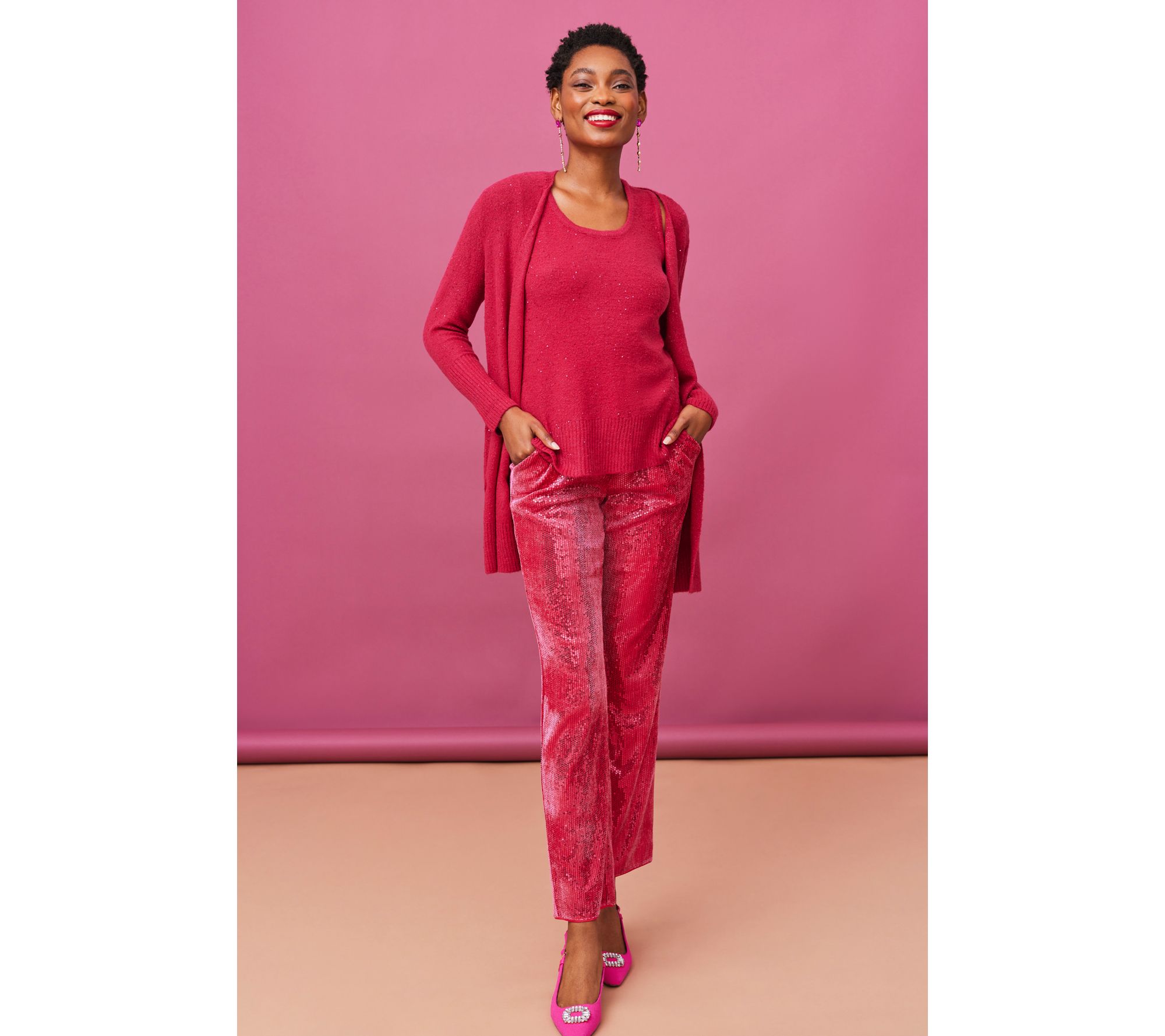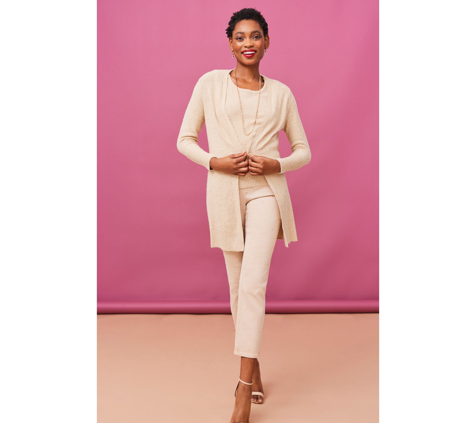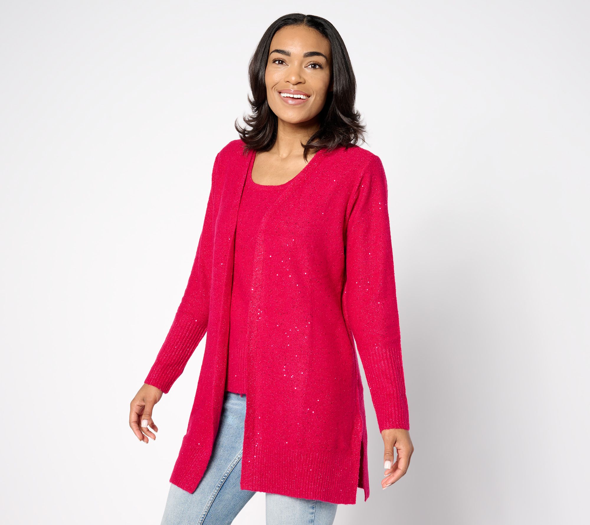 Party-ready? You bet! This sequin-yarn cardigan is kissed with sparkle and shine and so ready to celebrate. It slides as easily over a satin slip dress with strappy heels as it does a sleeveless turtleneck, straight-leg jeans (or faux leather leggings!), and suede boots. So don't save it just for an occasion that calls for something special -- wear it when you want to feel special. From Isaac Mizrahi Live!TM.