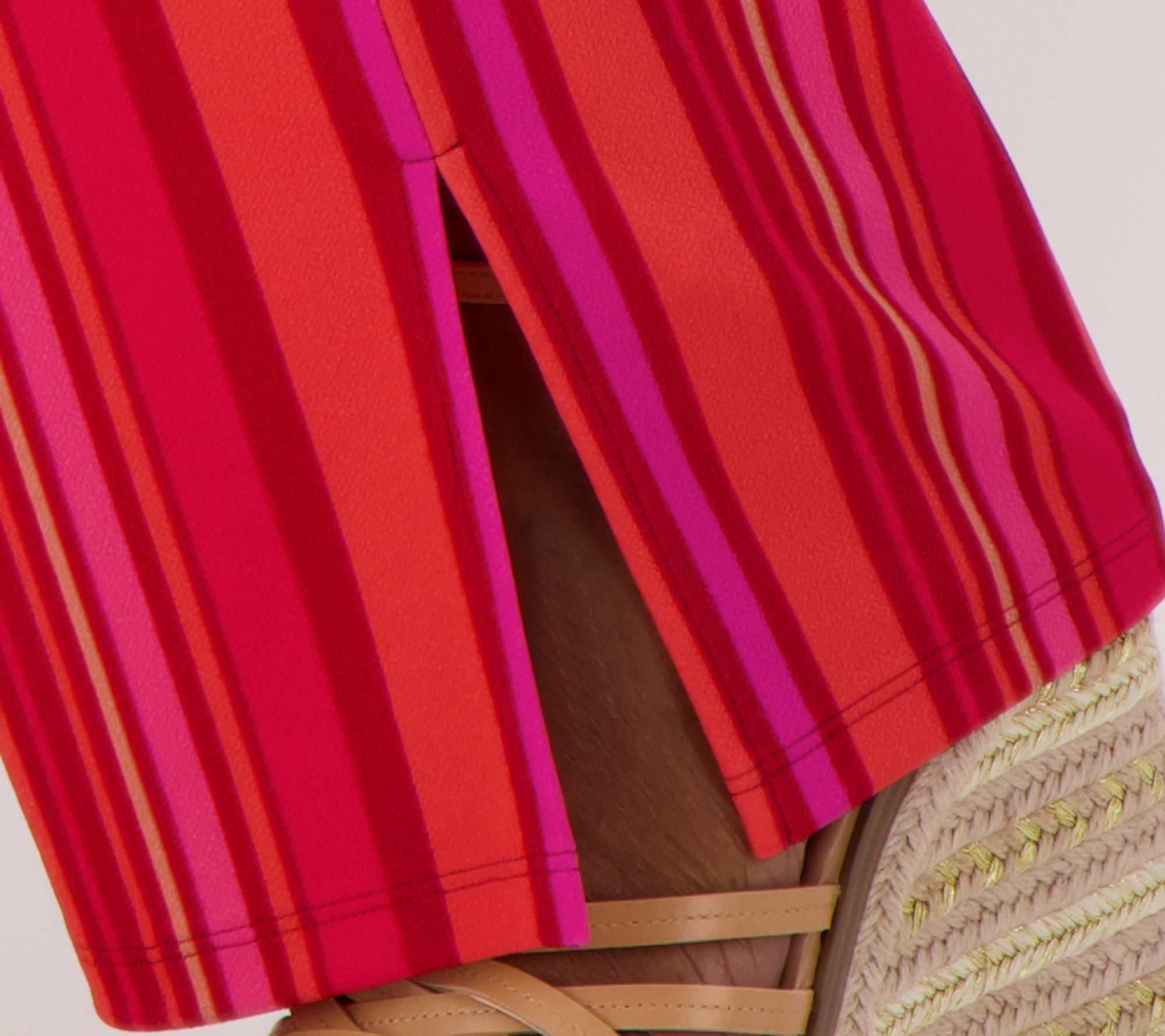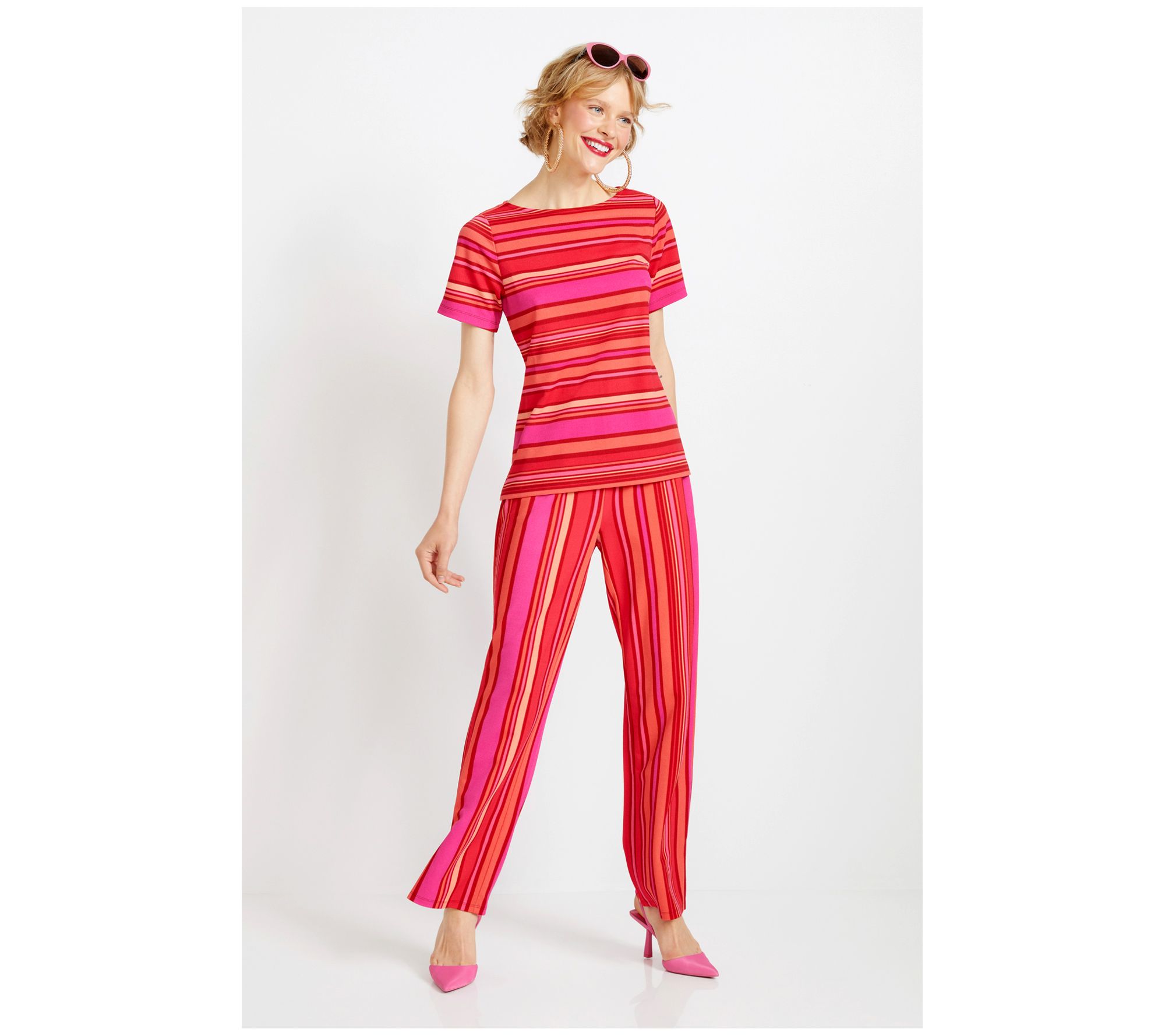 A vibrant striped pattern and a flattering wide-leg silhouette gives these pants their captivating charm. Pair them with a sleeveless blouse and wedge sandals and you'll be sure to turn heads wherever you go. From Isaac Mizrahi Live!TM.