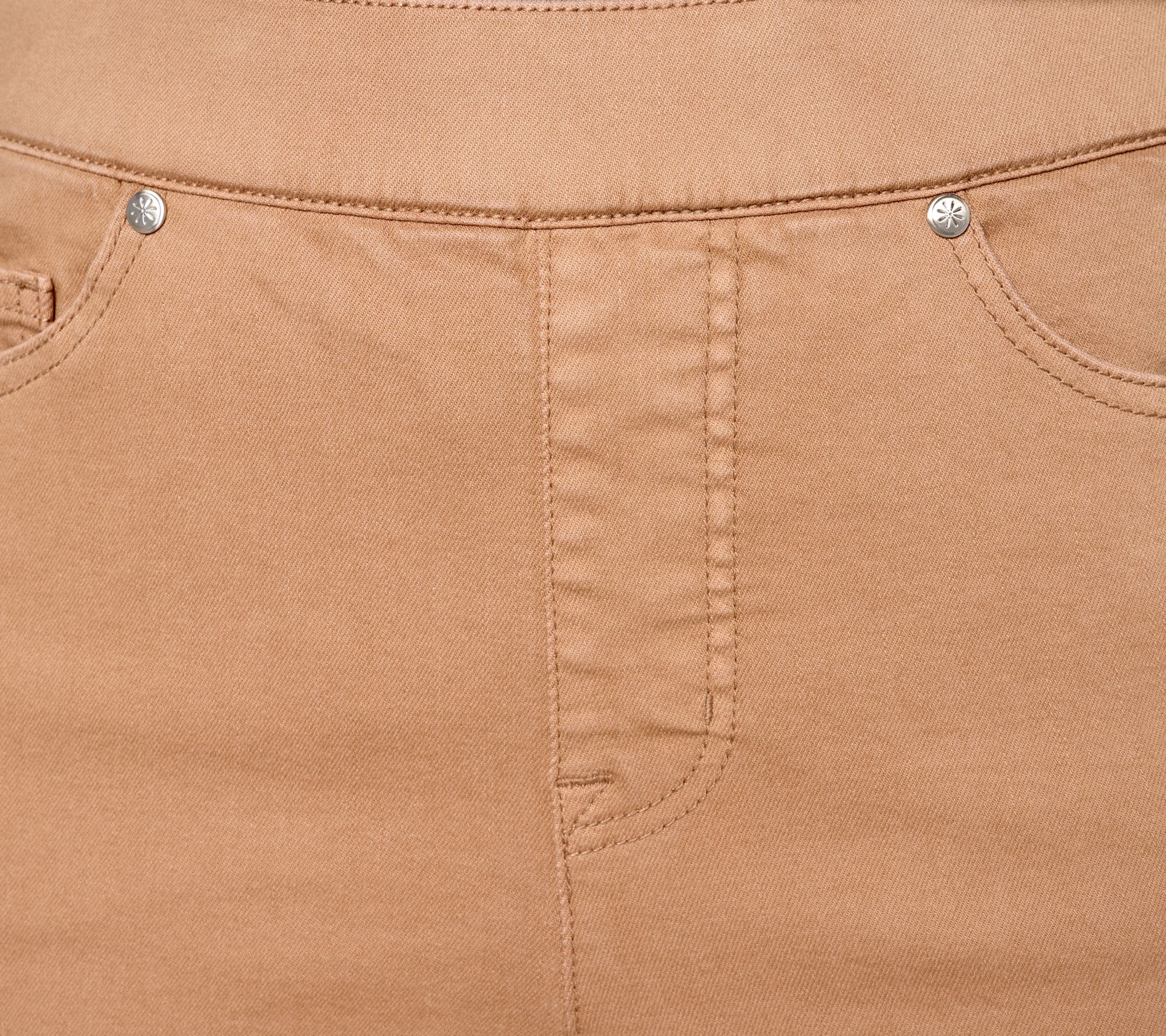 • Features: pull-on style, encased elastic waistband, five-pocket styling, built-in apron with cross-stitching for stomach smoothing, deep hem, ankle length